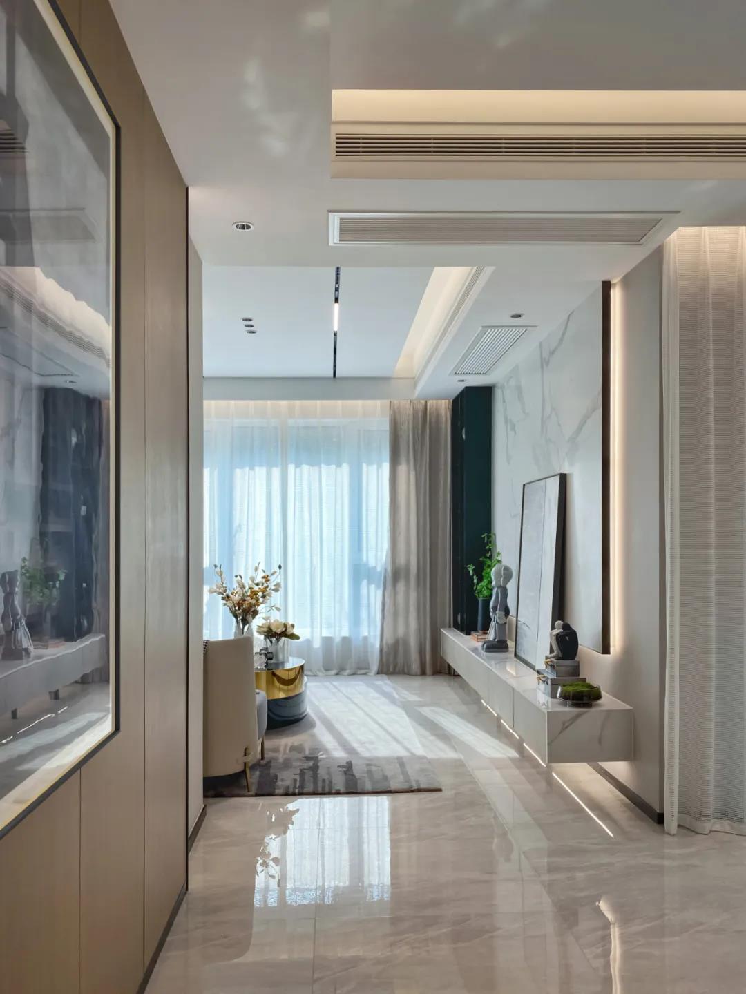设计依托原有的现代极简风硬装基础,融入简约柔和的色彩,精致耐用的黄铜配饰和边角,打造轻奢和温馨兼具的生活理想状态。