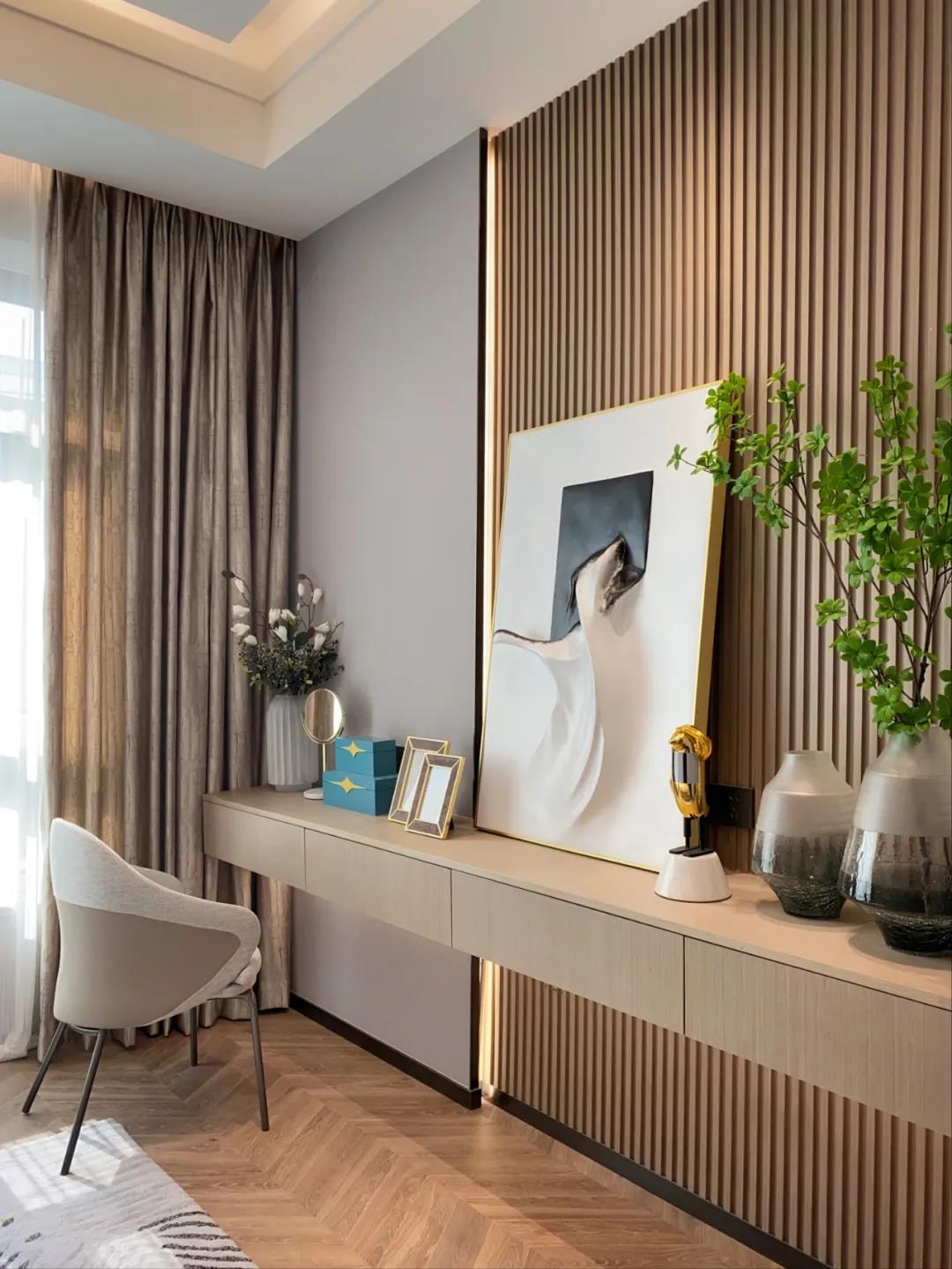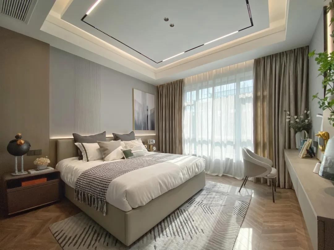 在主卧区,淡雅木色通体式墙面延续了空间素朴文雅的视像,高级灰色系的床品和配饰彰显主人娴静淡然的心境。