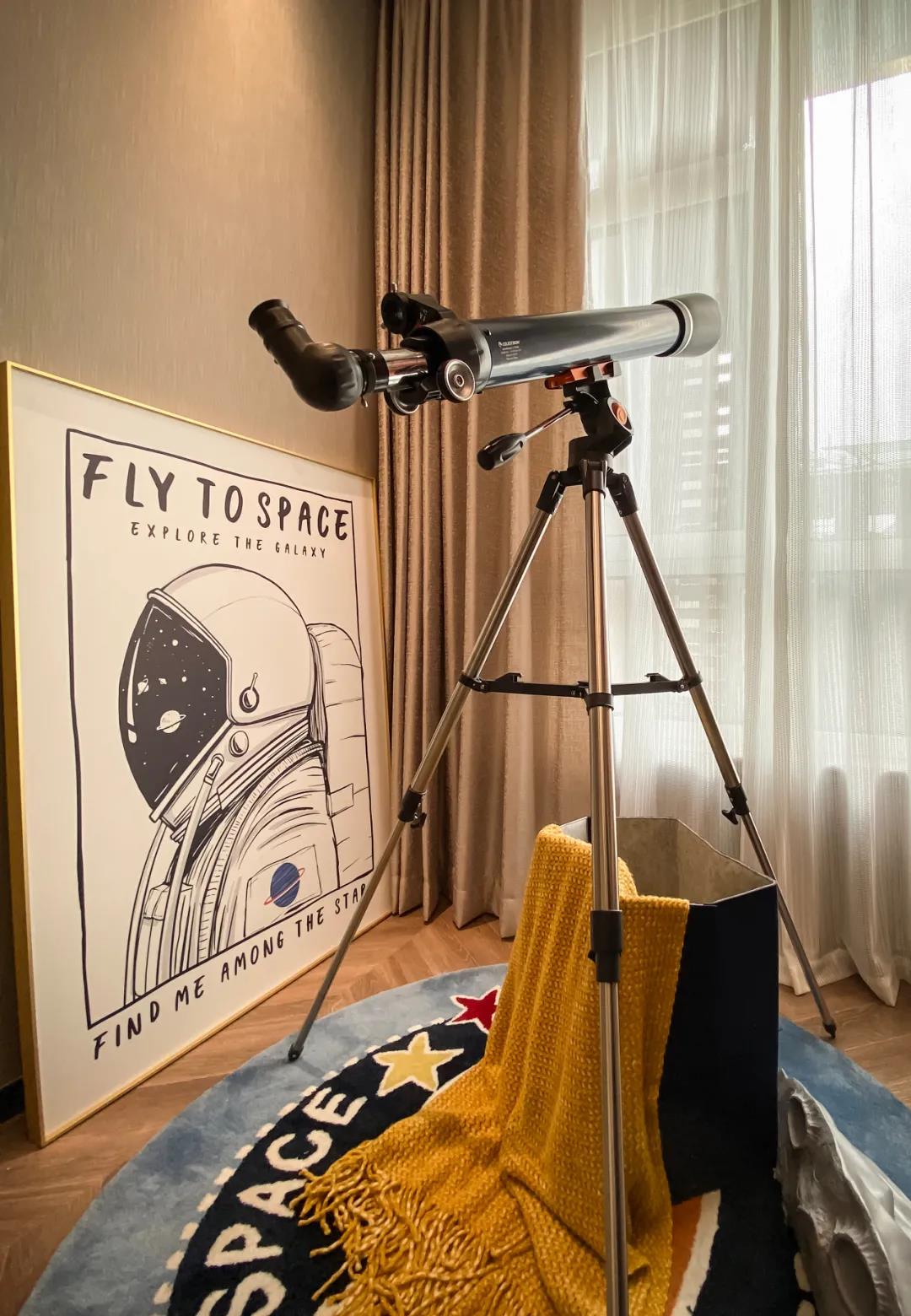 男孩房以最个性的蓝色宇宙星空主题唤醒空间的盈盈活力,一袭云朵白床品与蓝色定制书桌床头柜体营造出时尚个性的风情,实现一个少年远航的愿景。