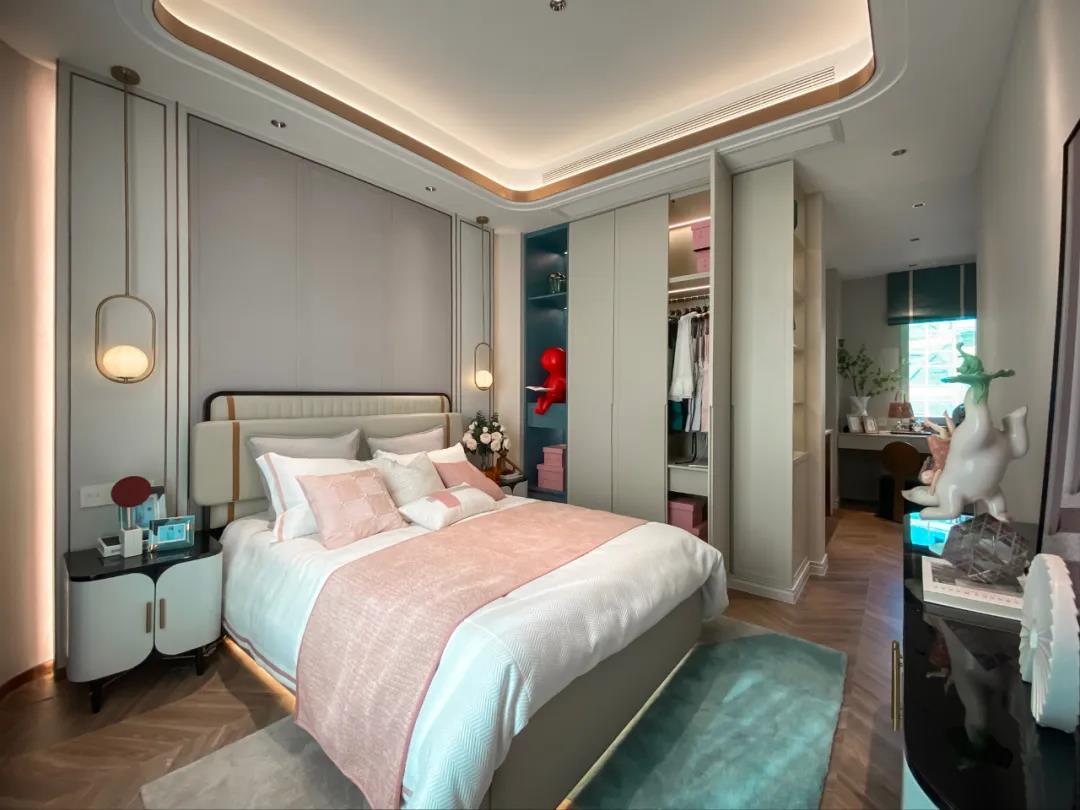 主卧区白色复古式墙面与灰色床头背景,搭配上米色结合棕色复古皮带的床头造型,粉色白色混搭的床品。