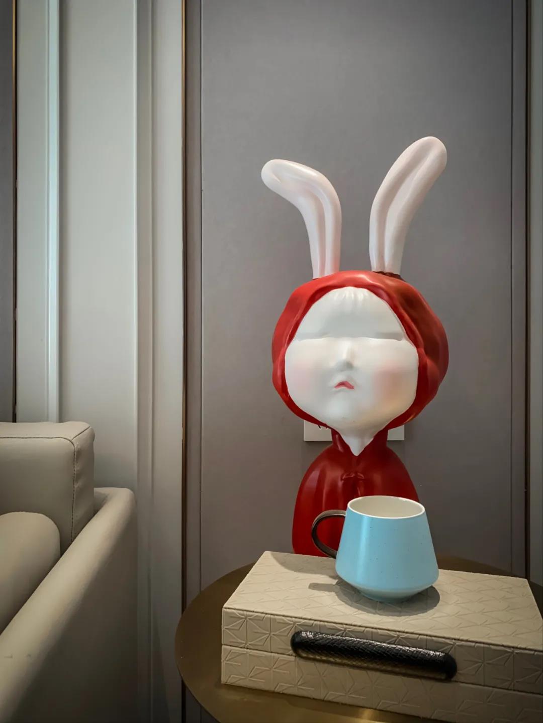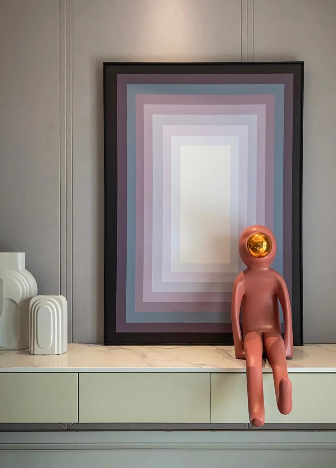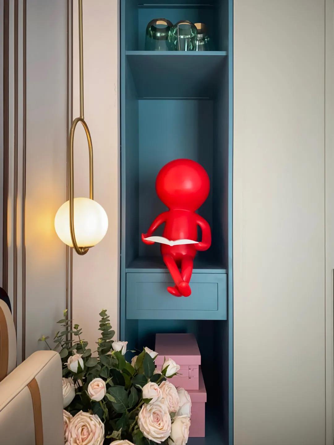 透着甜甜的味道,优雅的书形床头边柜与一抹蓝色地毯与装饰格的局部装饰点缀,红色的小人将空间的文艺风推向高潮。