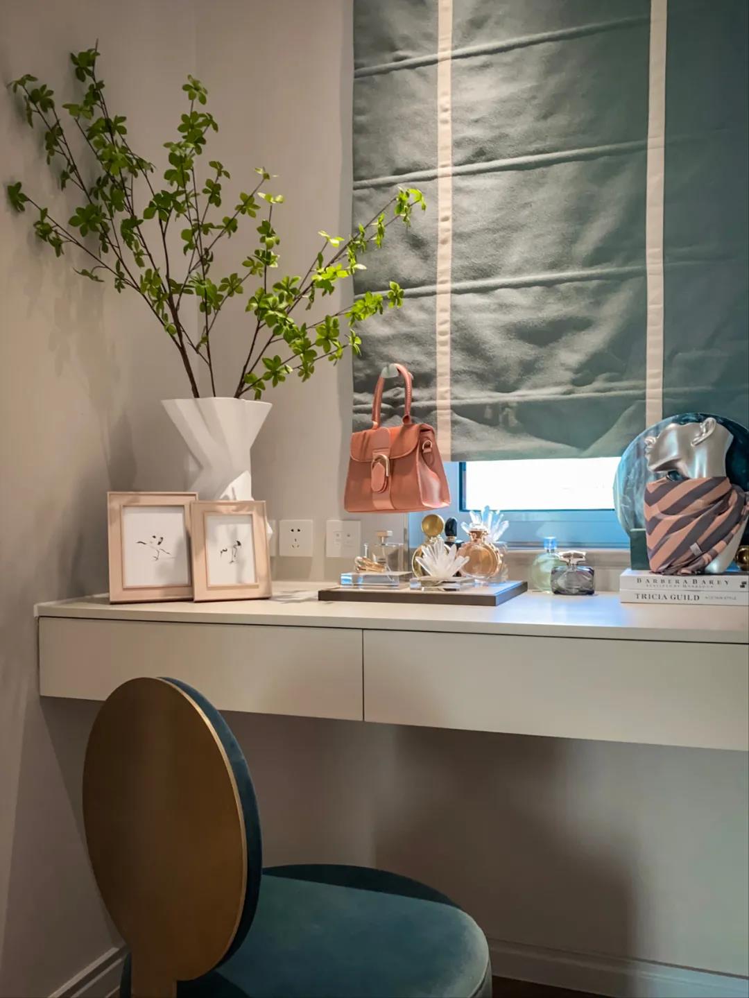 独立梳妆台的绿色花插与粉色小包的点缀,结合水晶饰品的精致,为空间塑造出精致生活与健康阳光的良好情趣。