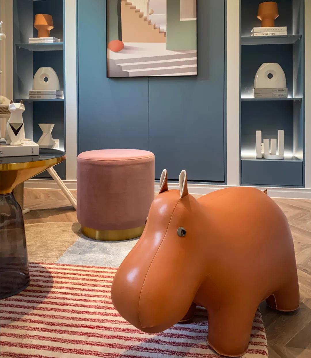 休闲房以最个性的蓝绿色拱形墙配以粉色沙发和萌萌的动物座凳,置身室内仿佛到了地中海的童话世界。