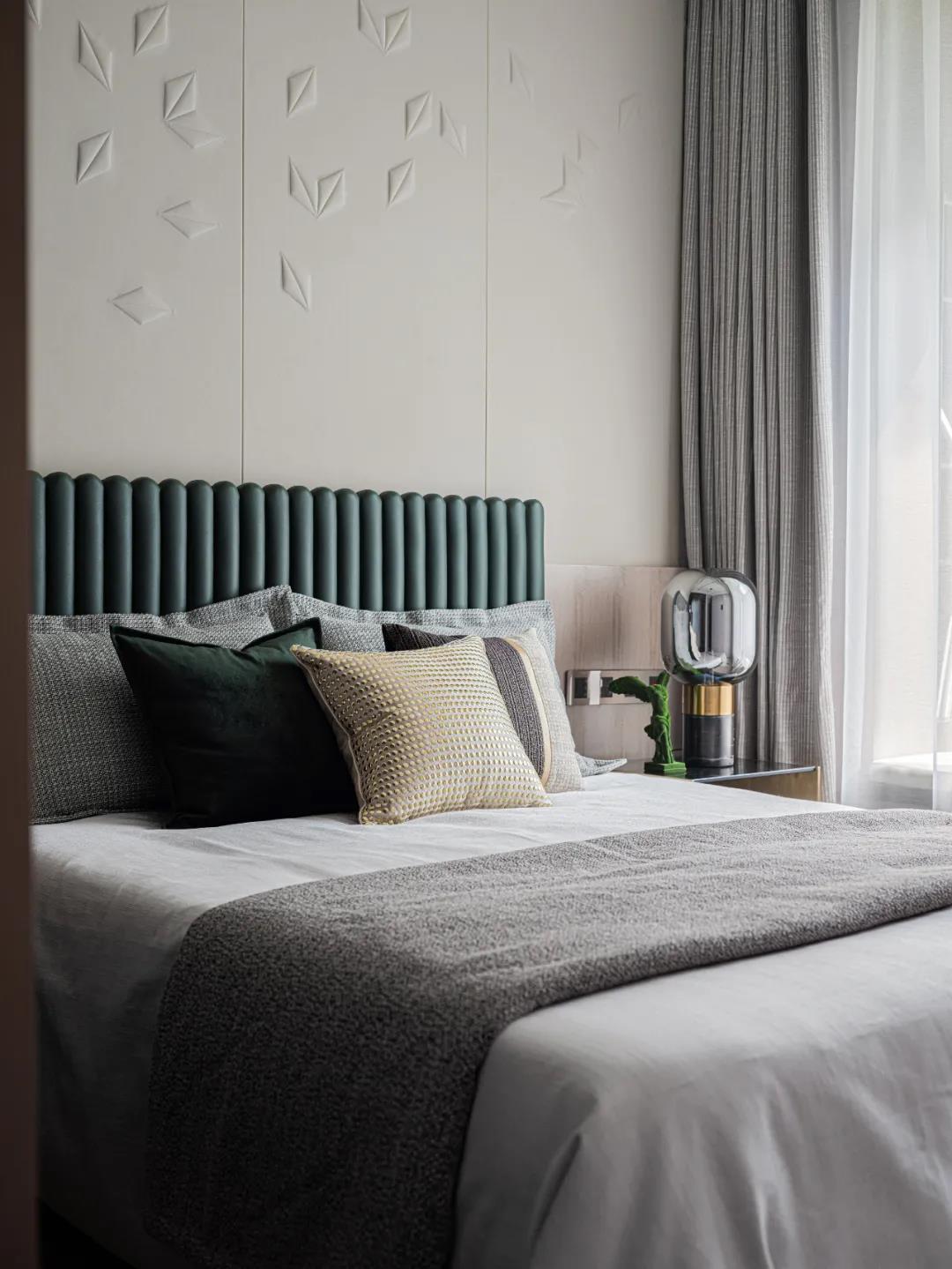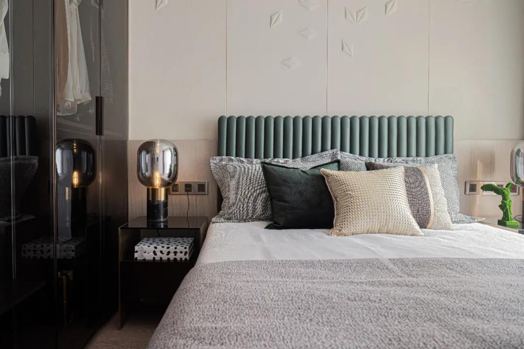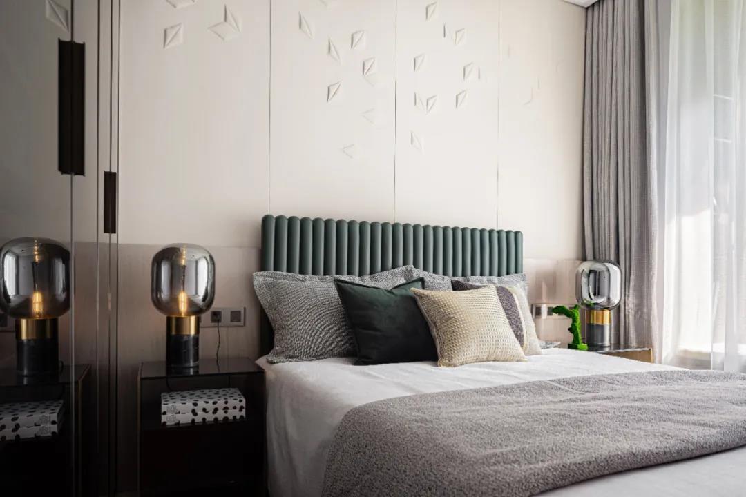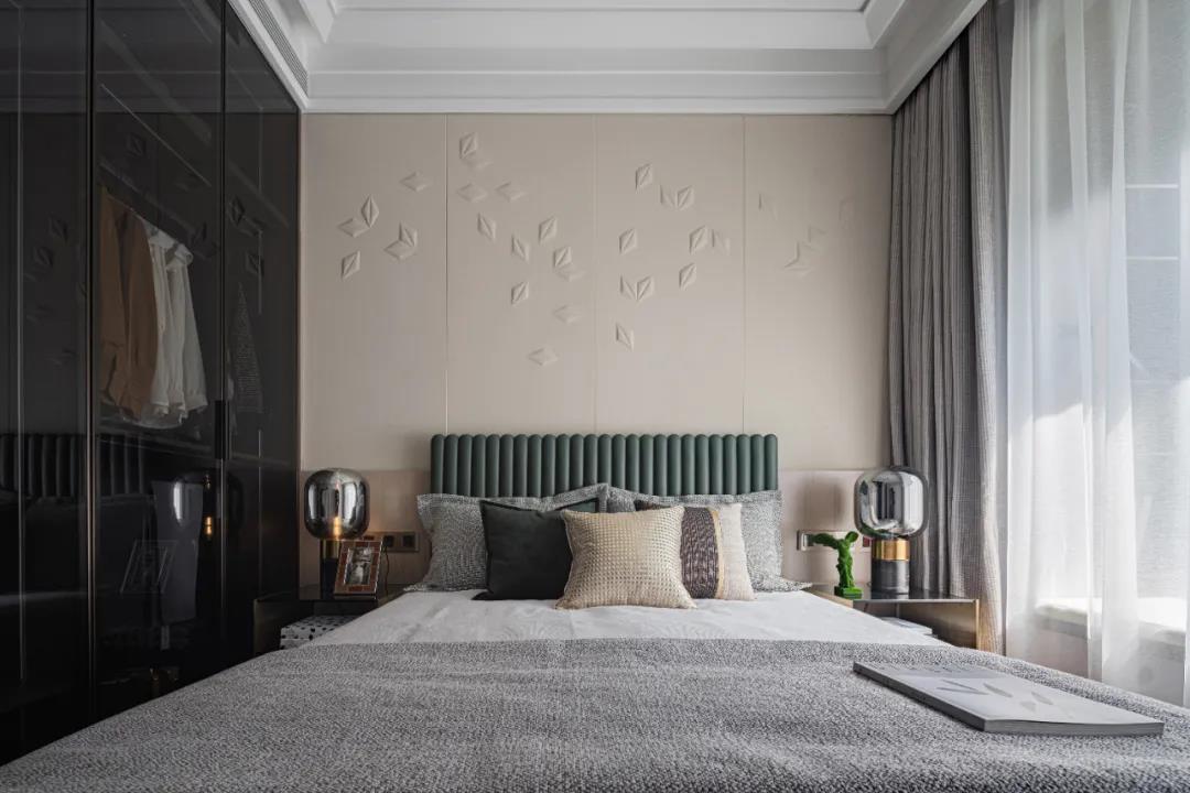 主卧整体空间颜色非常简单,几乎全由低饱和度的颜色组成,背景墙的雕花皮质硬包质感细腻,搭配木质地板予人冷静安谧的视觉感受