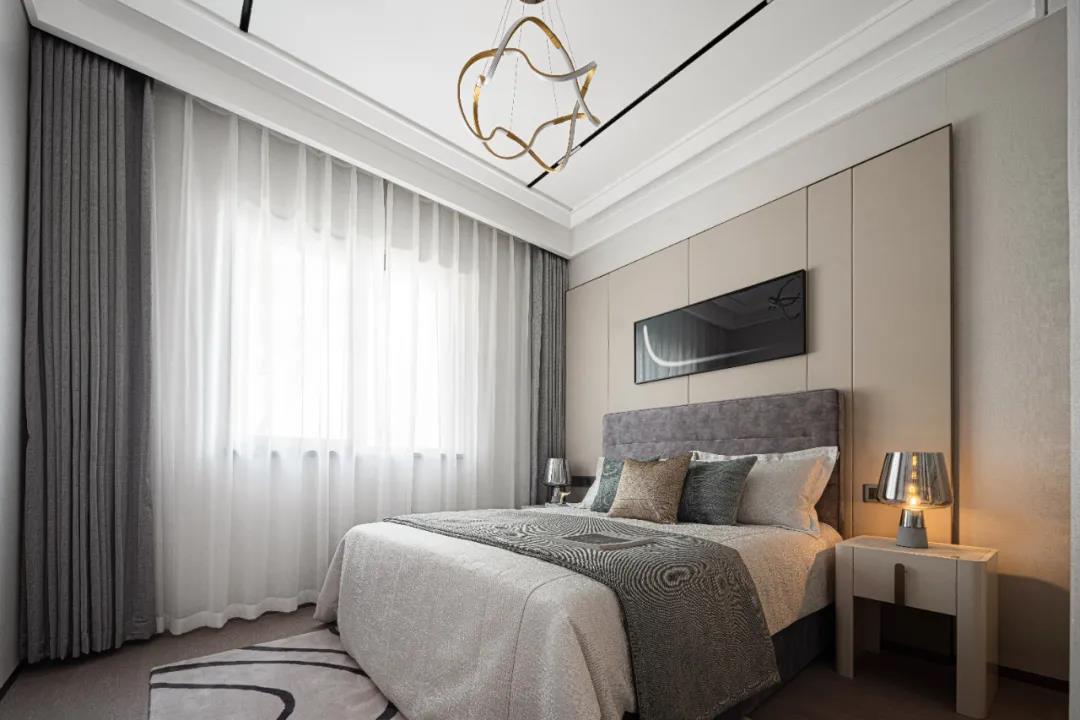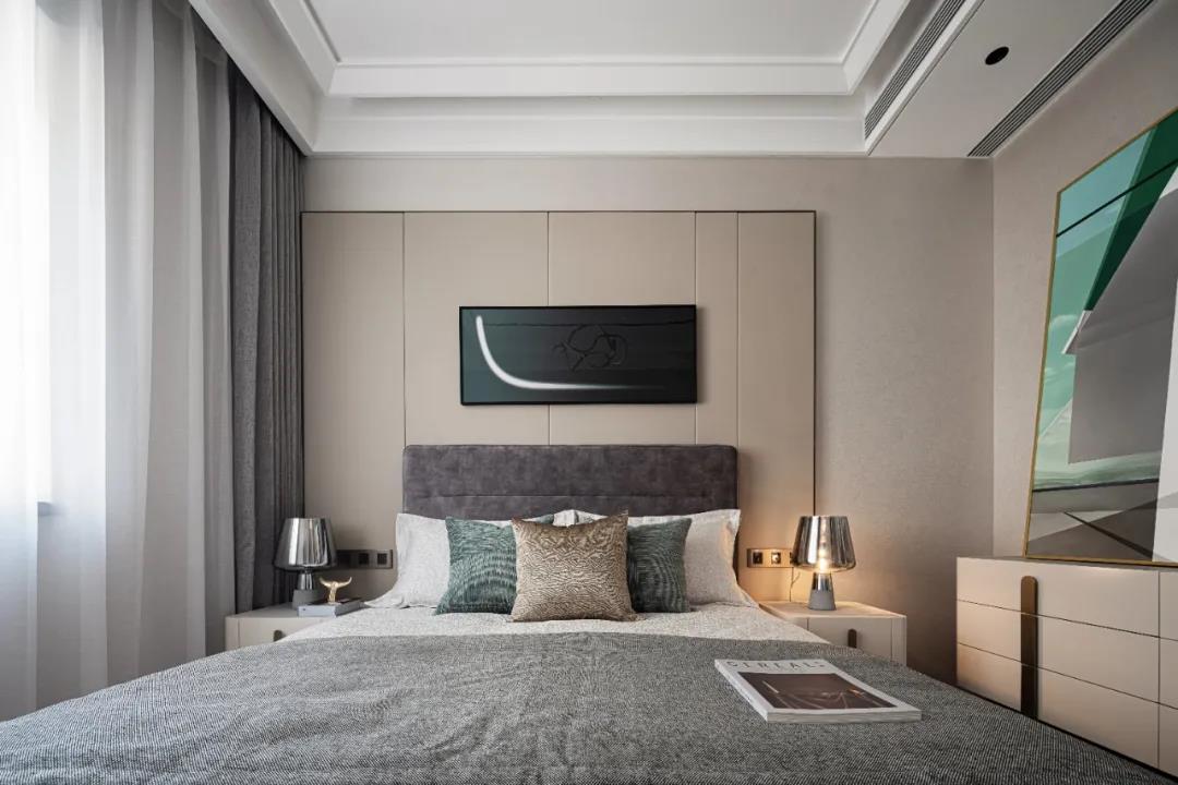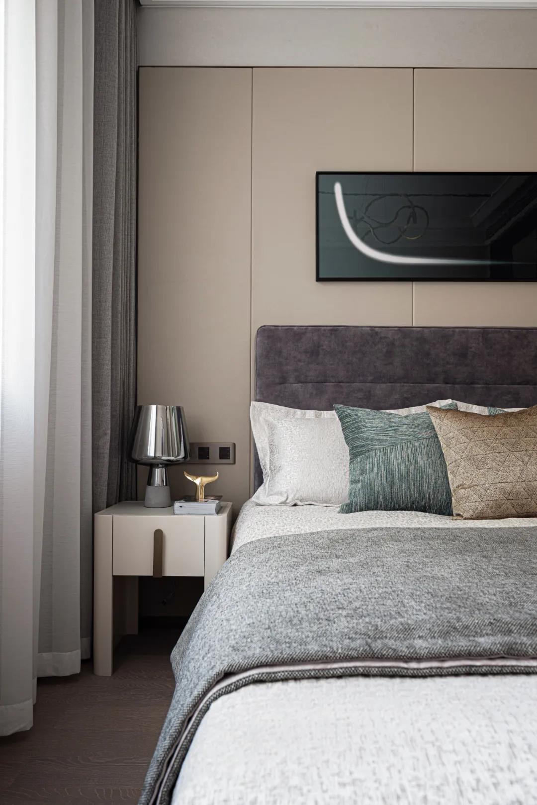 主卧整体空间颜色非常简单,几乎全由低饱和度的颜色组成,背景墙的雕花皮质硬包质感细腻,搭配木质地板予人冷静安谧的视觉感受