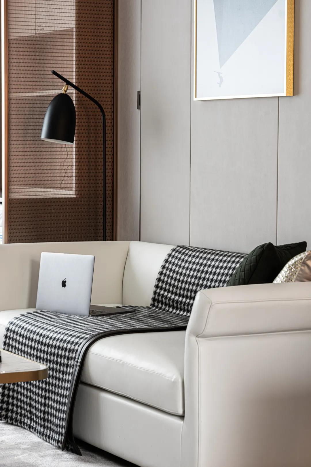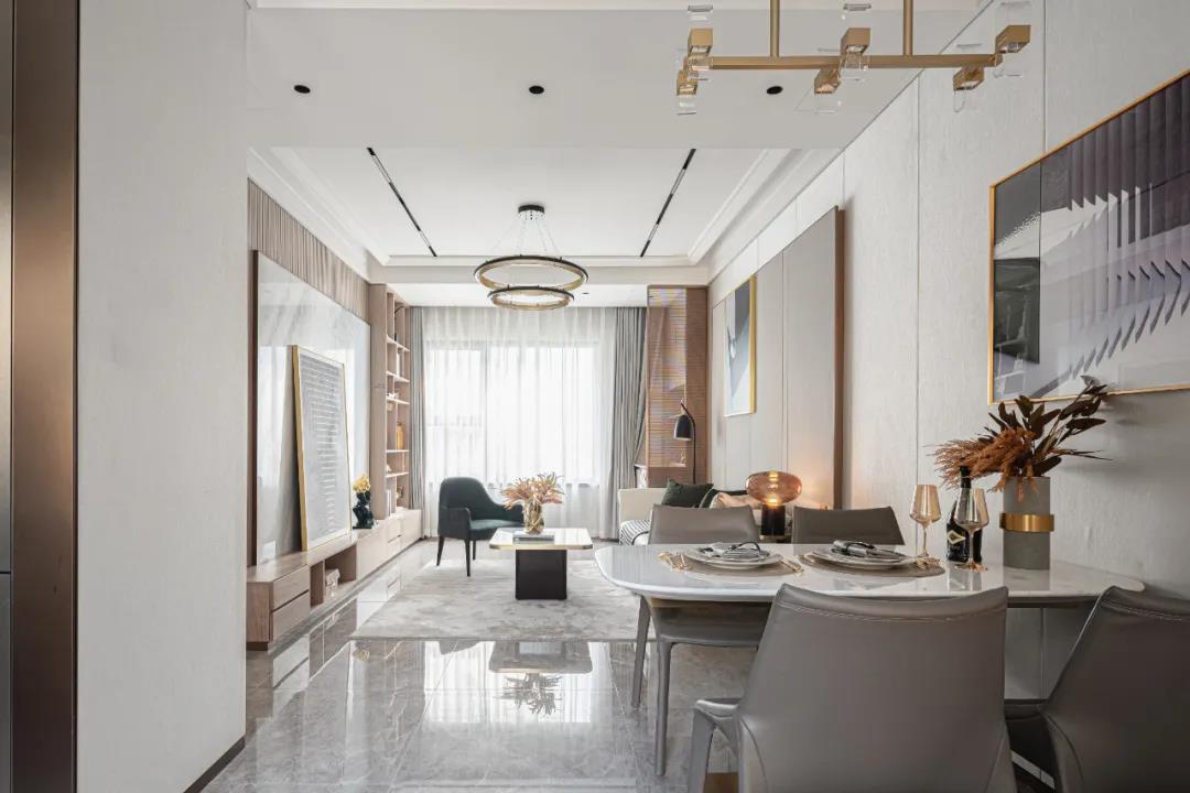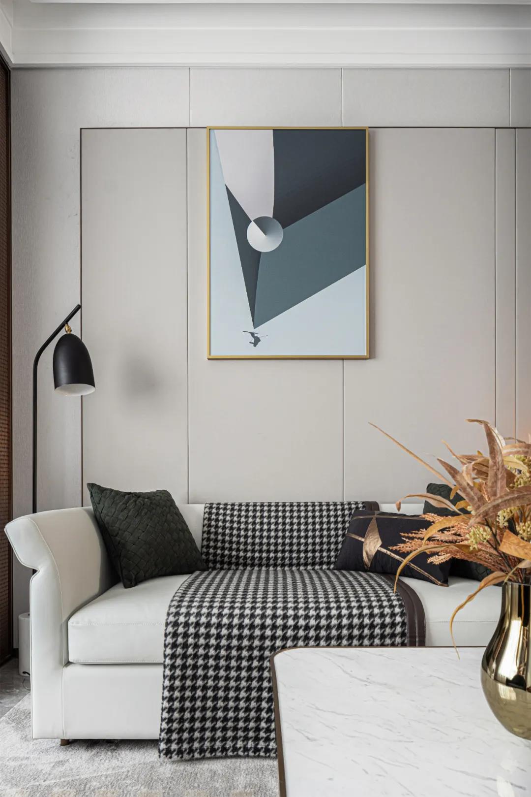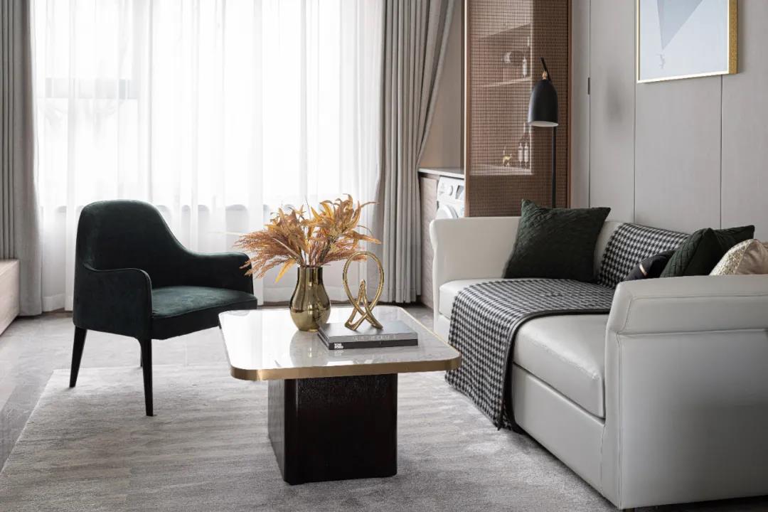 皮质包硬的墙壁装饰,搭配上大理石茶几,整个空间的轻奢风格在看似简洁朴素的外表之下,却折射出一种隐藏的贵族气质,又给人时尚前卫、优雅且不失温馨。