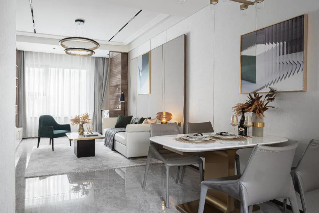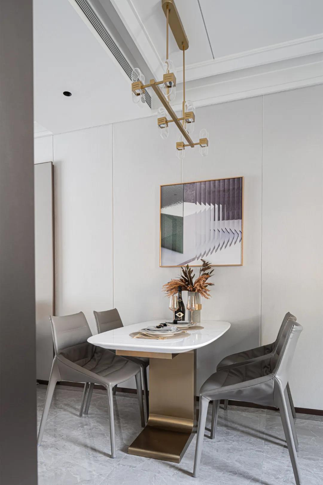 餐桌依然是开放空间布局,强化空间的开阔感,此处延续客厅的设计风格,以灰白色为基底,以金属为点缀,尽显低调的奢雅高贵。