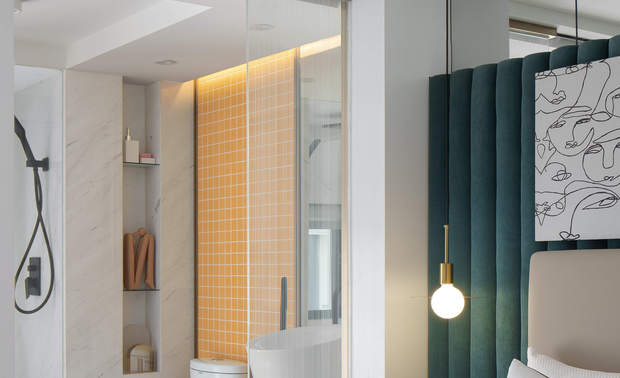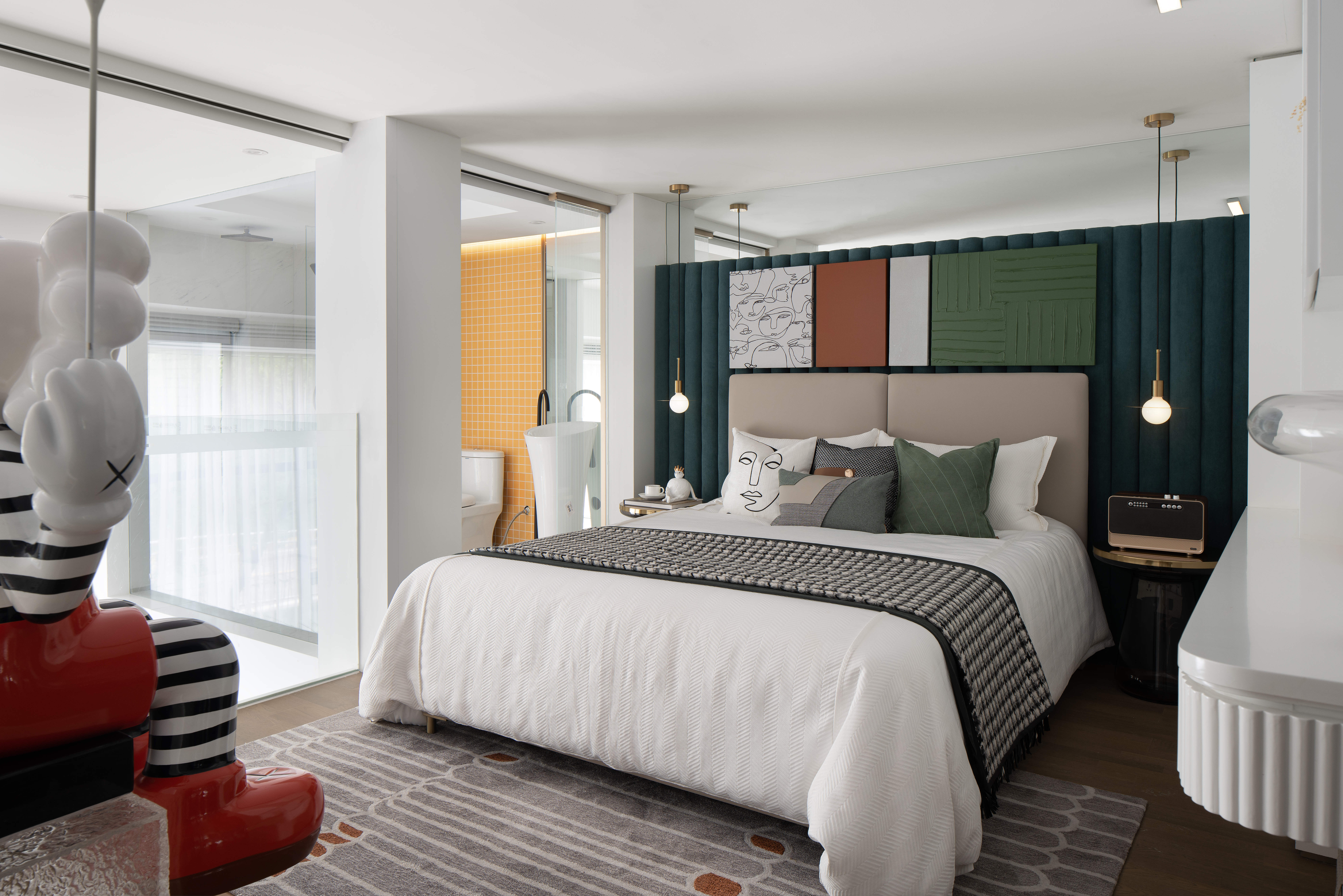 设计选材:卧室设计在硬装上以软包的手法结合玻璃镜面,很好地增加了空间的层次感、神秘性与视觉趣味性。光与影在门洞与窗格中的自由渗入,组成点、线、面间的韵律变奏,让人在恍然中忘记空间的真实尺度。
