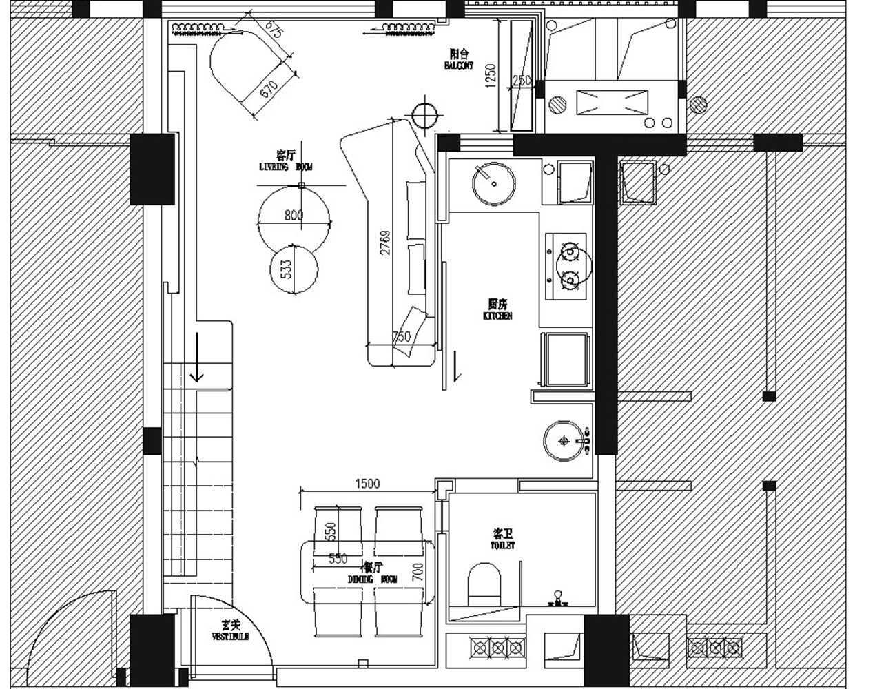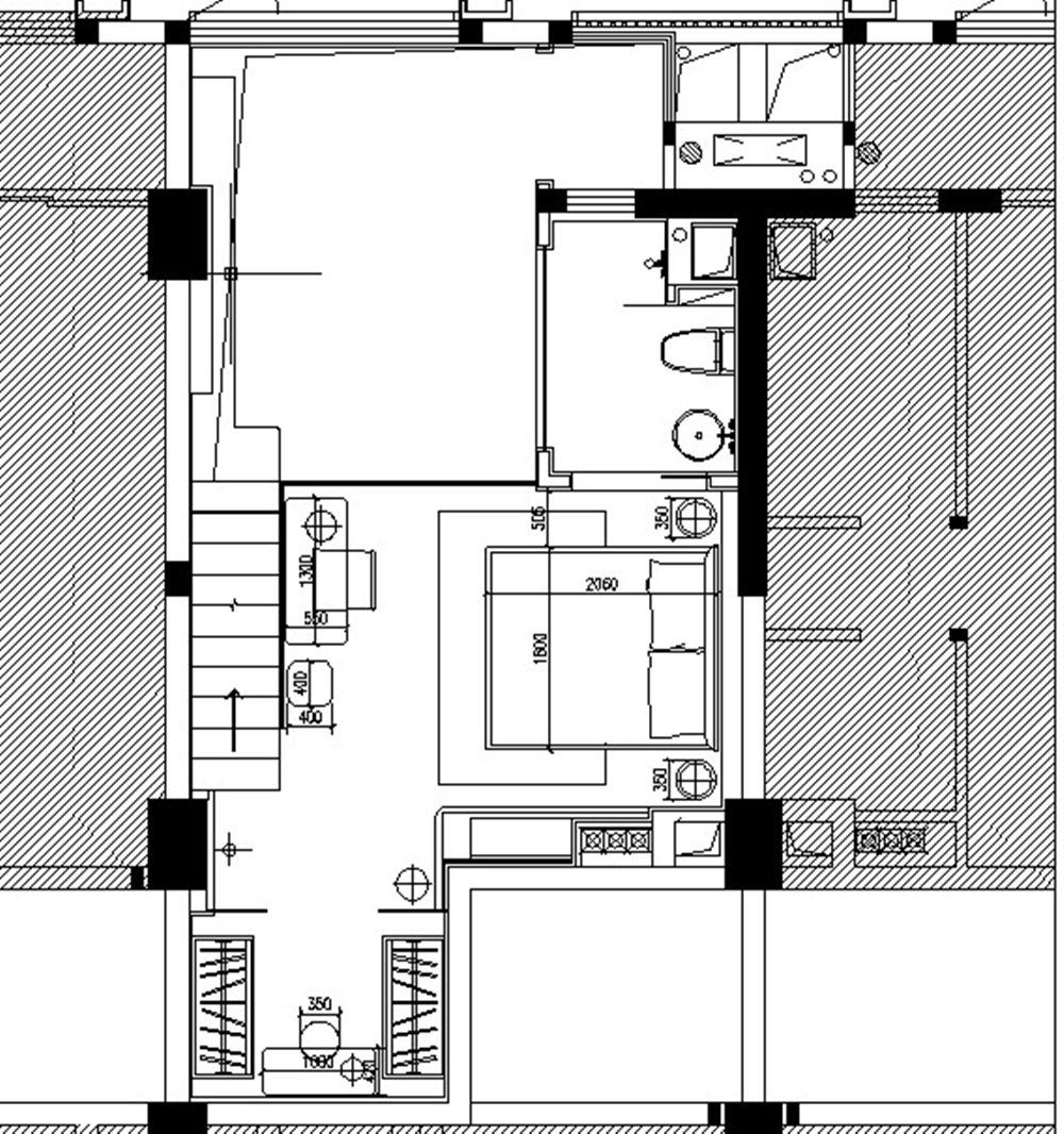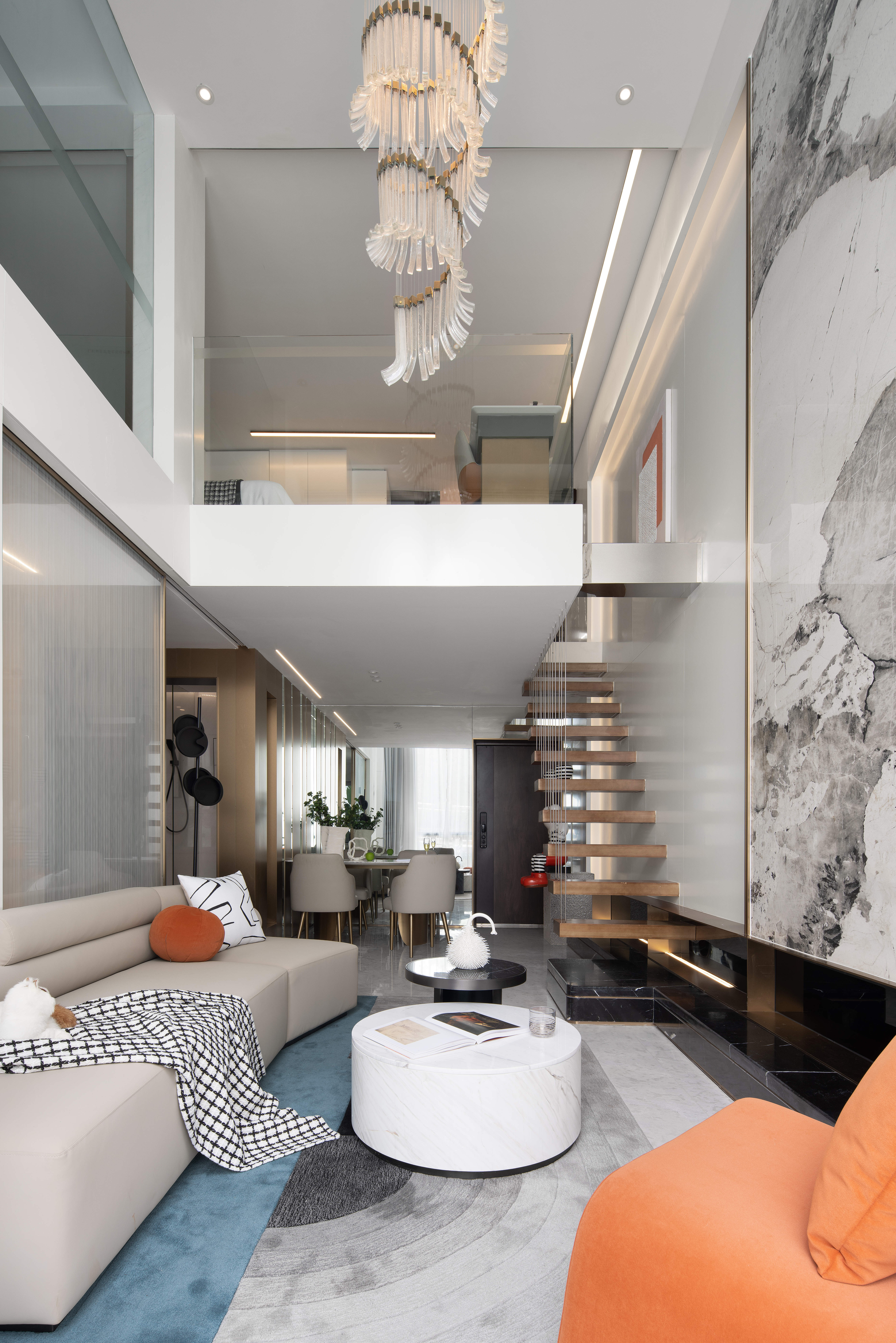 空间布局:从设计的使用主义出发,楼梯在满足功能的同时,保证空间的通透为前提,也保证了动线的合理,点光源设计满足了灯光的需求,并营造出温馨的空间。