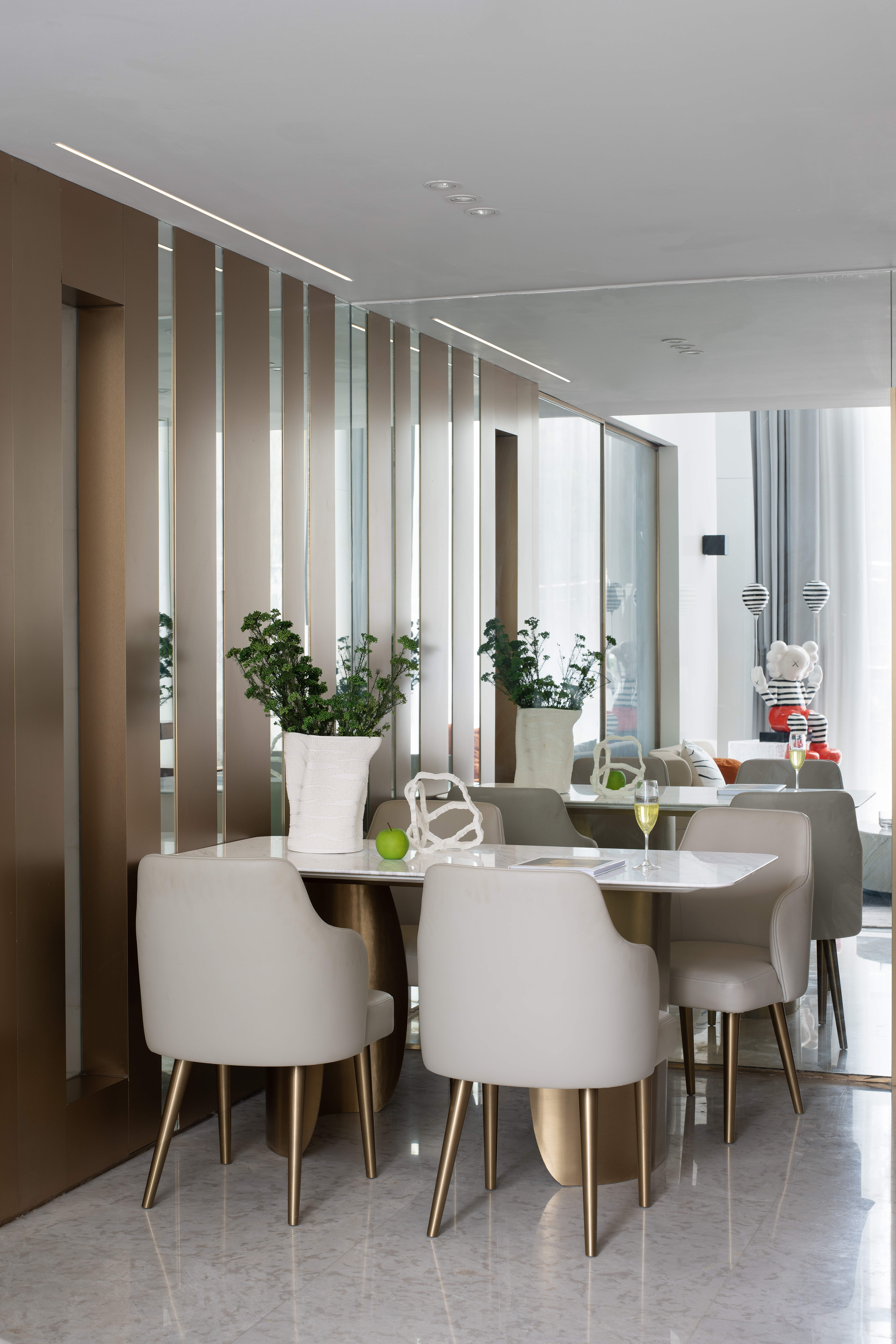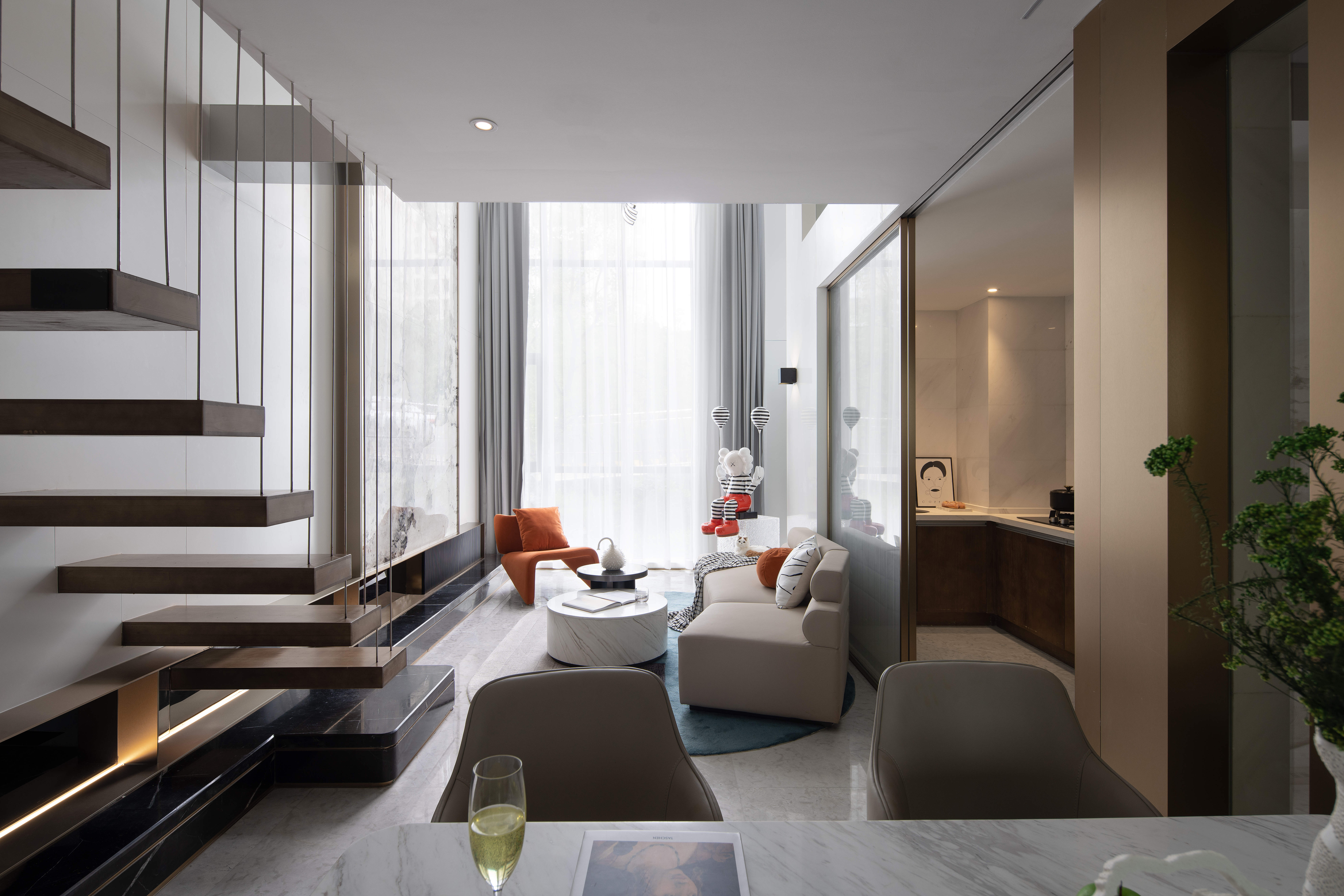 空间意境:空间以现代简约风格为主,“现代、轻奢、自然”的格调作为本案的设计笔触,融入时尚轻奢的特质,用大自然做美学,去实现人与环境美好的互动关系,用借景来增加空间与空间关联性,移步易景,配合金属材质,用恰到好处的软装使得整个空间在干净利落的同时,又不会过于生硬。