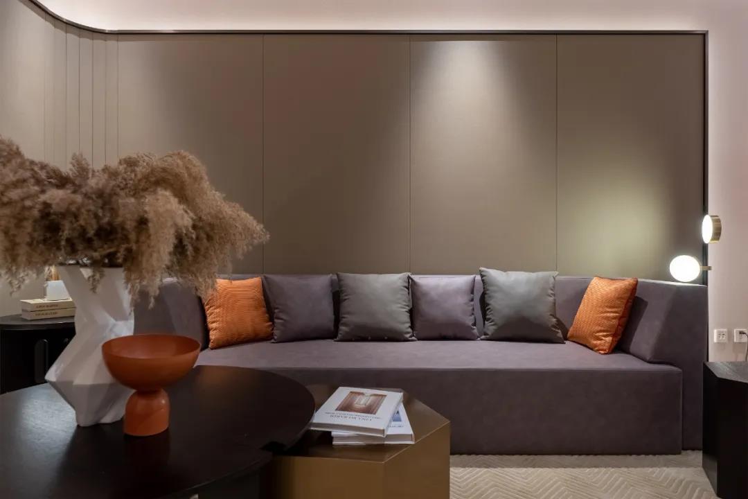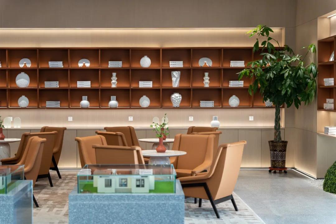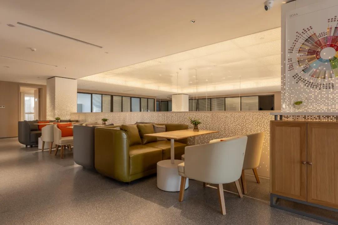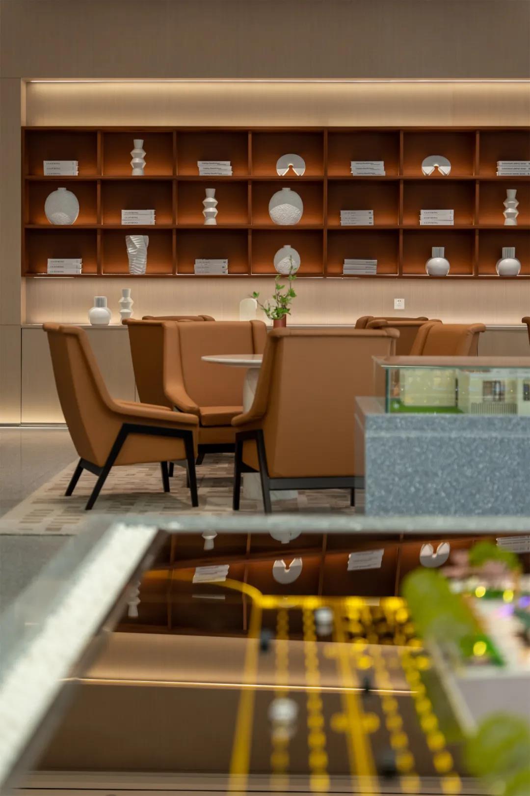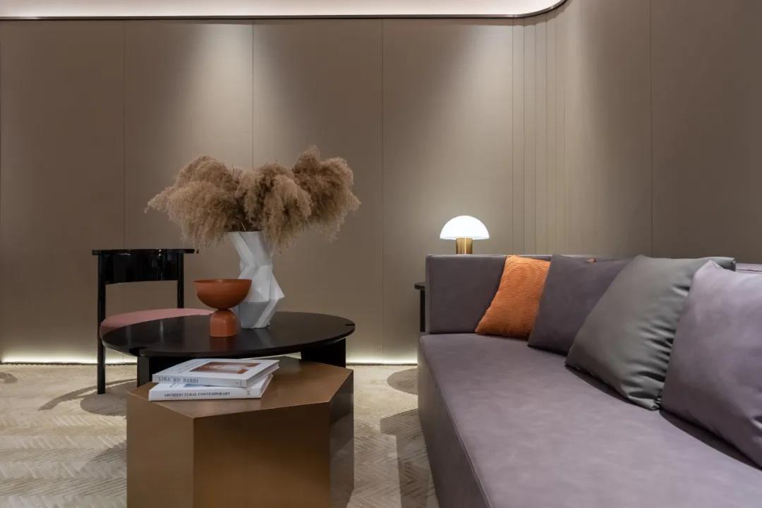 洽谈区以块状为背景,选择用背光烘托出简约的氛围,选择暖色调的丝绒座椅,既能柔和整个空间的硬度和冰冷,又能丰富空间的质感。点缀上富有禅意的绿植布景,让空间充满了生机了,同时又增加了艺术的深度。