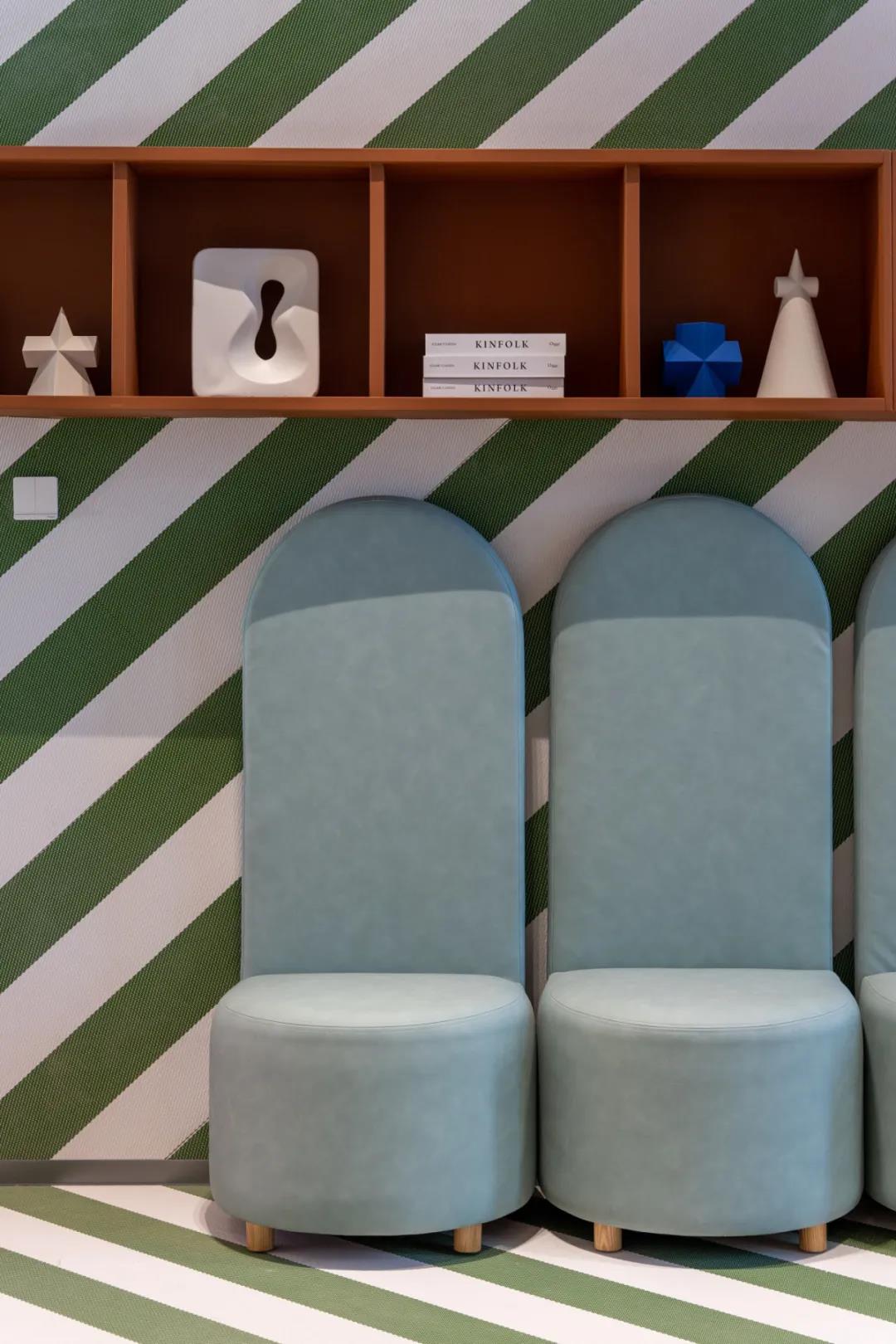 儿童活动区选择糖果色,巨大的动物雕像,飞上天空的圆圆气泡,积木一样的长桌,像是一个个梦,一下子将人带进了充满童趣的梦幻世界,为了小朋友安全考虑,整个空间都选择了圆润的设计,更添加了一层柔软的织物包裹。