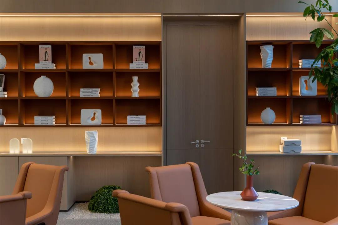 电梯厅的布局更像是一个庭院的小景,将背光作为主要光源,柔和而含蓄渲染了空间内敛的内涵。