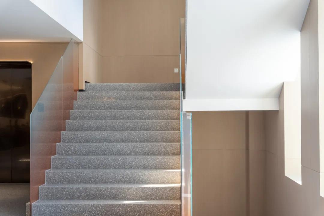 楼梯选择整体化的石材与渐变玻璃的对比,两种完全不同的材质和色彩的碰撞,为空间增加一层趣味。
