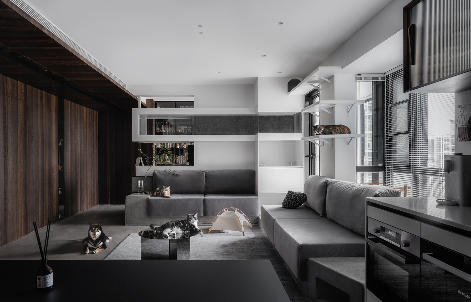 项目定位:我们认为尽管大家称之为“宠物”的生物是被人类所圈养,但本质上每一个生命个体都是平等的。因此,尤其在私人化的共生环境中,更应当创建出人与动物居住空间的边界,但又使之柔和地相连接,让家庭成员之间的关系既保持亲密又有能带来从容的空间感。