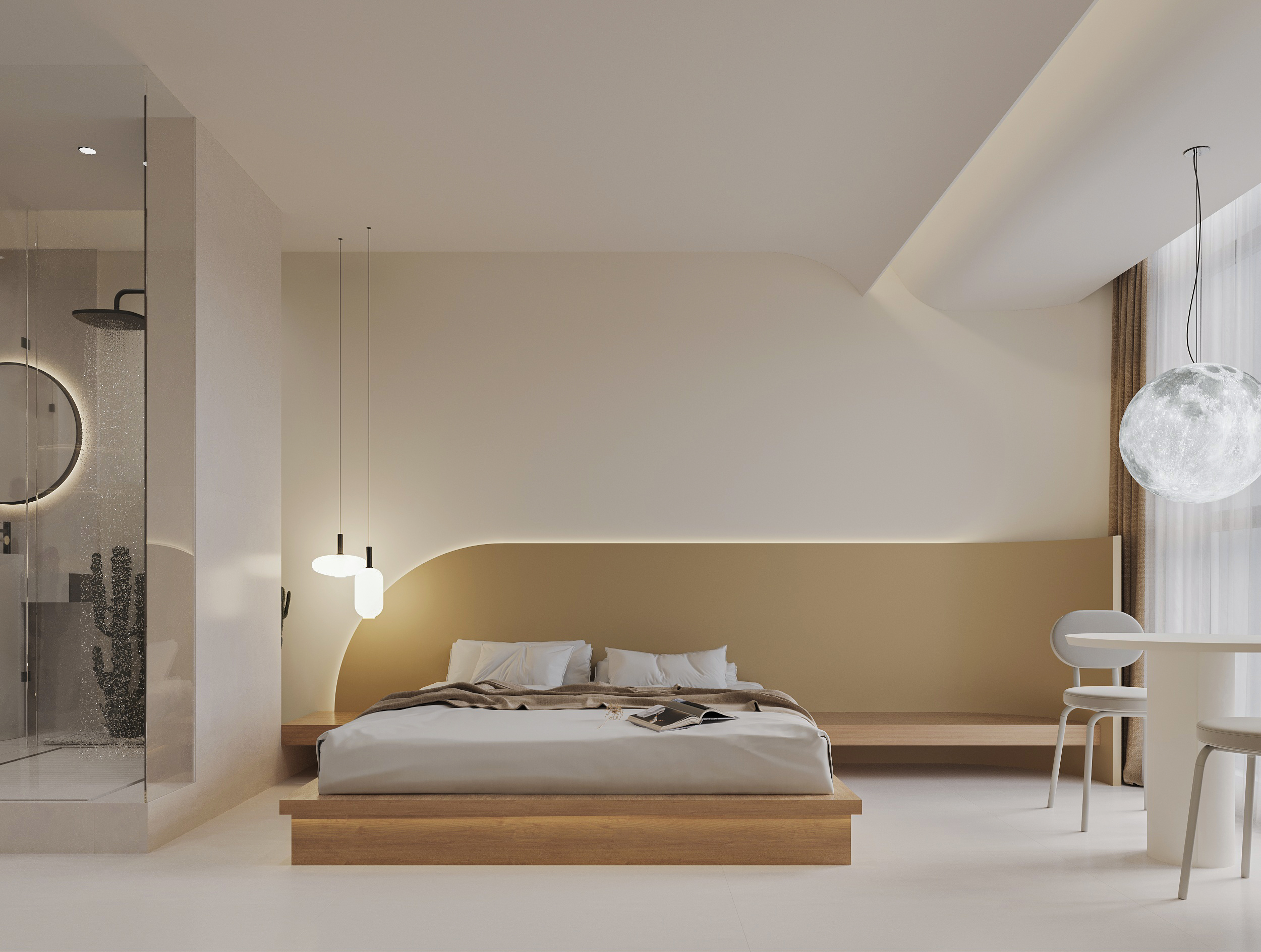 童言 在儿童时期我们都幻想着自己能有个梦幻般的童年,奶咖色的空间加上弧形的元素,很好的诠释了这个梦幻的空间