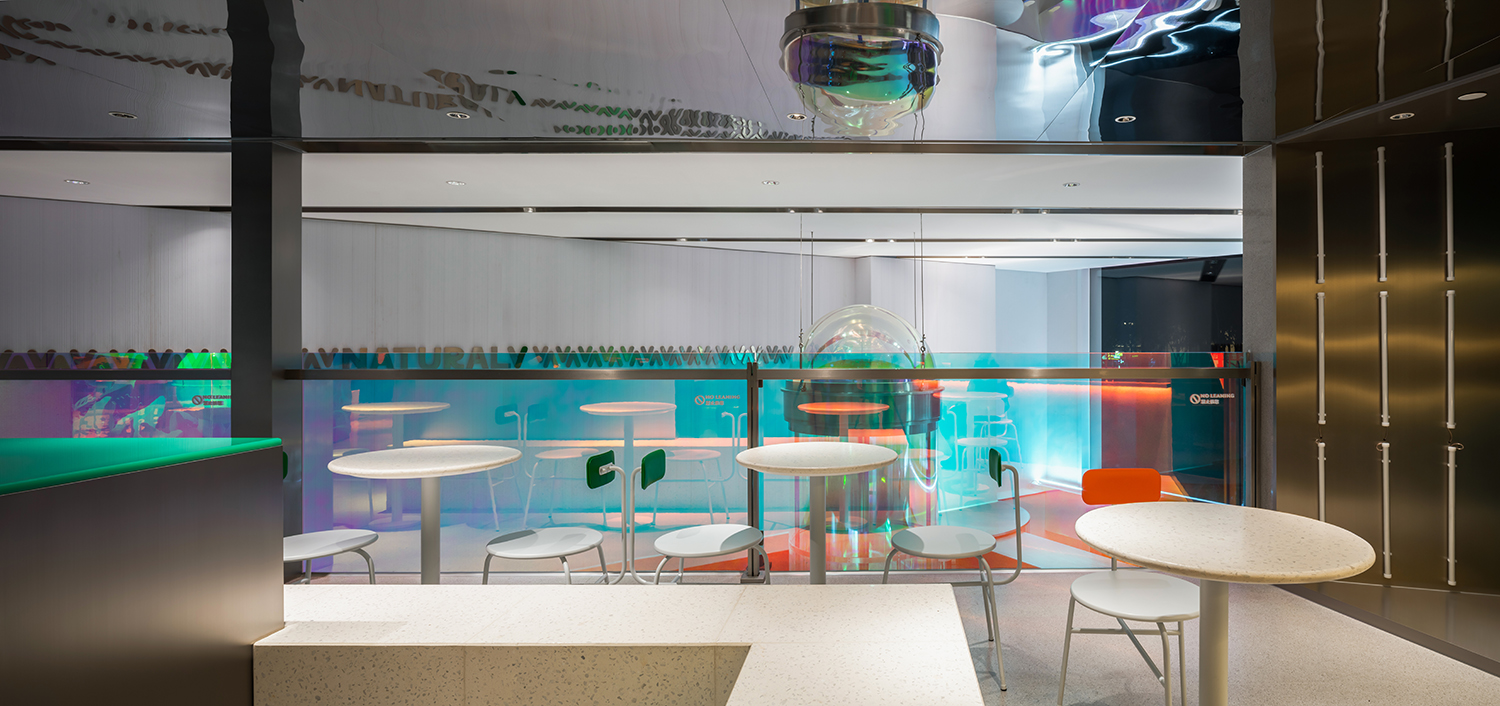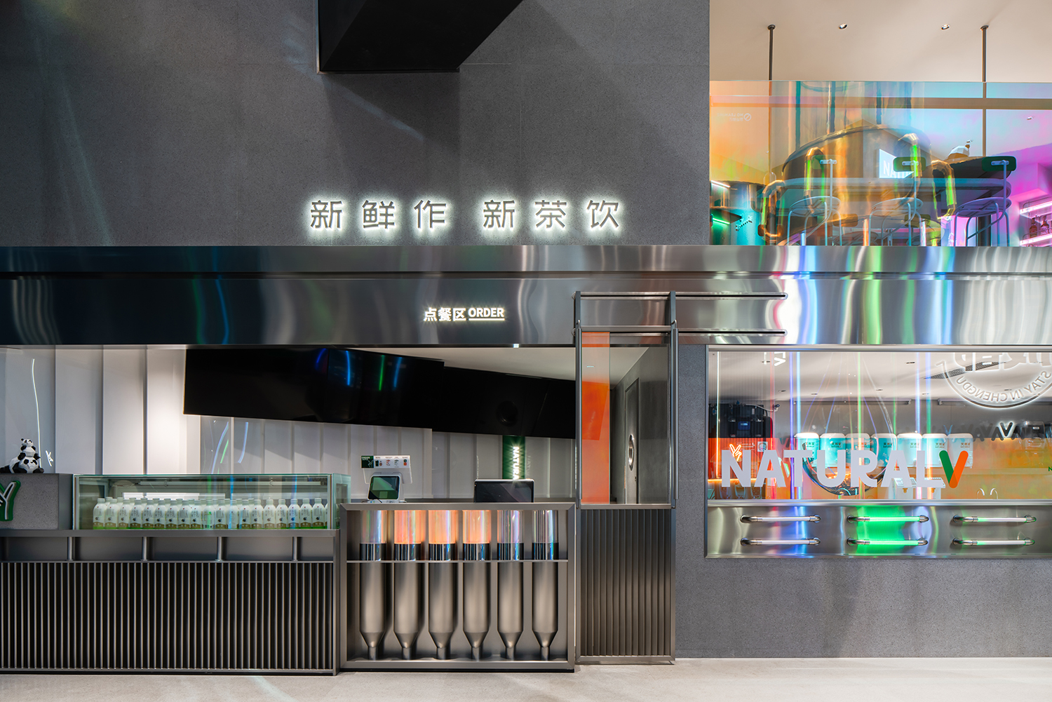 白色、银色、绿色的混合交织是这个空间的色调线索,如同鲜奶与茶叶以不同的比列融合出独特的口味,再点缀以元气十足的橙色,展现出“简洁、鲜明、通透、夺目”的第一印象,也是对“新鲜、独特、活力”等品牌诉求的直观诠释。在这些色彩包裹下的点、线及面,形成了有节奏感的几何纹样与块面,组合出明快、高识别度的空间。