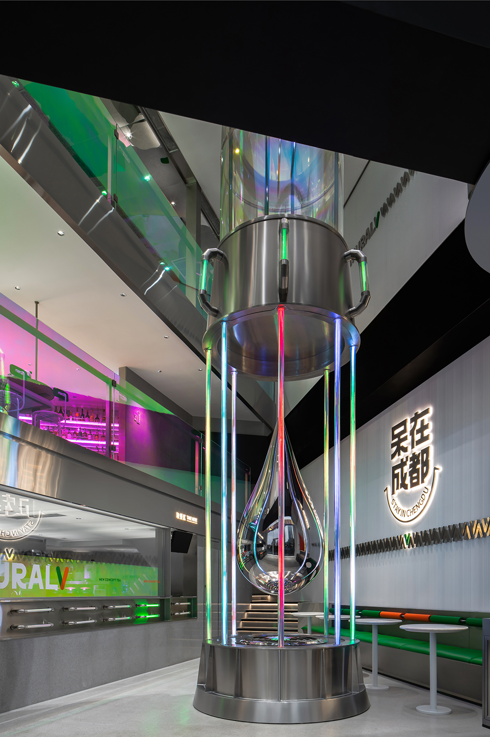 利用“空”的优势,我们对空间做了几何切分,将之变化为“两个”纵深空间。然后将平面布局规划延伸到了垂直空间的设计。一个三角区做了三层具有不同功能属性的搭建,一个贯穿上下、极具未来科技感的滴滤装置则在平衡空间的同时,也形成了具有品牌文化代表性的视觉焦点。