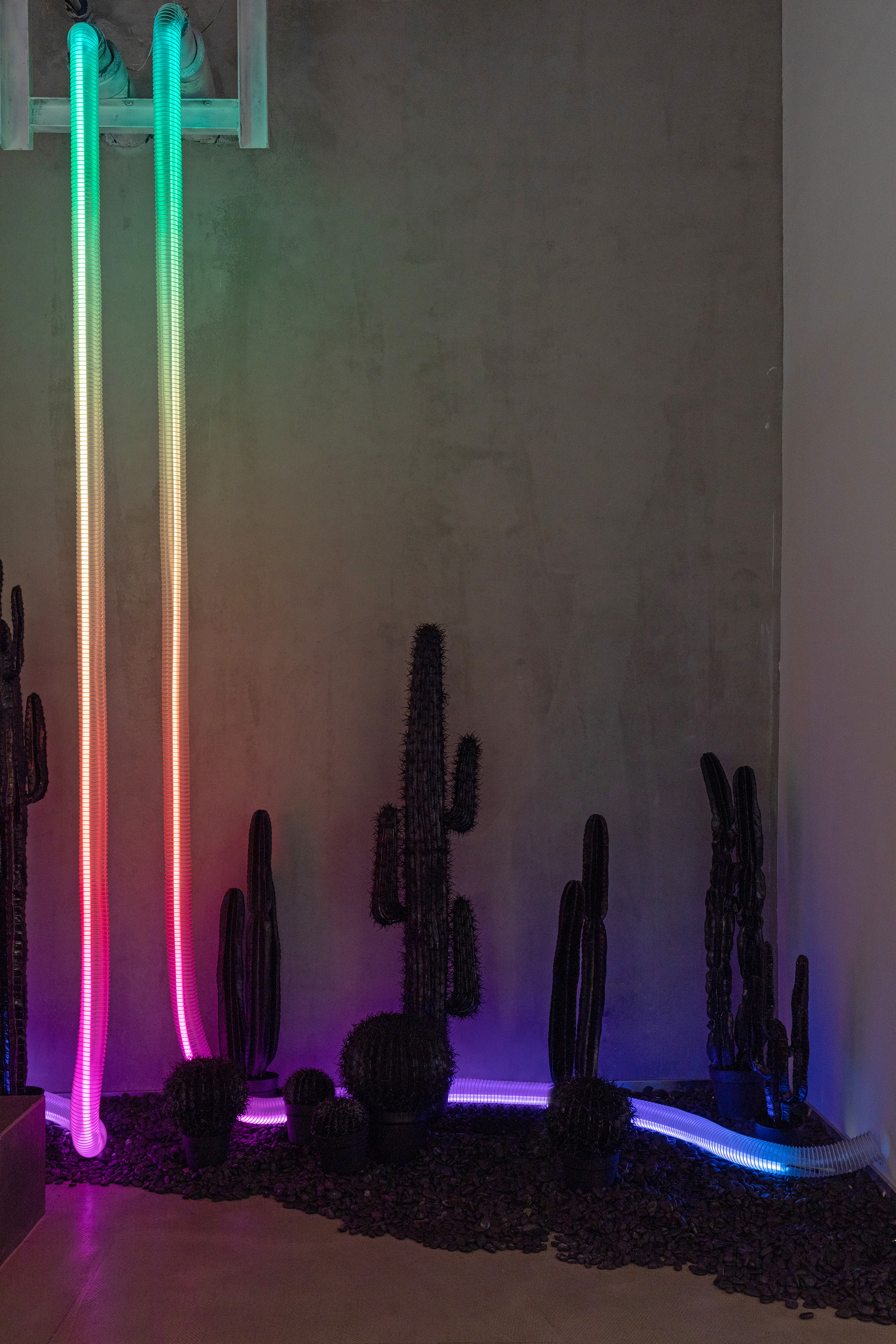 堂食区是这个空间内唯一摆放了鲜活绿植的区域,同时也放置了一个赛博感的蛋型装置,通过不同材质与生命体的碰撞表述出思考的答案。