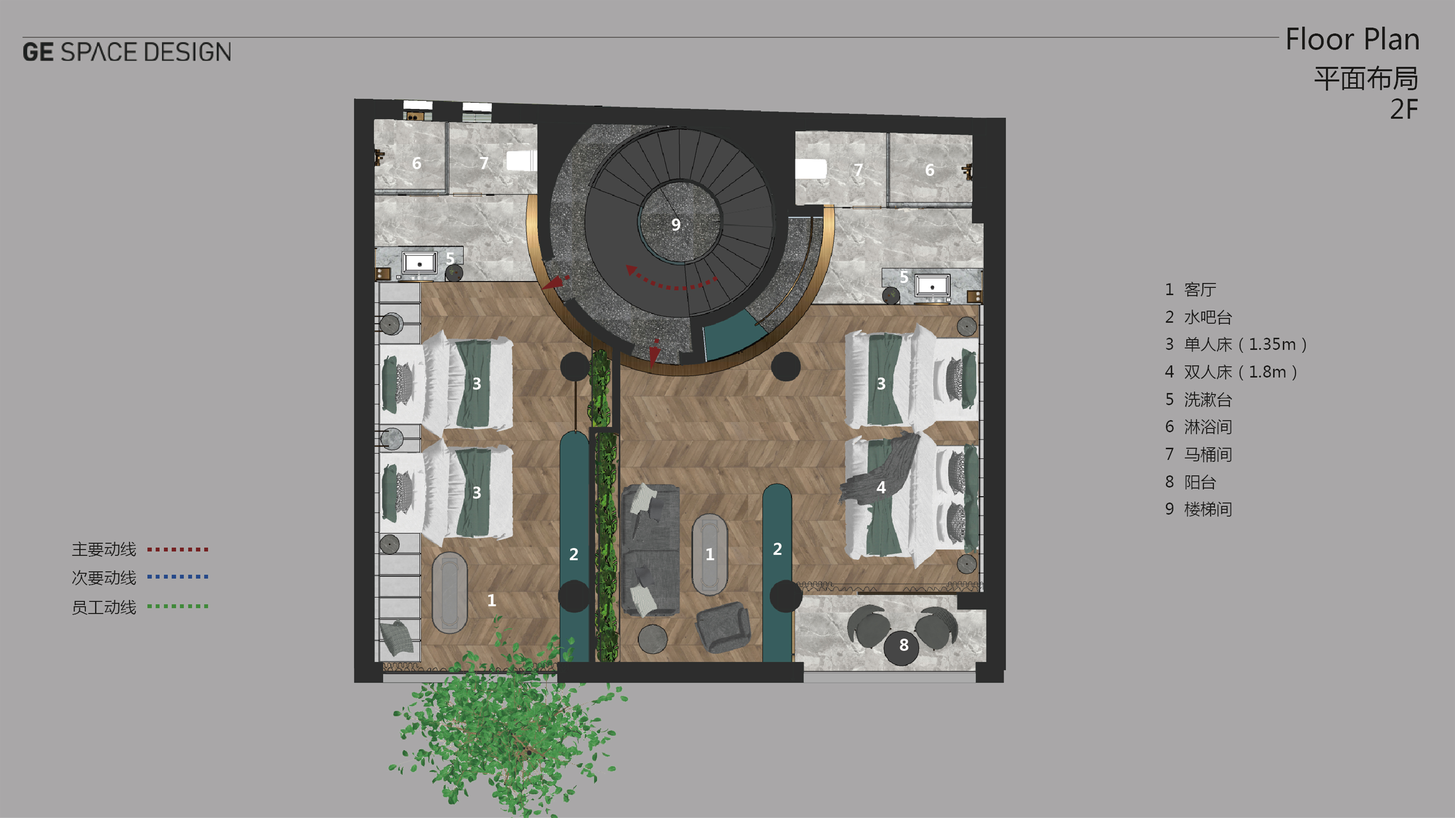 空间布局:整个民宿由威士忌酒吧、四个客房以及一个屋顶露台组成。威士忌酒吧位于一楼,兼顾民宿check in的功能,沿着旋转楼梯往上,二楼和三楼分别有两间客房,每一间客房都各有特点,对应着不同的居住需求。顶楼和一楼相呼应,是一个对外开放的休闲平台。