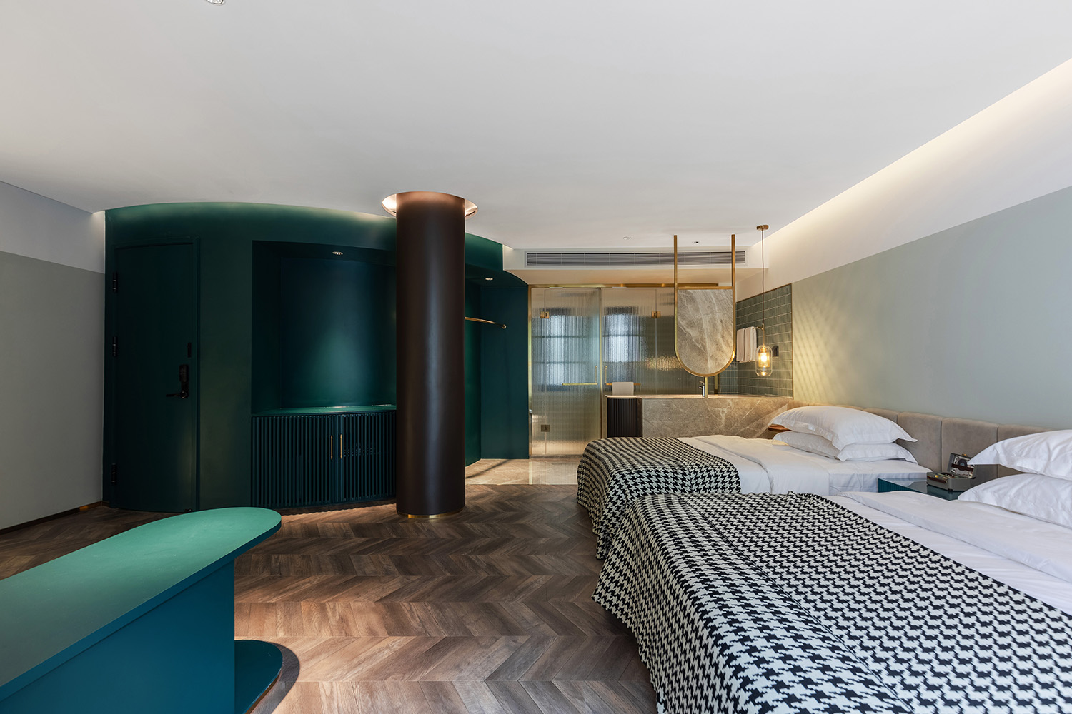 设计选材:房间是墨绿浅绿交织的色调,温和而不拘谨,不严肃、不考究、不冷淡、也不迎合潮流。人在这样的房间里,是松弛而自在的,无需被精英式的审美绑架,也不必为某种风格而感到歉疚。它提醒我真诚以待。