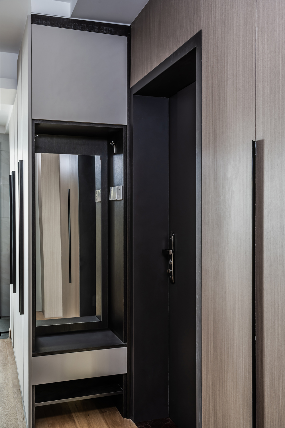 02 鞋柜收纳区 SHOE CABINER STORAGE AREA 原有入户门与储物间杂乱无章 设计师延续背景墙的设计手法 将储物间做成隐门 强调了与入户的关系 玄关处半开放的衣帽及换鞋凳 满足了日常的需要