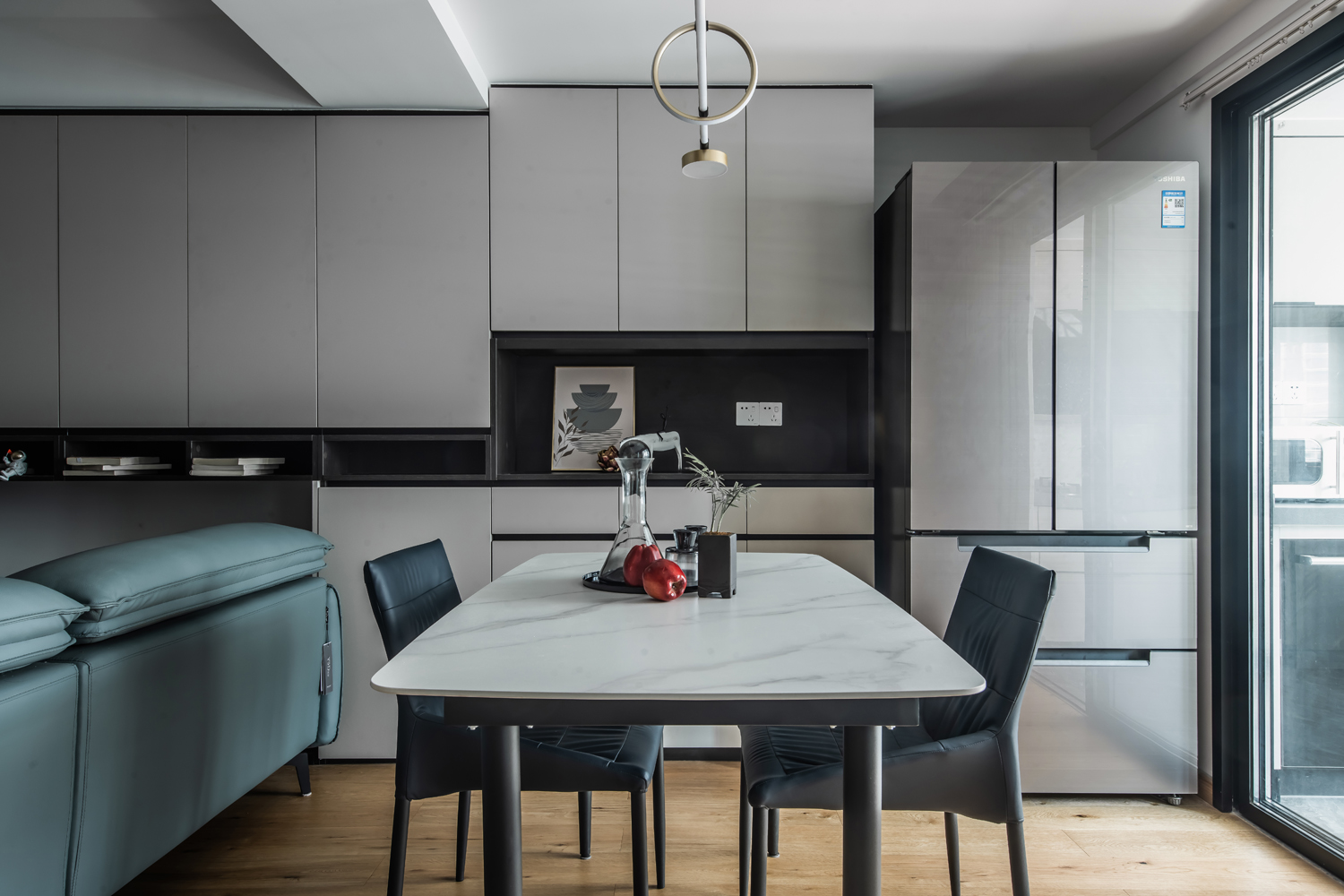 03 餐厅 RESTAURANT 原本厨房和客厅相邻 半圆形阳台与厨房相邻 设计师将厨房拆除留出大部分空间作为餐厅使用空间 解决了要经过厨房到阳台的困局 让紧凑的布局开阔明亮