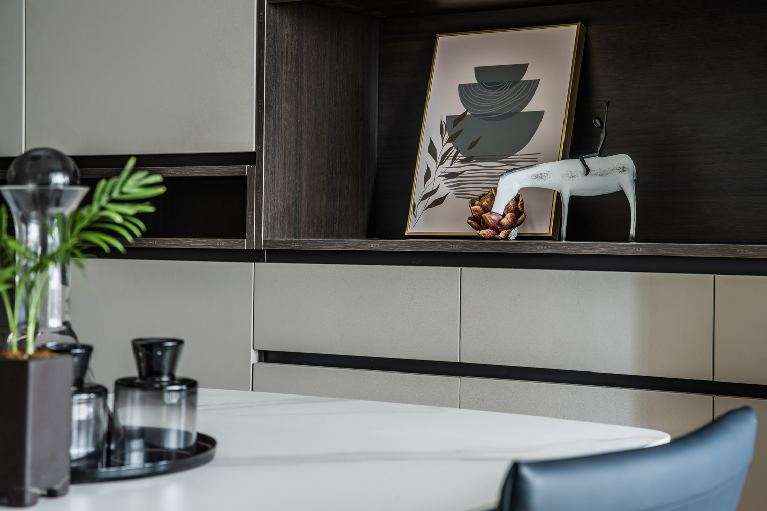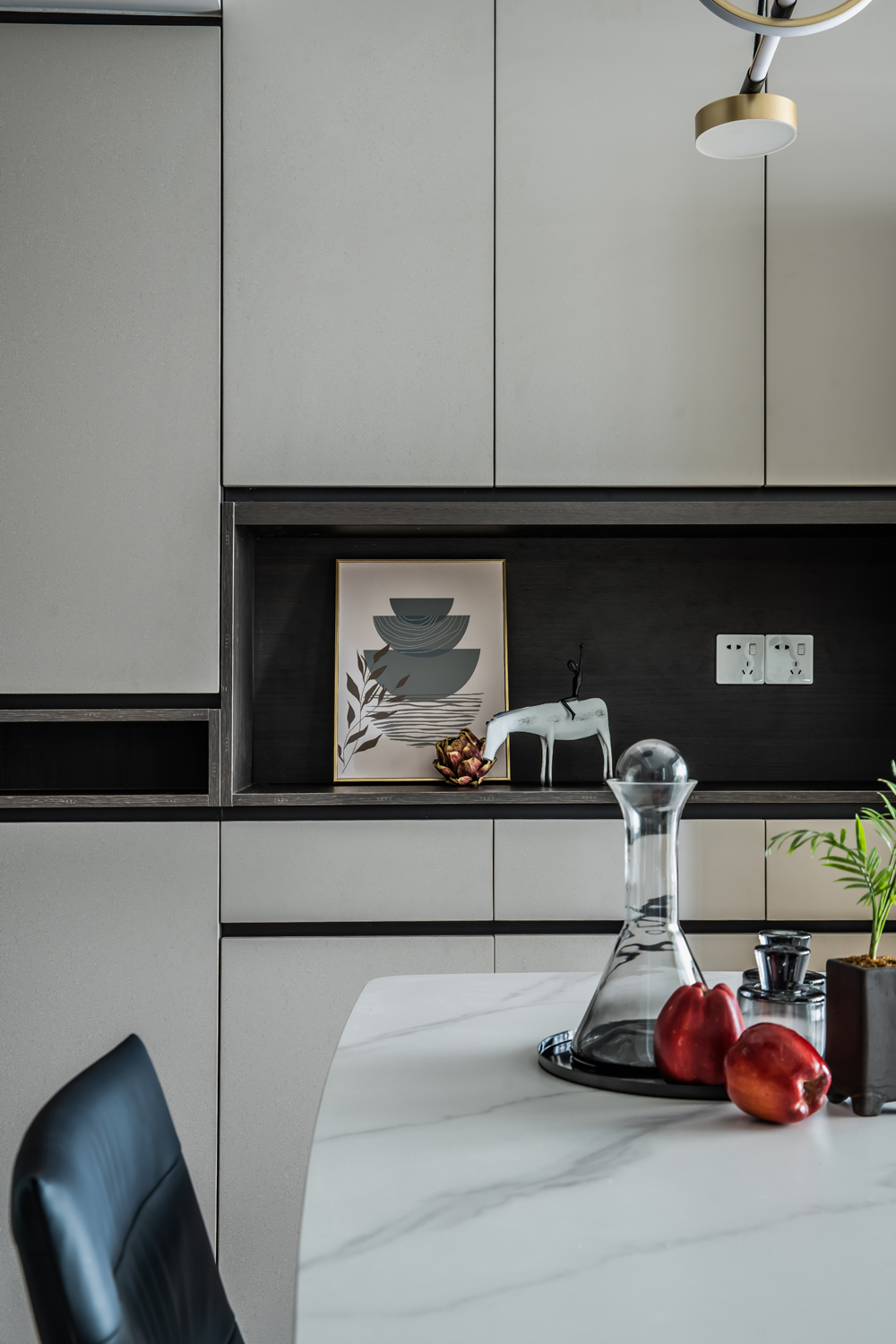 用餐区的背面放置精心挑选的配饰 它的材质色彩同沙发颜色 强调了空间上的对比与协调 为就餐提供了浪漫的氛围