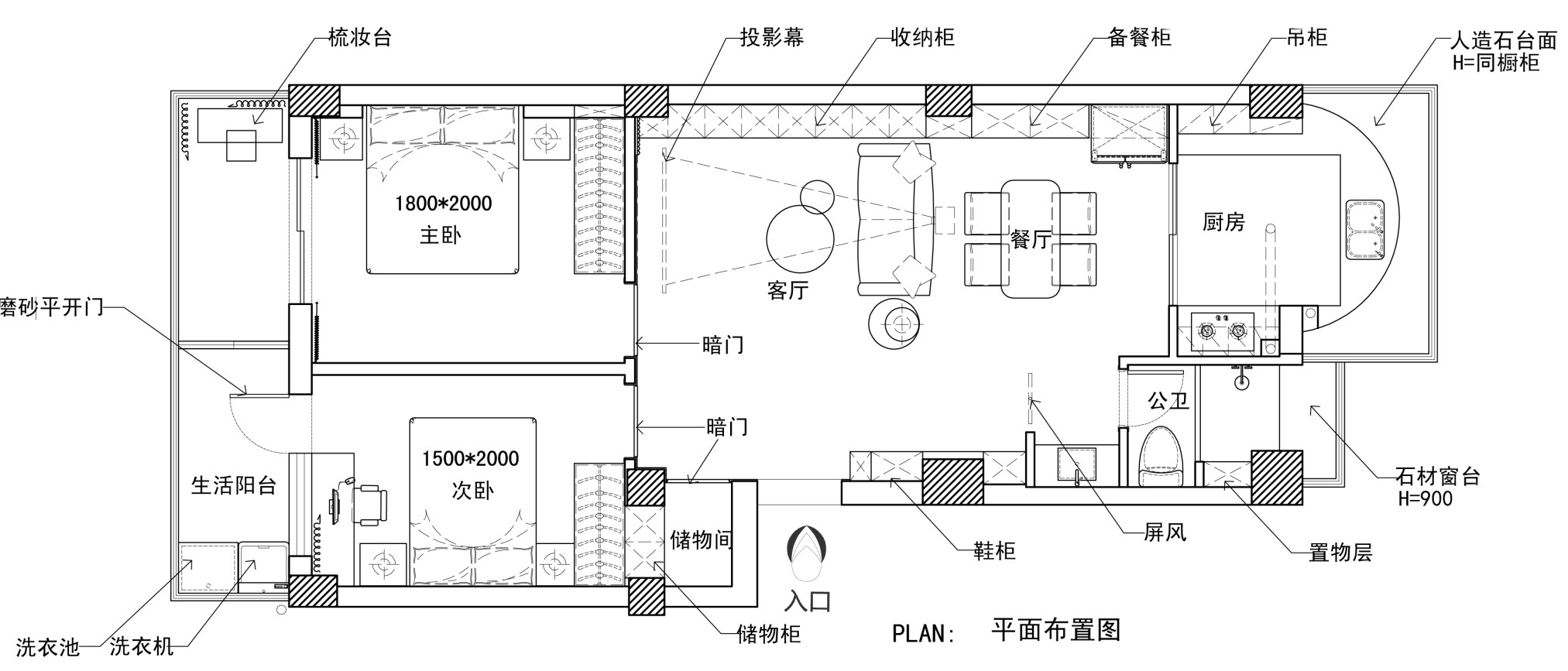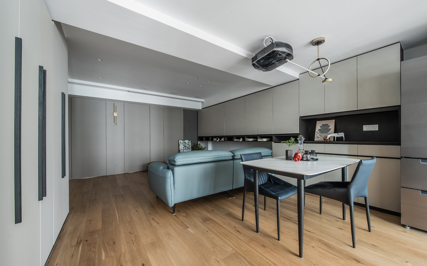01 客厅 LIVING ROOM 将原有左边卧室墙体移位 将此墙作为客厅观影墙 设计师考虑到本身空间的狭小 采用隐形门与背景墙结合的设计手法 增强了空间的尺度感