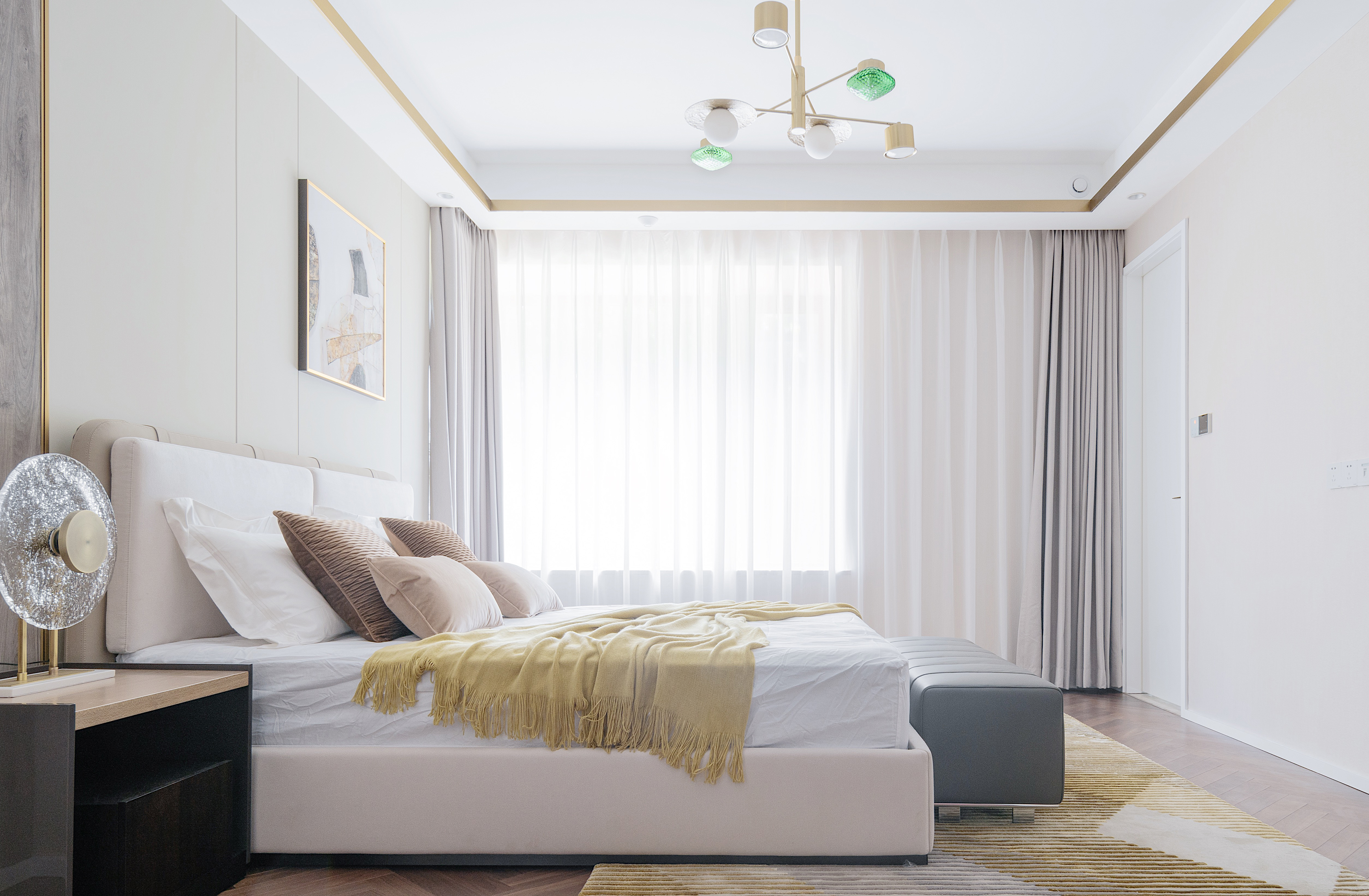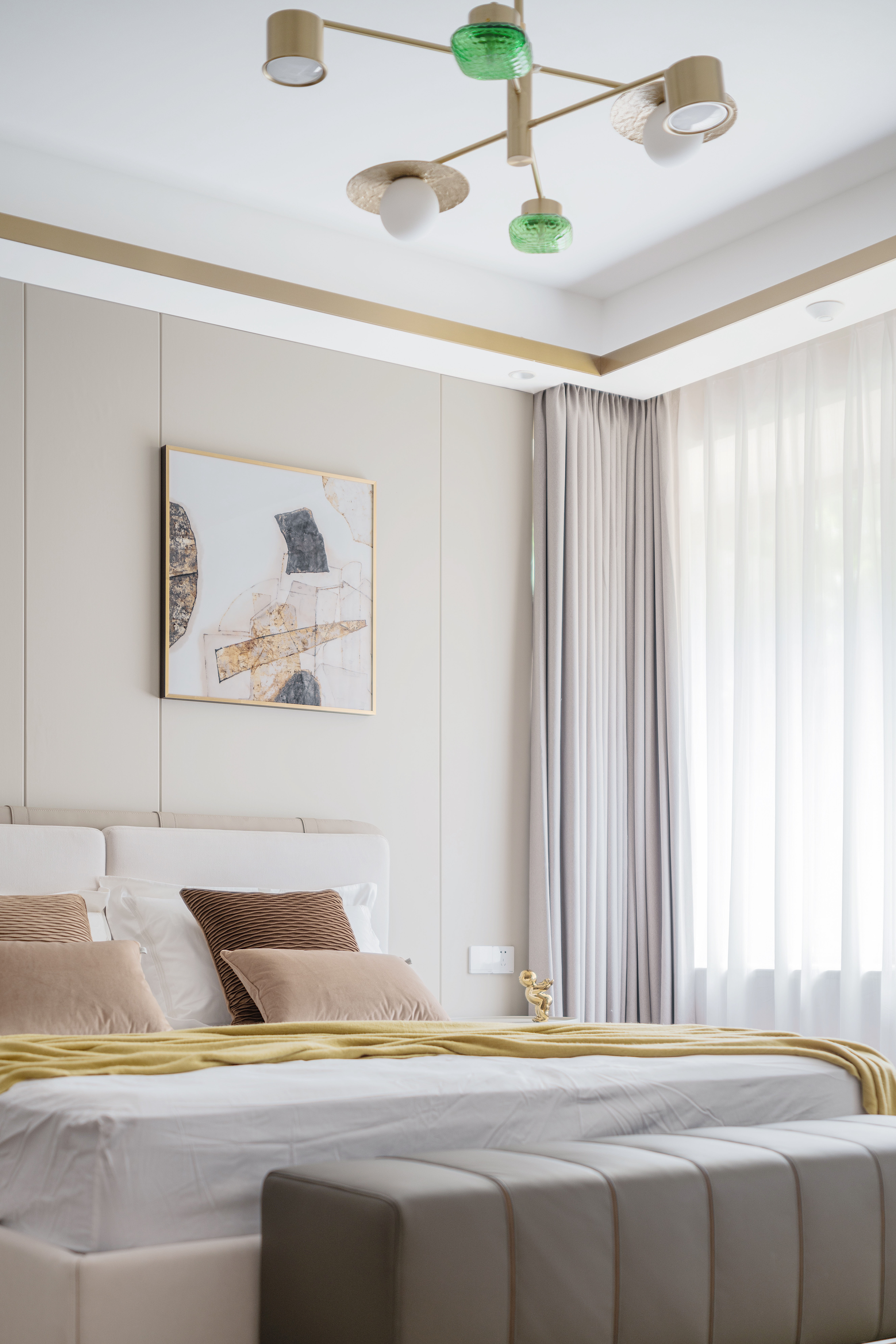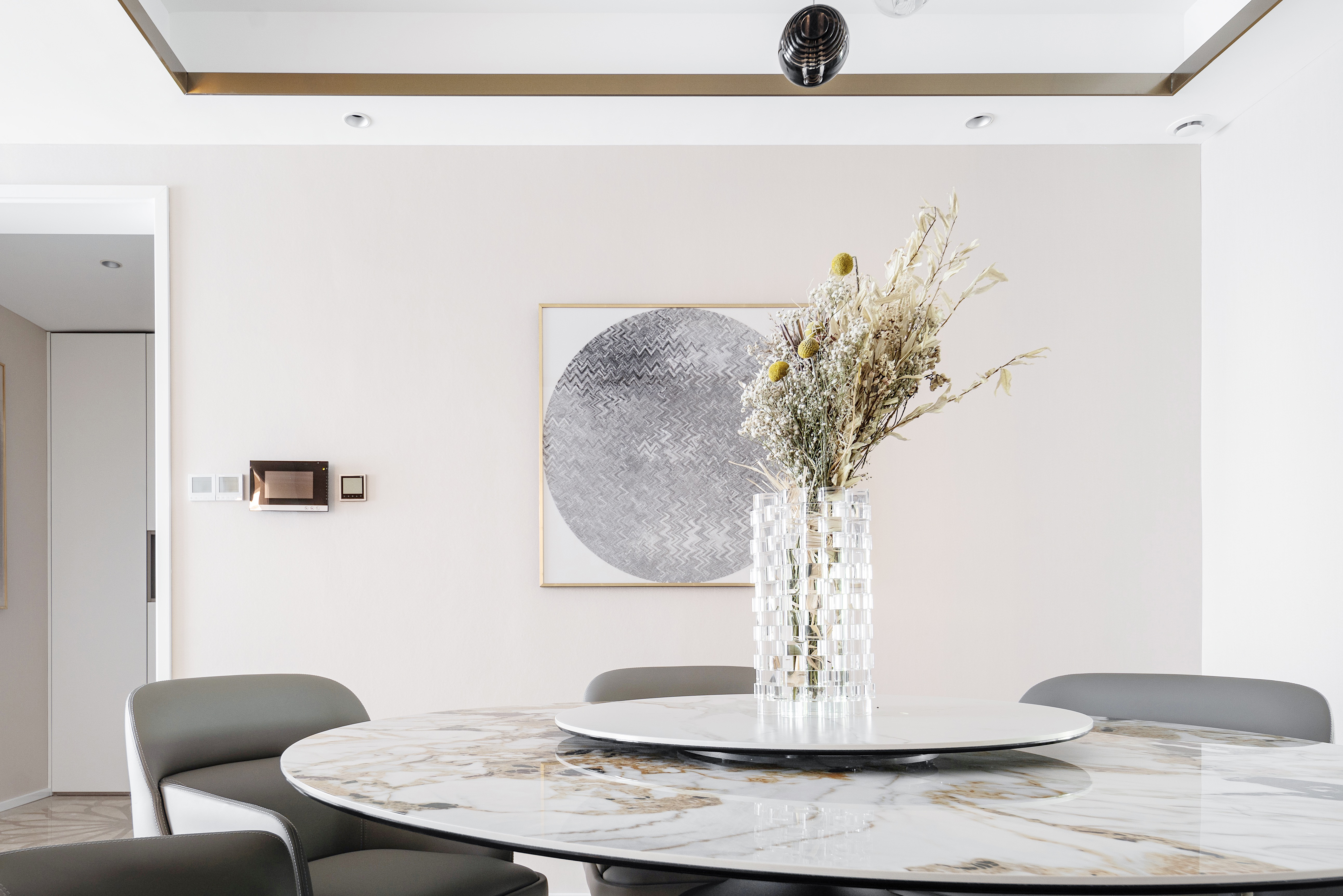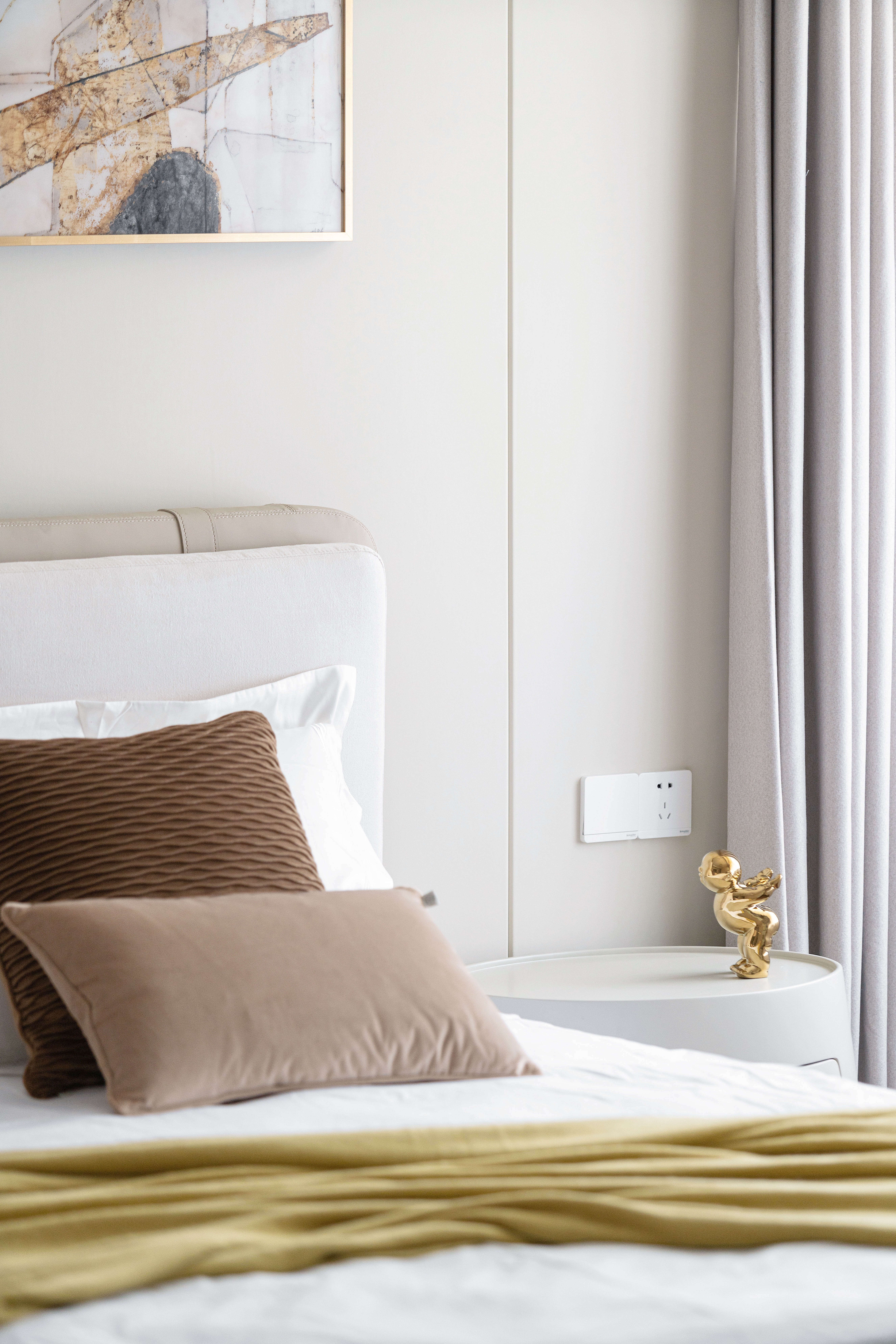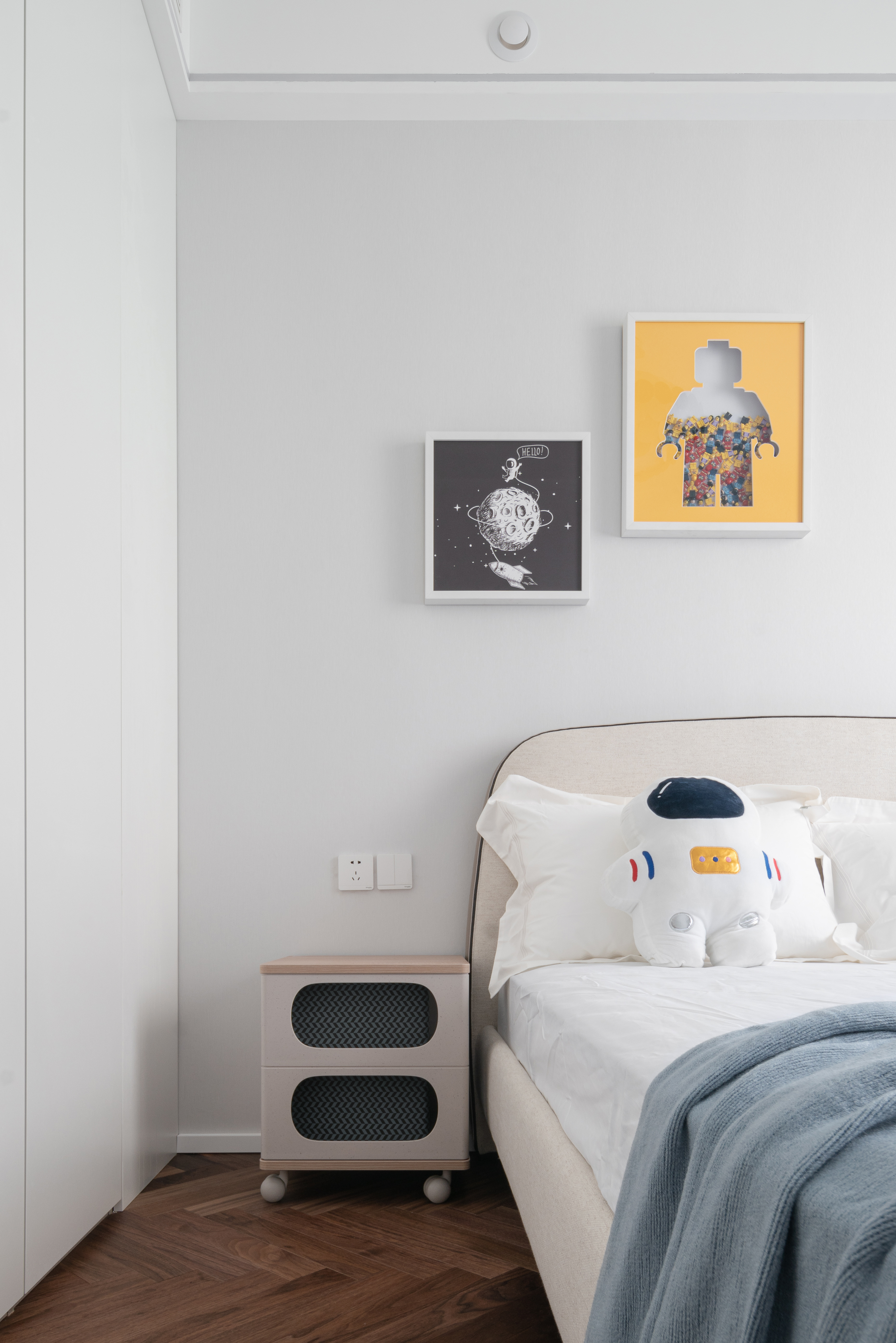 玄关: 玄关处进门右手边做了玄关柜,柜子颜色为白色,柜子并未全部做成封闭的,中间留了一格放置钥匙等物品,非常方便,柜子接地与顶定制做的,收集鞋子等物品,起到干净整洁的作用。 客厅: 客厅吊顶采用金属线条包边,电视背景墙选用岩板,沙发为米色布艺,搭配蓝色、驼色等抱枕,单椅为白色可旋转,自由舒适,对面半圆形椅子为黑白格布艺,底下半圆可自由旋转,茶几为长方形,茶几底部为金属,包括茶几上搭配的摆件都为金属制,尽显轻奢风格,桌上配有白色和电视柜上不规则花瓶,艺术感强烈,两个圆形沙发旁配有不规则角几,为咖啡色,底部黑色,沙发旁的落地灯由石材、金属、等元素制成,视觉感很强。 地毯主要为米色加蓝色,和沙发抱枕相呼应,条纹形状,简单又不失设计感。 餐厅: 餐厅选用圆形餐桌,搭配大理石花纹,给人高端的感觉,餐椅为灰色,桌上搭配玻璃花器,具有干净大气质感。 主卧: 主卧整体尽凸显轻奢元素,吊顶金属线条的装饰感,床头墙面为咖色和金属线条的装饰,在床头柜后的墙为木纹色,床主要以米白色为主,镶嵌式床垫,搭配米白色枕头、驼色抱枕、腰枕、黄色搭毯,在床尾配有灰色床尾凳,床头挂画都以金色裱框搭配,黄色条纹装地毯等营造了温馨、舒适的家的感觉,融入之中,生活气息浓重。 儿童房: 小儿子的房间进门左手边是衣柜,衣柜开关方式为按压式,颜色与玄关柜相同都为白色,墙体为白色没有过多装饰,床选用是的嵌入式床垫床,颜色为米白色,床品统一为白色,搭配了枕头和抱枕、蓝色搭毯等,床头柜为滑轮式可方便移动,墙上、床上搭配了孩子喜欢的宇航员、星球、火箭等元素、