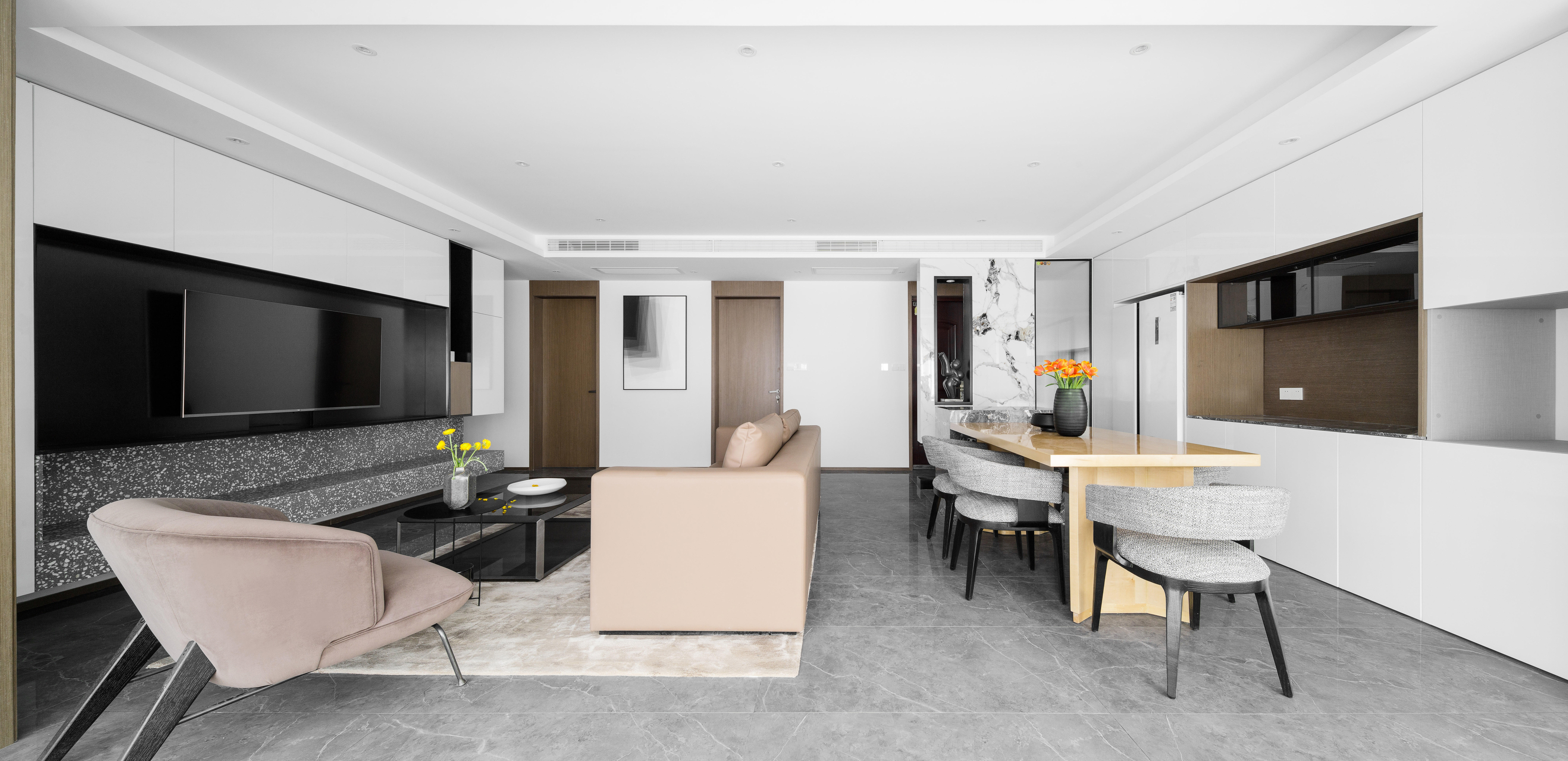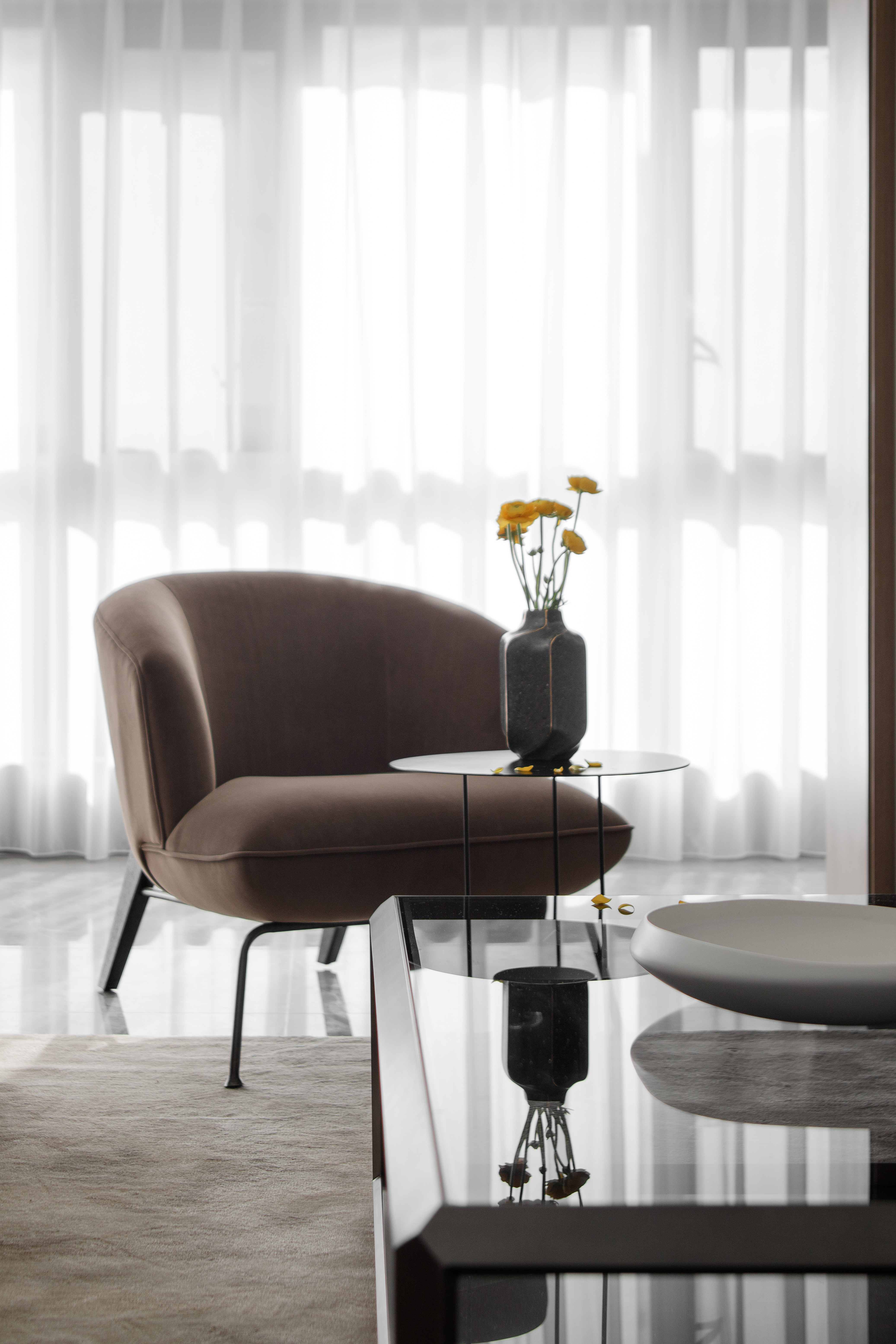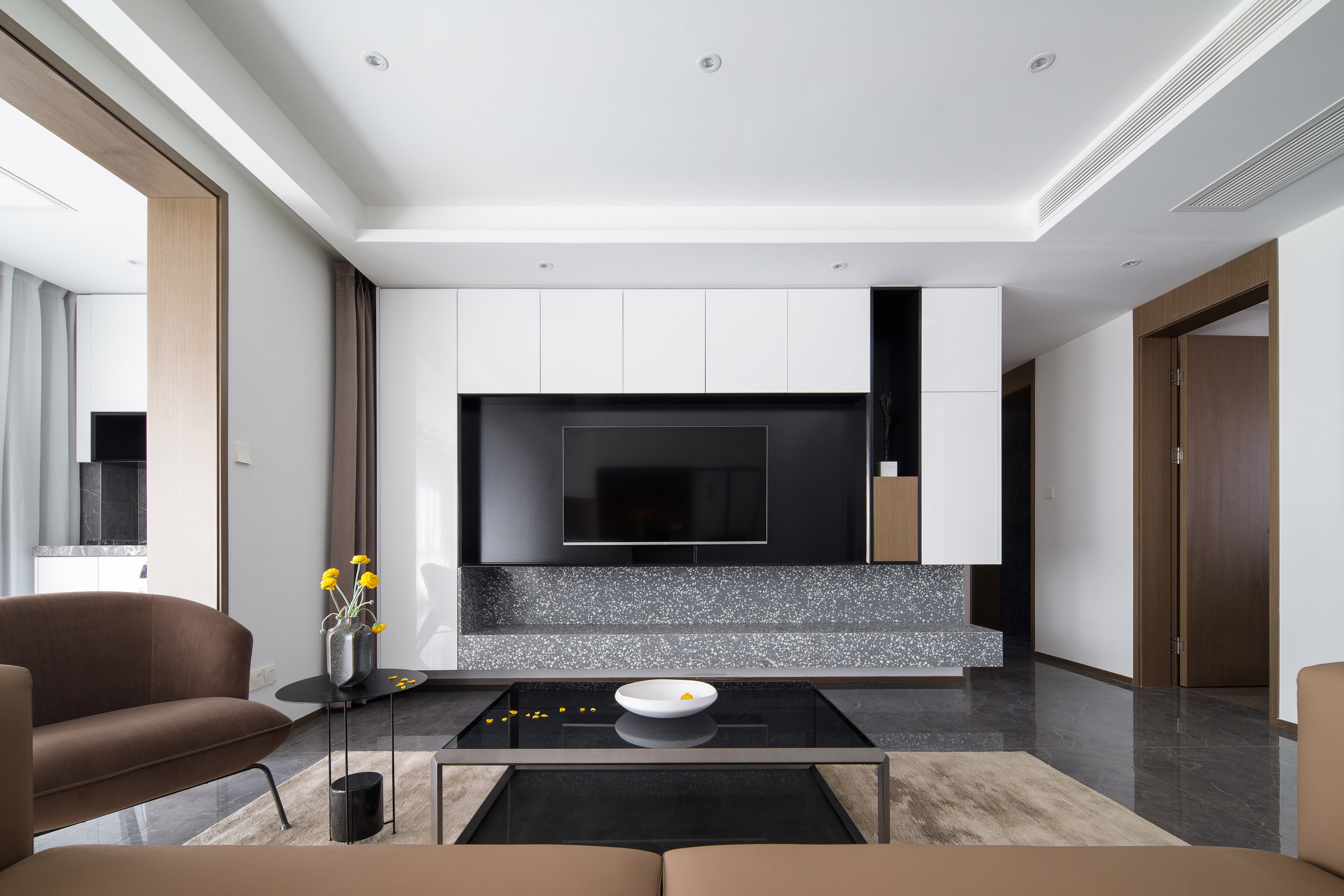 考虑到业主本身的居住习惯,木赢团队将主卧布局在了最内部的位置,衣柜连接梳妆台,充分利用空间,卫生间干湿分离。客餐厅联结在一起,背后是儿童房,休息和学习的地方,公共区域与私密空间彼此独立又相互联系,每个独立空间的内部又有更细致的功能分区,宛若一个奇妙的生活万应屋。 客厅是待客之地也是放松之所,保持“宽敞感”是提升舒适度的奥义之一。整个客厅没有复杂的装饰,木赢设计团队用了许多种搭配方式来让客厅更有层次与质感。电视背景墙部分留白,打造视觉层次感,电视采用了嵌入式的设计。连通一面墙的水磨石地台从视觉上打造了纵深效果。放眼看去,客厅不见杂物,配色大气简约,现代的镜面金属感茶、概念性十足的小边几和浪漫的白色花瓶,皮质沙发、黑色的电视柜,精美的布局,极富现代感的软装搭配,结合精致的墙饰、摆饰,勾勒出层次丰富的美感。为了更好的舒适性,所有空间都实现了自然采光,坐在客厅里,就好像来到了一个“自然生活方式体验馆”。