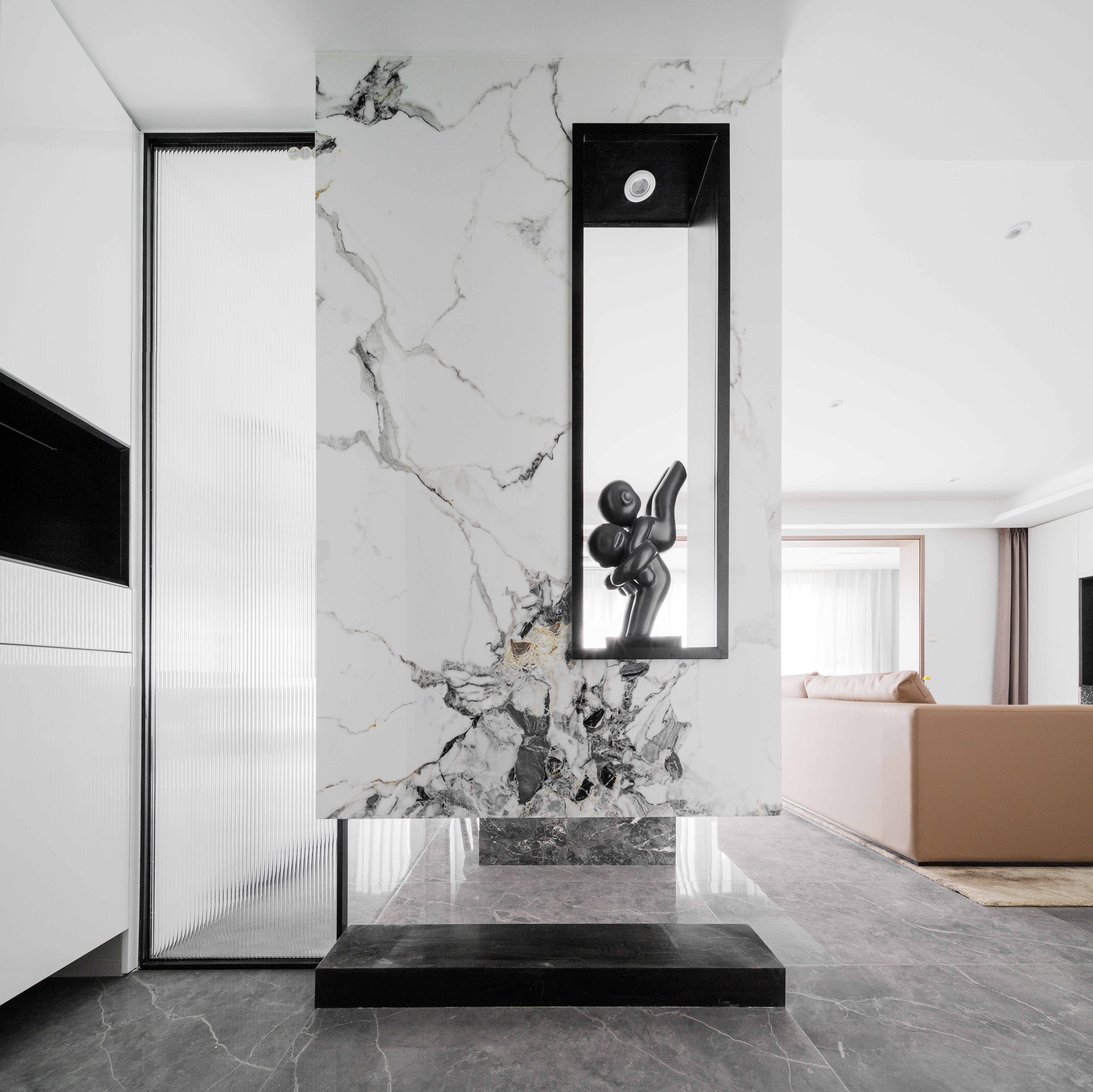 空间布局:入户宽阔的客餐厅,卧室互不干扰,这是设计师最喜欢的户型,于是对客餐厅做了敞开式的设计,没有增加隔断,仅仅是留出过人的通道,这样的动线是舒服的,人可以随意走动。唯一增加的就是入户的一个隔断,玄关端景岩板、金属、玻璃丰富的材质元素凸显大气的基调,摆上业主最喜欢的雕塑,给空间增添了互动的趣味性,相对于开门既见客厅的传统设计,既提升了空间利用率,又兼具一定私密感。考虑到业主本身的居住习惯,木赢团队将主卧布局在了最内部的位置,衣柜连接梳妆台,充分利用空间,卫生间干湿分离。客餐厅联结在一起,背后是儿童房,休息和学习的地方,公共区域与私密空间彼此独立又相互联系,每个独立空间的内部又有更细致的功能分区,宛若一个奇妙的生活万应屋。