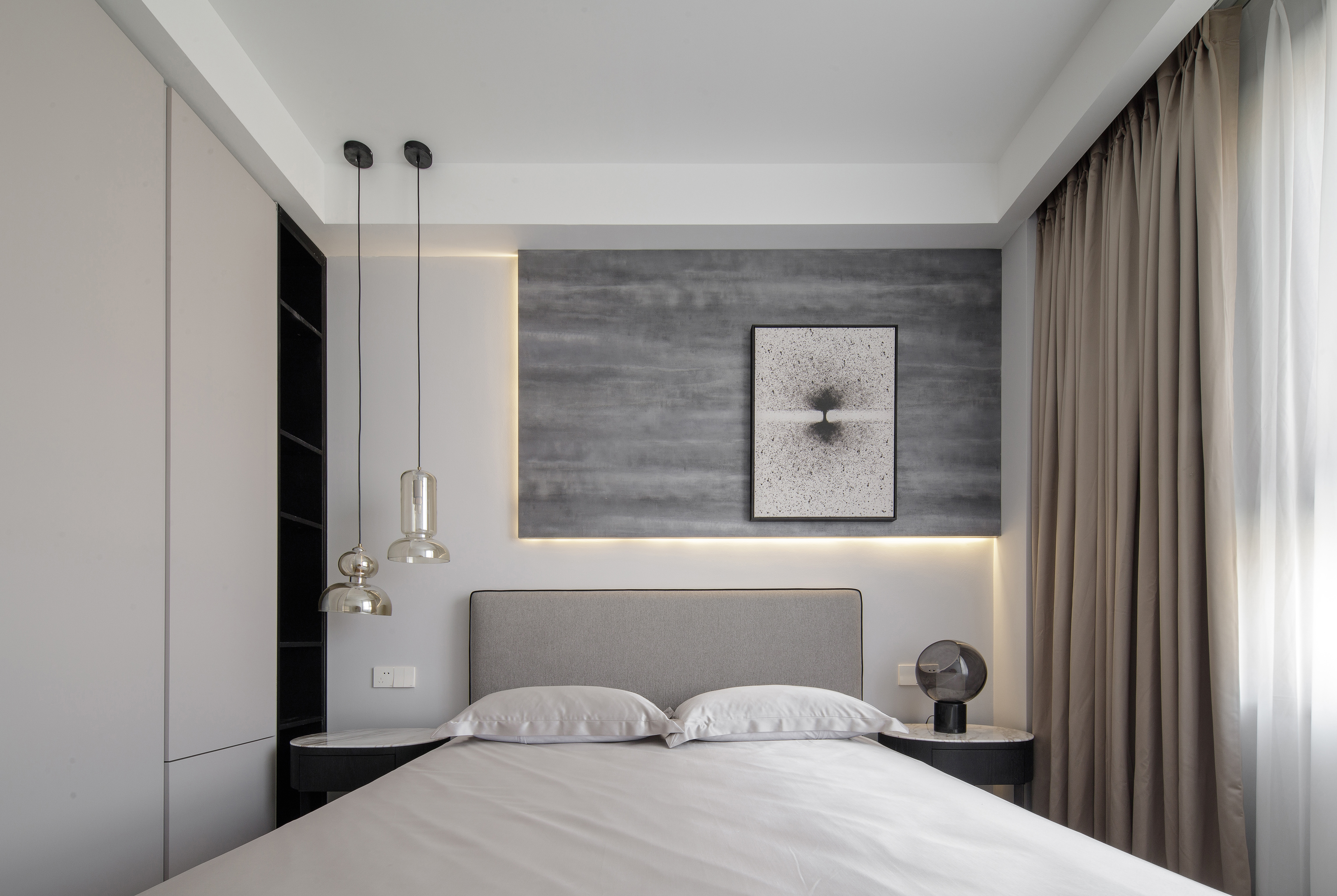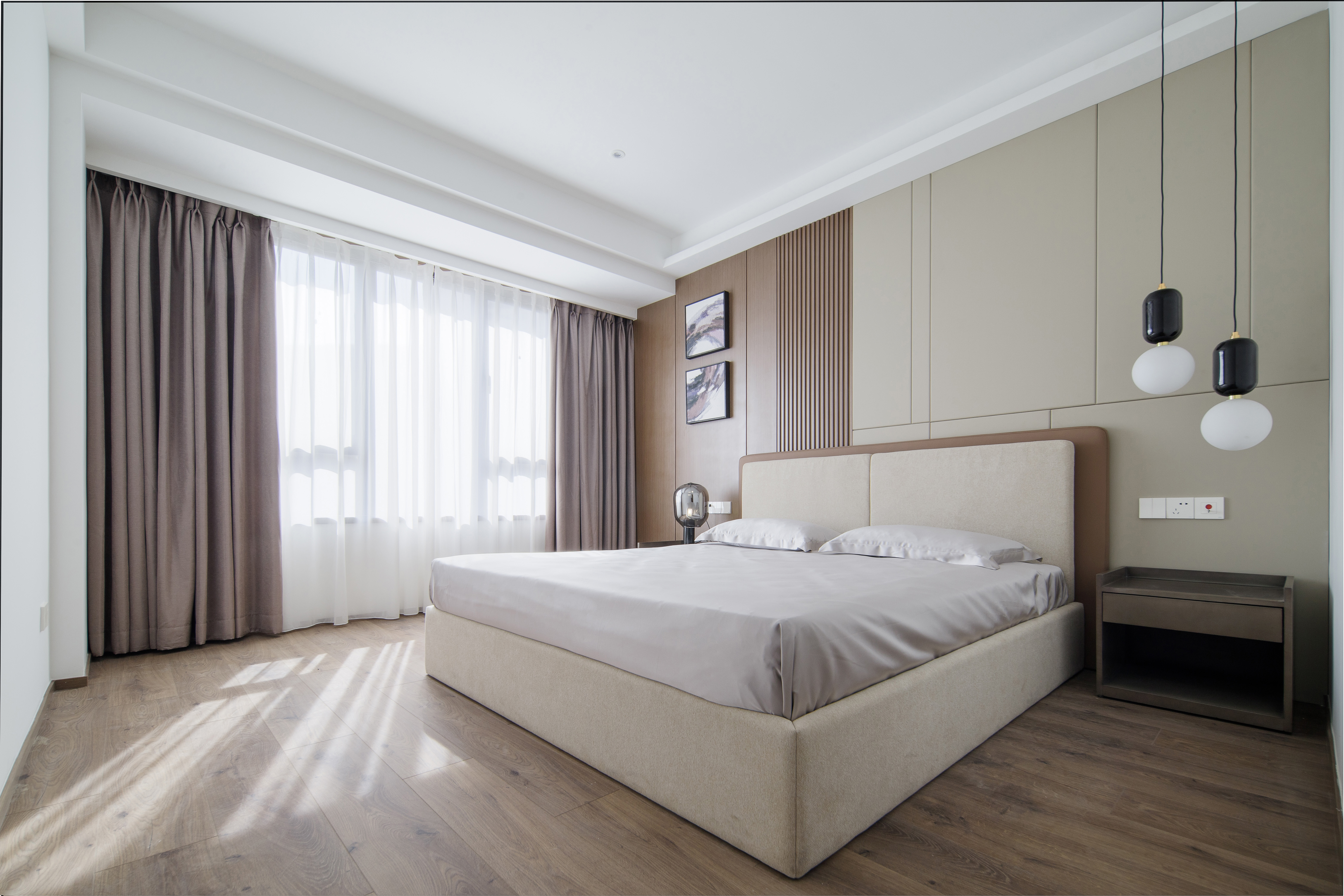 最能让人卸下一身疲惫的空间非卧室莫属,对于忙碌的男女主人来说,充实忙碌的生活背后,或许是归家后的疲惫。然而,木赢设计团队通过对主卧背景墙板加软包的造型设计,提升了空间大气基调。整体米咖色的色调,温馨安静。饰以精巧的灯具和挂画,为空间增添了几分精致。这样的家一定是可以慵懒的、私密的、随心的一方天地。让人在家也能像度假般惬意。