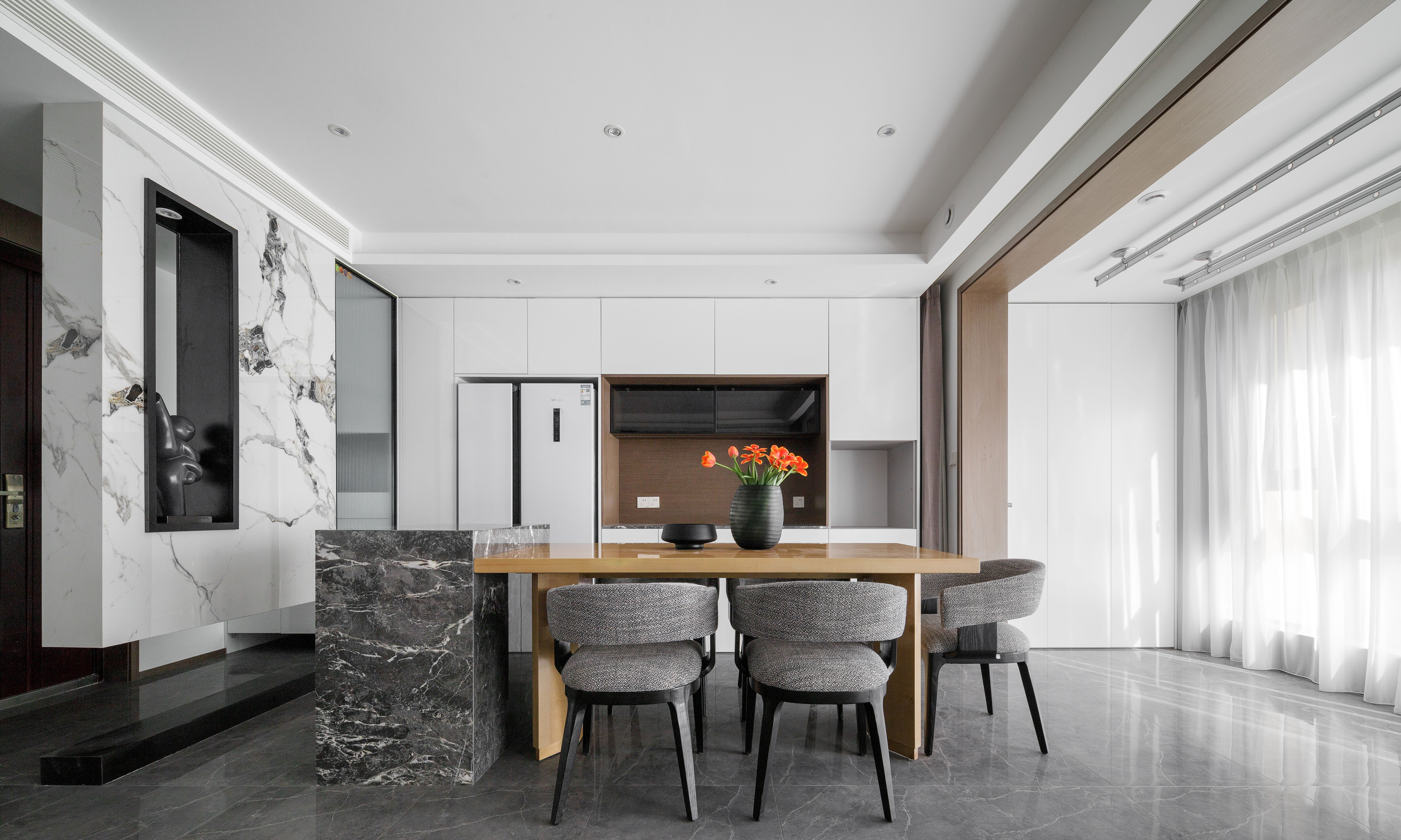 位于龙湖香醍璟宸业主罗先生的家,宛若隐于都市森林中的疗愈之地。整套住宅大面积采用了质感温润素雅的原木色与白色,营造出令人倍感舒适的居住氛围,围绕着居住体验,木赢设计团队对整个家的空间进行了更为合理的规划。入户宽阔的客餐厅,卧室互不干扰,这是设计师最喜欢的户型,于是对客餐厅做了敞开式的设计,没有增加隔断,仅仅是留出过人的通道,这样的动线是舒服的,人可以随意走动。唯一增加的就是入户的一个隔断,玄关端景岩板、金属、玻璃丰富的材质元素凸显大气的基调,摆上业主最喜欢的雕塑,给空间增添了互动的趣味性,相对于开门既见客厅的传统设计,既提升了空间利用率,又兼具一定私密感。