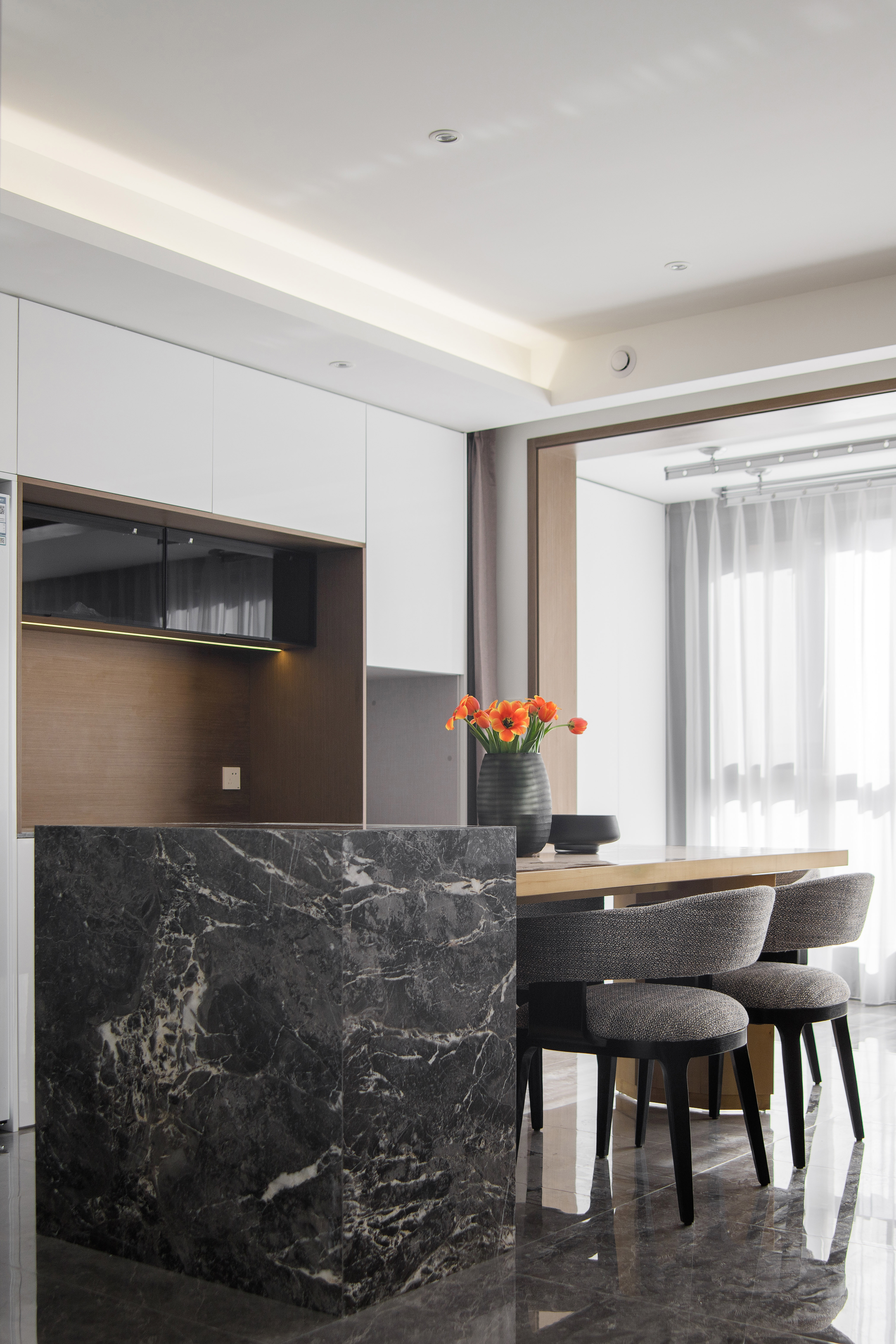 餐厅规整地分隔在一个区域,打通式的设计不仅令整个空间更显开阔,同时营造了一个更利于人们交流的待客空间。整面通顶的储物柜,满足收纳功能的同时也配合灯光玻璃柜增加了美学展示,颇有一种小清新的韵味。白色不同于色彩斑斓,没有视觉上的绝对冲击,搭配着开放式的橱柜,有了一种Muji的日式风格。家的美好很多时候从餐桌开始,餐桌加岛台的设计,跟爱人一起品品茶,陪伴孩子做些手工,满足多种功能需求既实用又增添了情感交流的温馨氛围。家中有了烟火气息,生活自然能够张弛有度。快节奏的都市生活里,偶尔也要放慢脚步,复刻几道记忆中的美味,犒赏认真生活的自己。