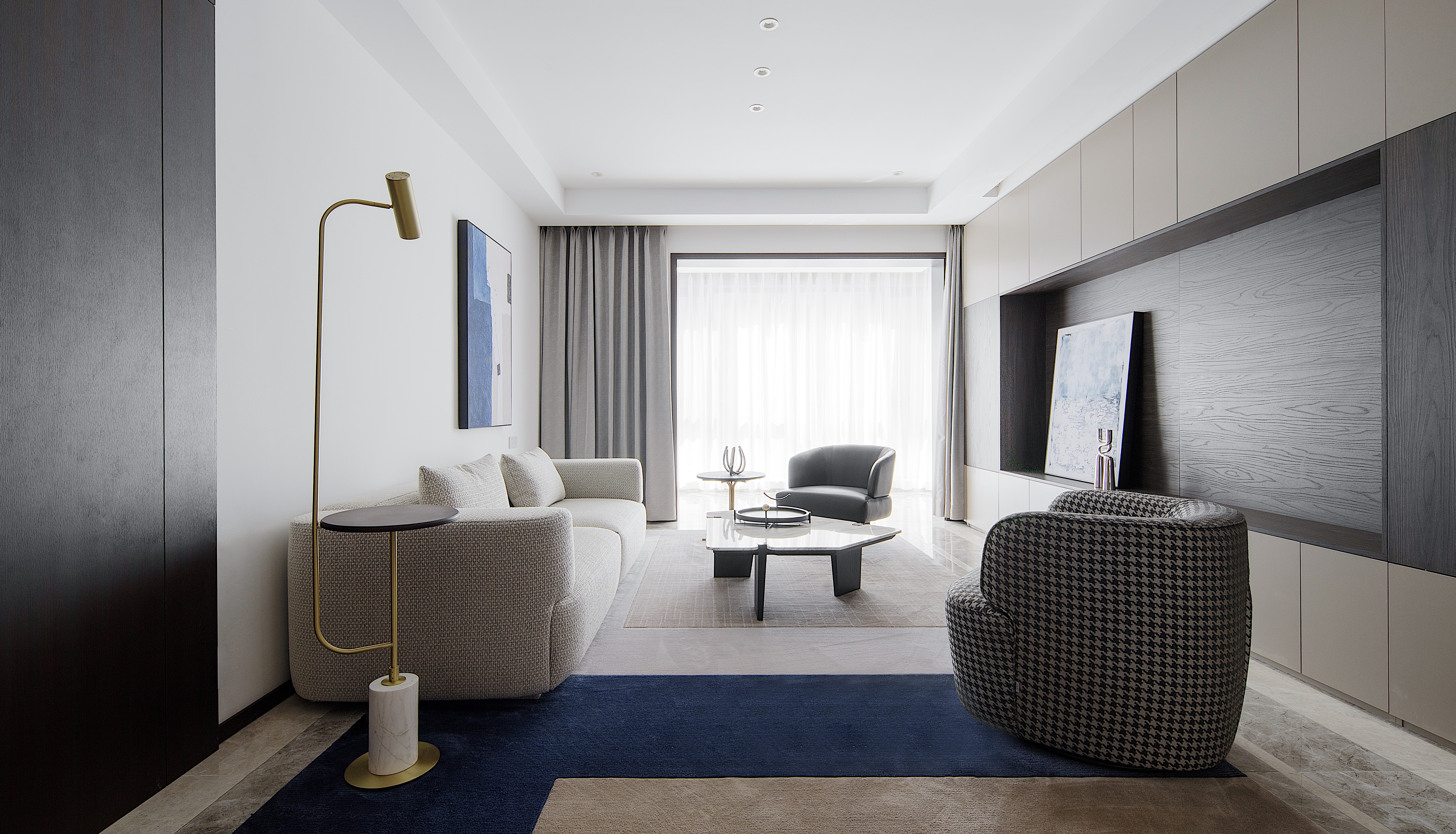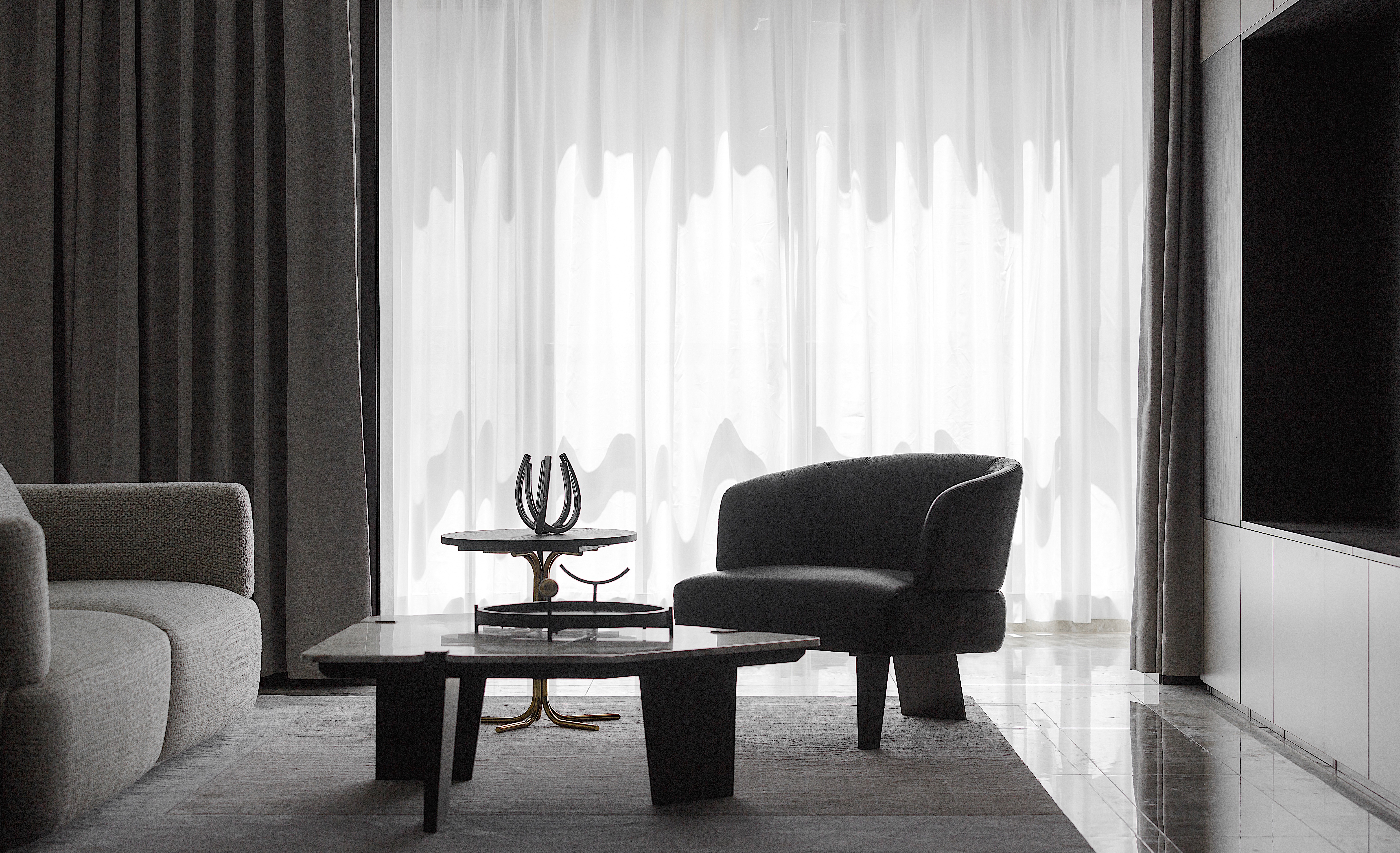 米色大肌理沙发 细节质感非常高级 搭配黑色荔枝纹单椅 低调稳重 略带光泽的千鸟格面料转转椅 既时尚又有趣 大理石不规则茶几增加整个客厅空间的艺术性 黑色果盘实用好看 亮光金属色花器起到点睛的作用