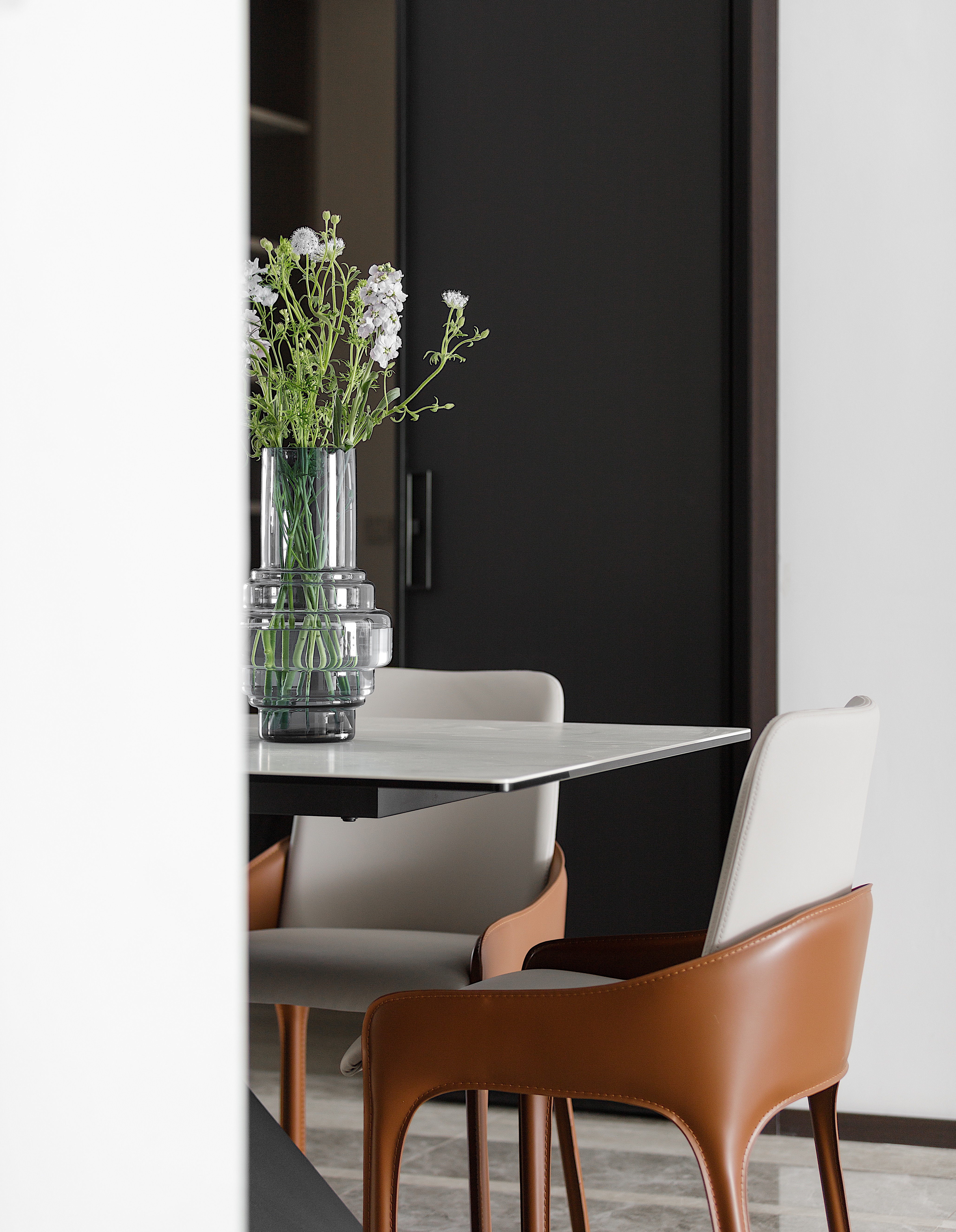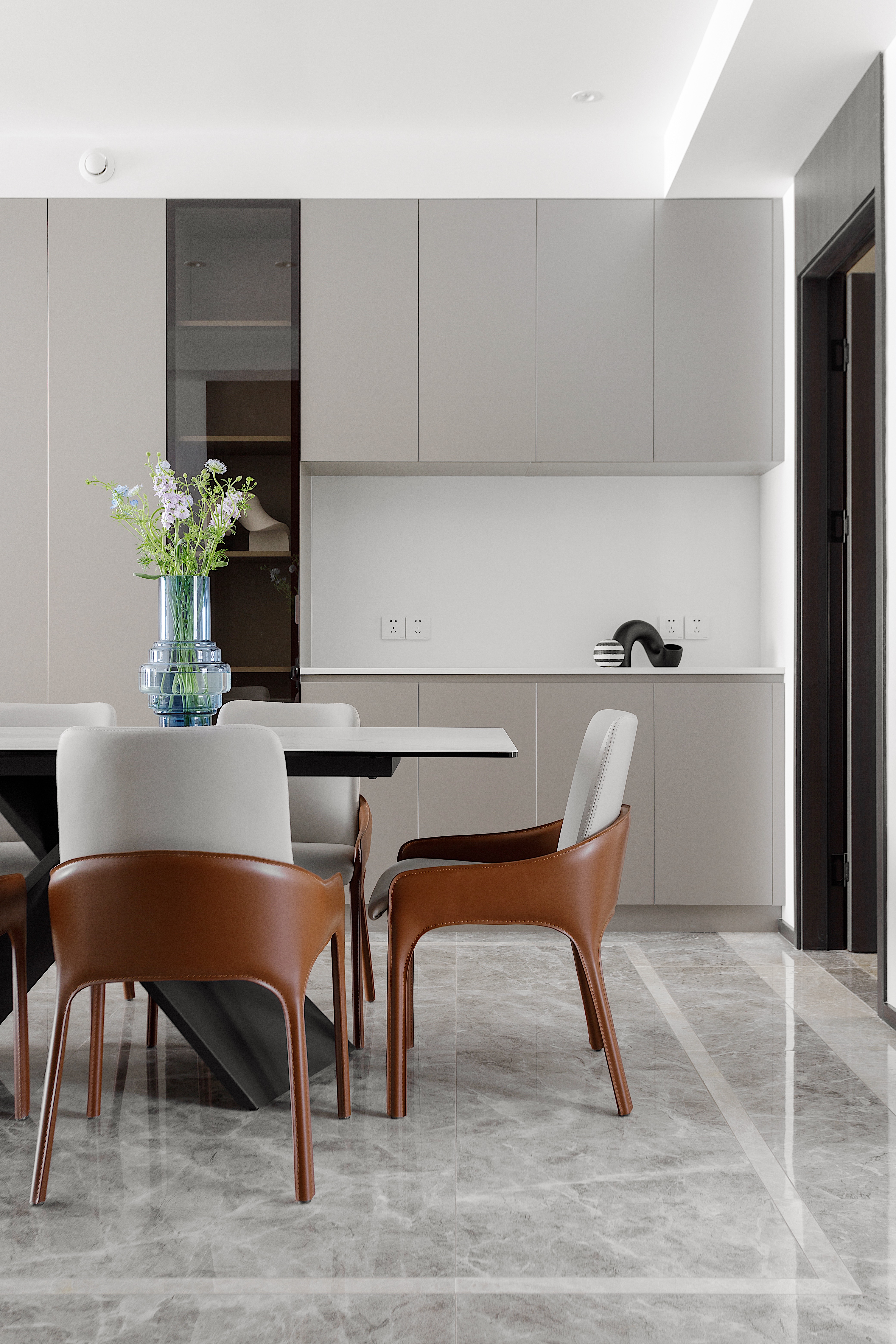 X型交叉底座餐桌 设计感十足 桌面为卡拉拉岩板 新型材料的使用 符合整体空间的现代语境 橘色靠背餐椅活跃餐厅就餐气氛