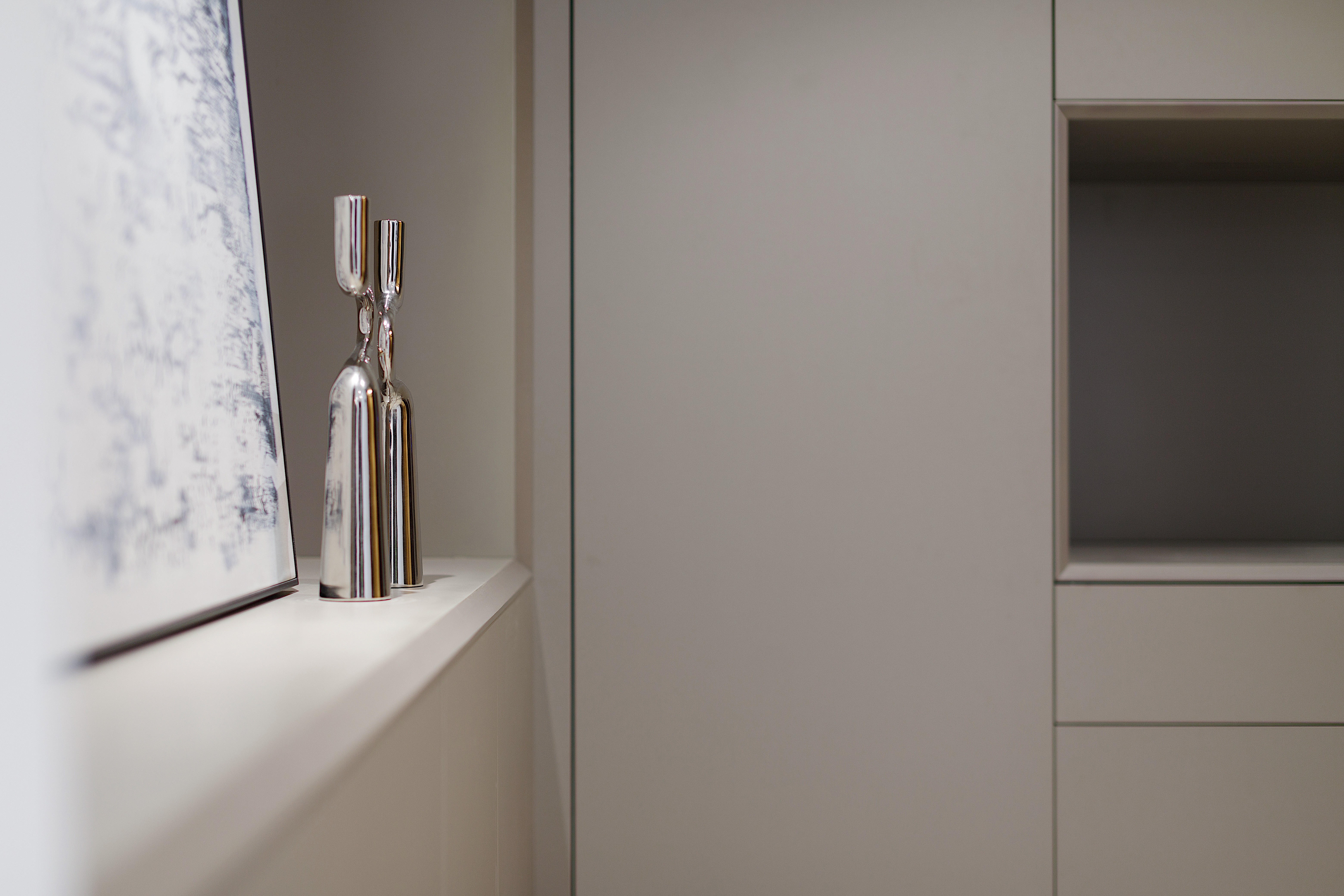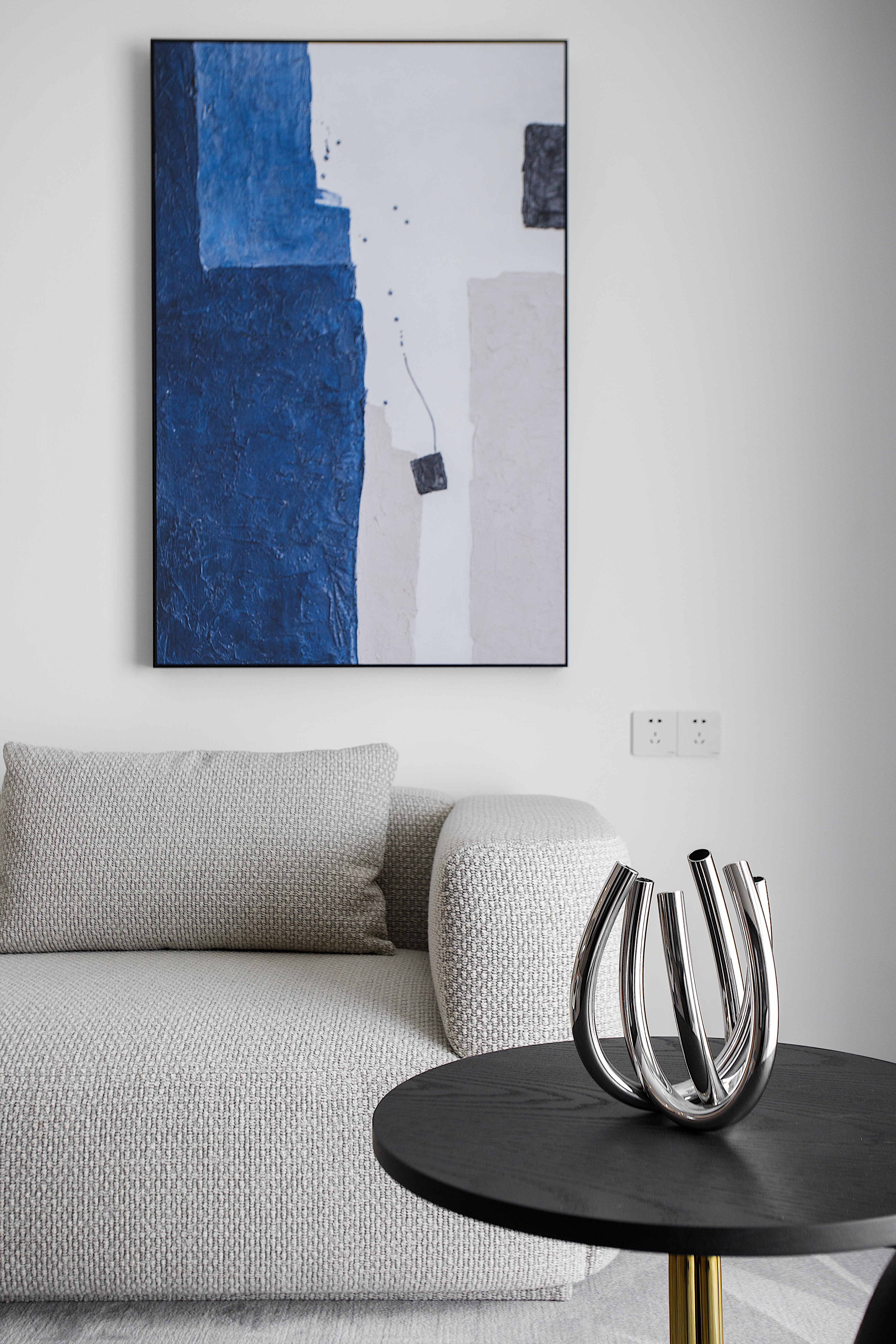 门口做衣帽柜及鞋柜 衣帽柜内增加紫外线消毒功能 疫情之后对居住方式的思考 蓝色抽象挂画 与整体色调呼应 进门清新愉悦的感觉