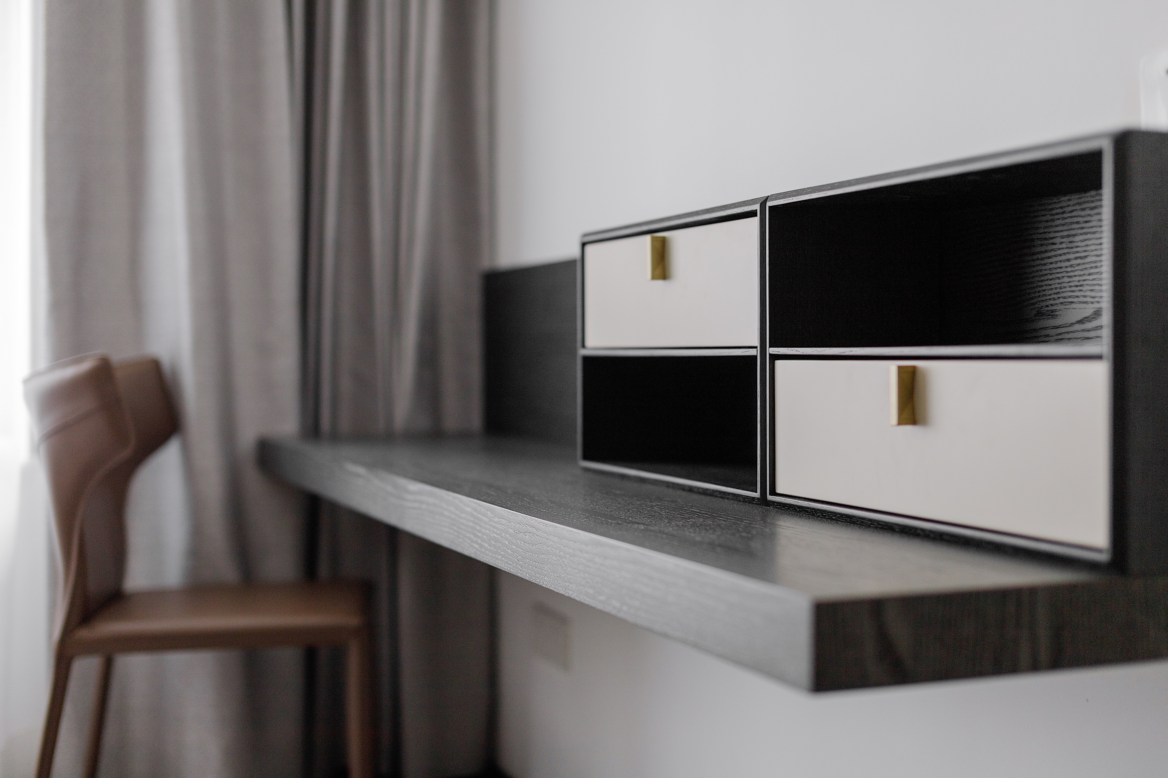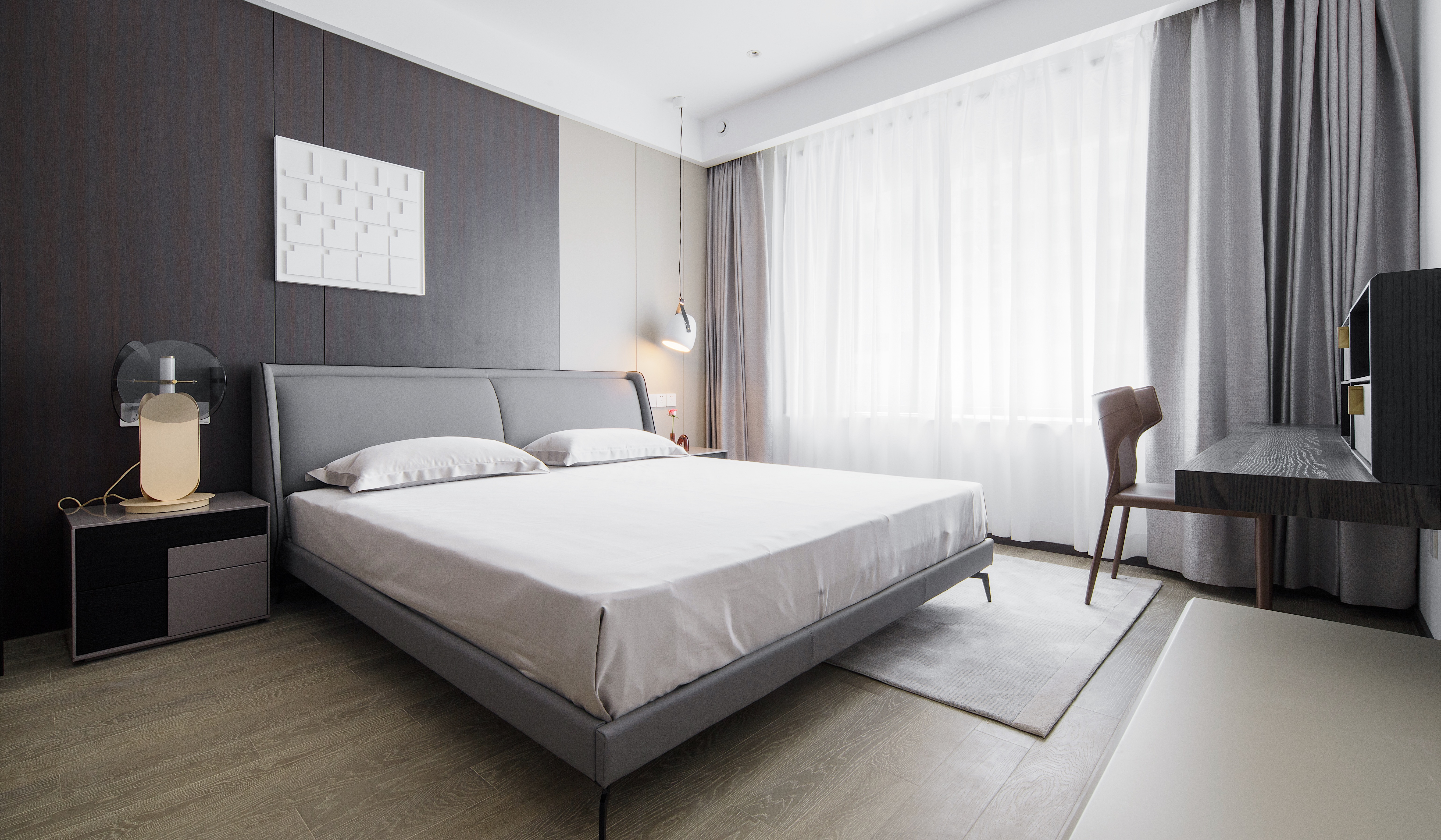 黑橡色护墙板与硬包结合 现代味十足 搭配灰色经典款式双人床 白色艺术装置提亮整体空间的色调 双人床对面悬空书桌 既有设计感也十分实用 满足女主人梳妆需求及简单办公需求 背靠背双面衣柜 大大增加了主卧的储物功能