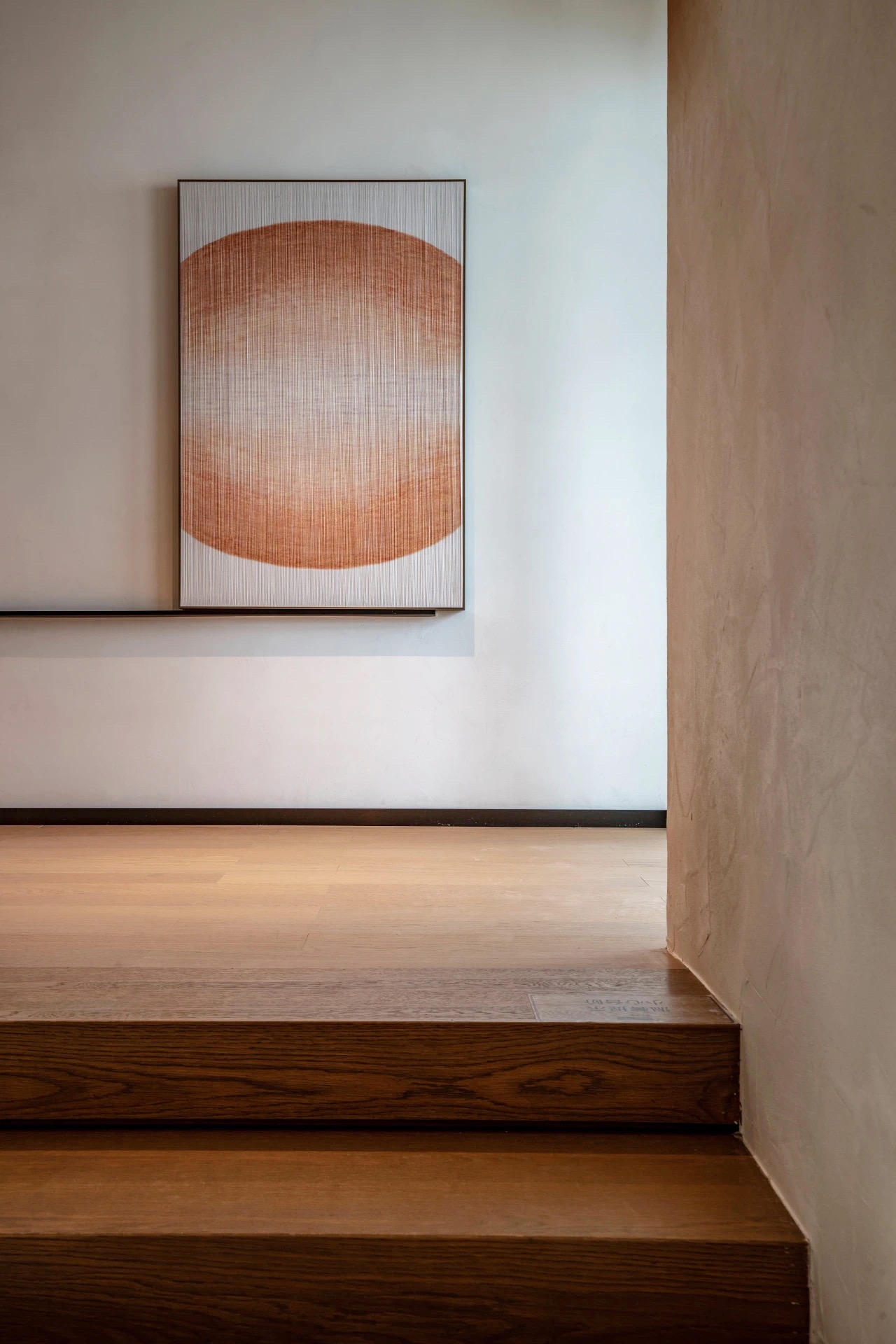 整个空间,设计不刻意强调存在感,以木为主材应用。原木主色调,配以原始纹理涂料,辅以单色冷、暖色灯光,让空间愈加纯净。