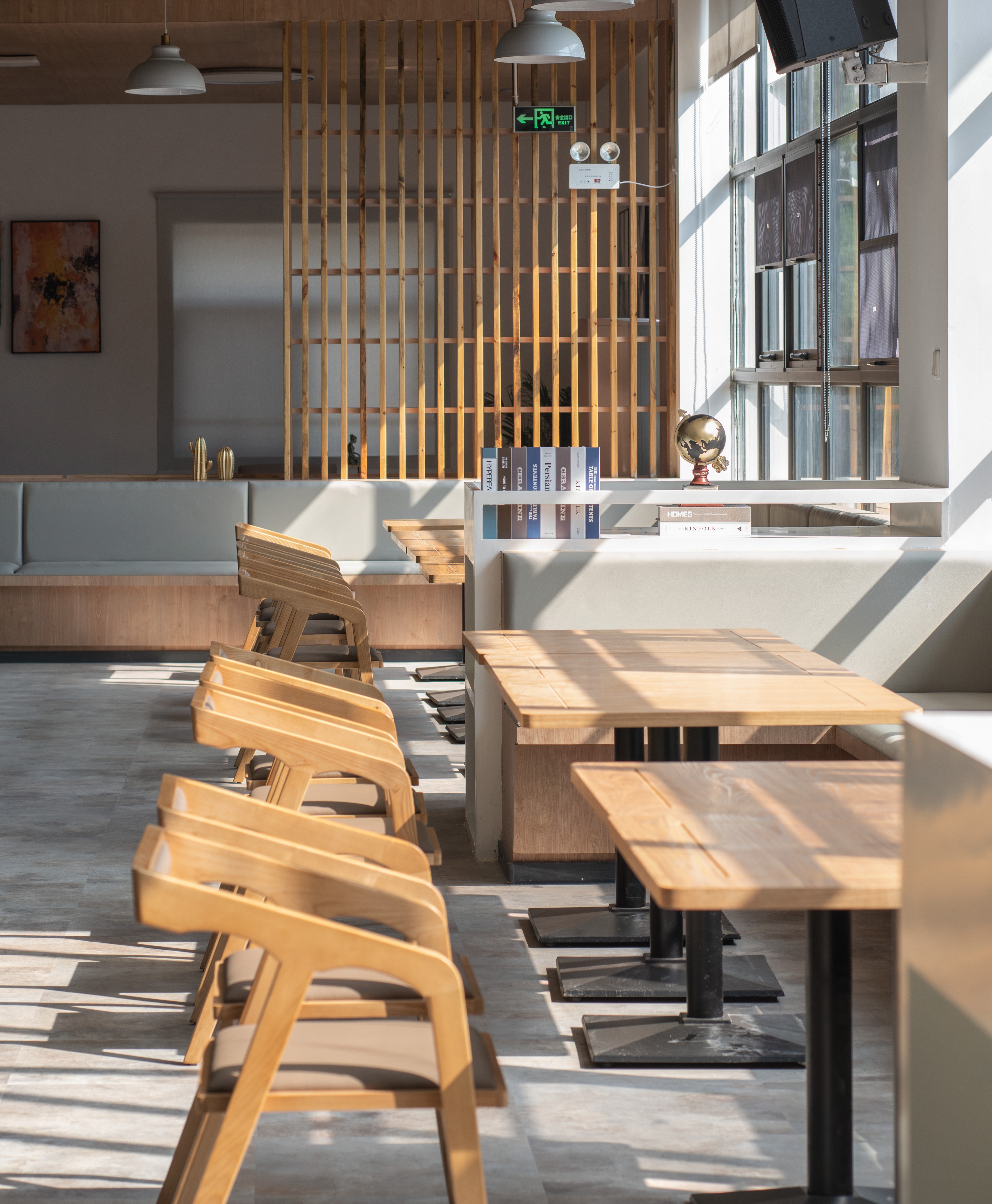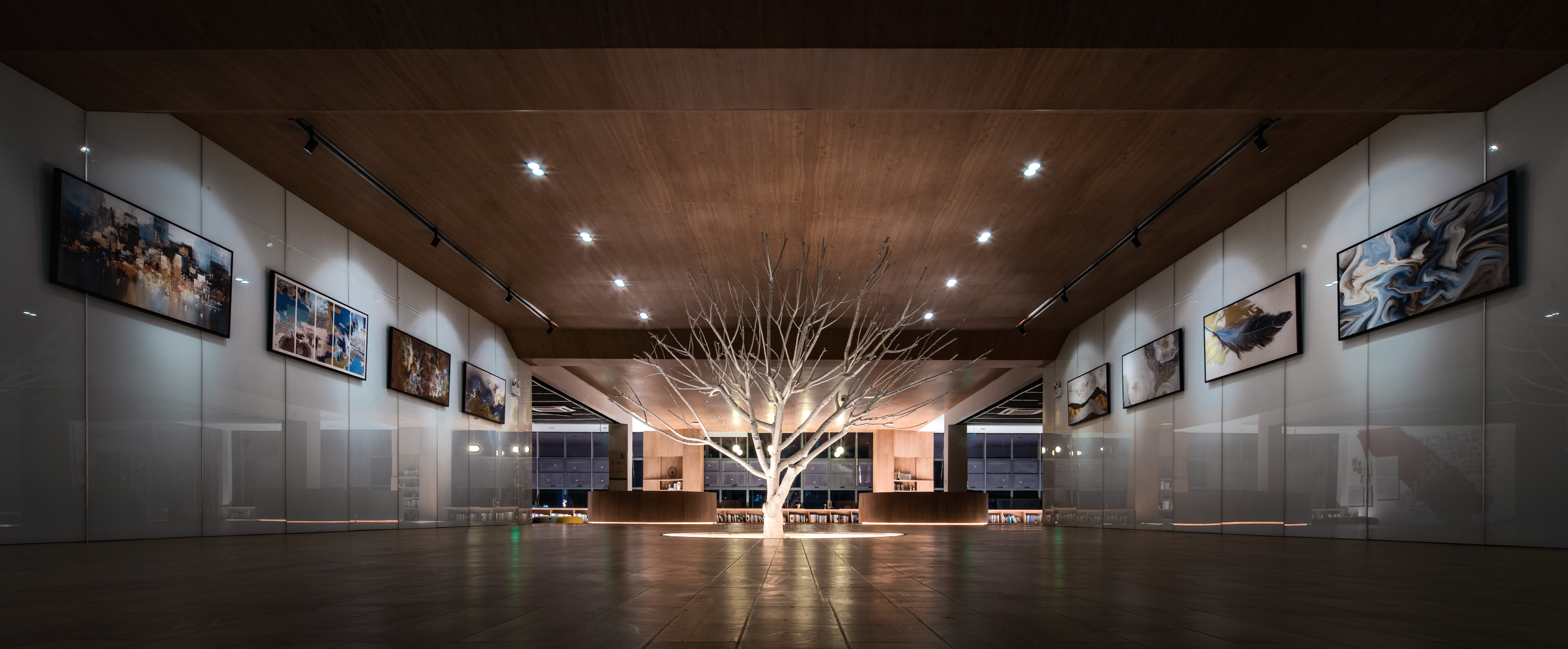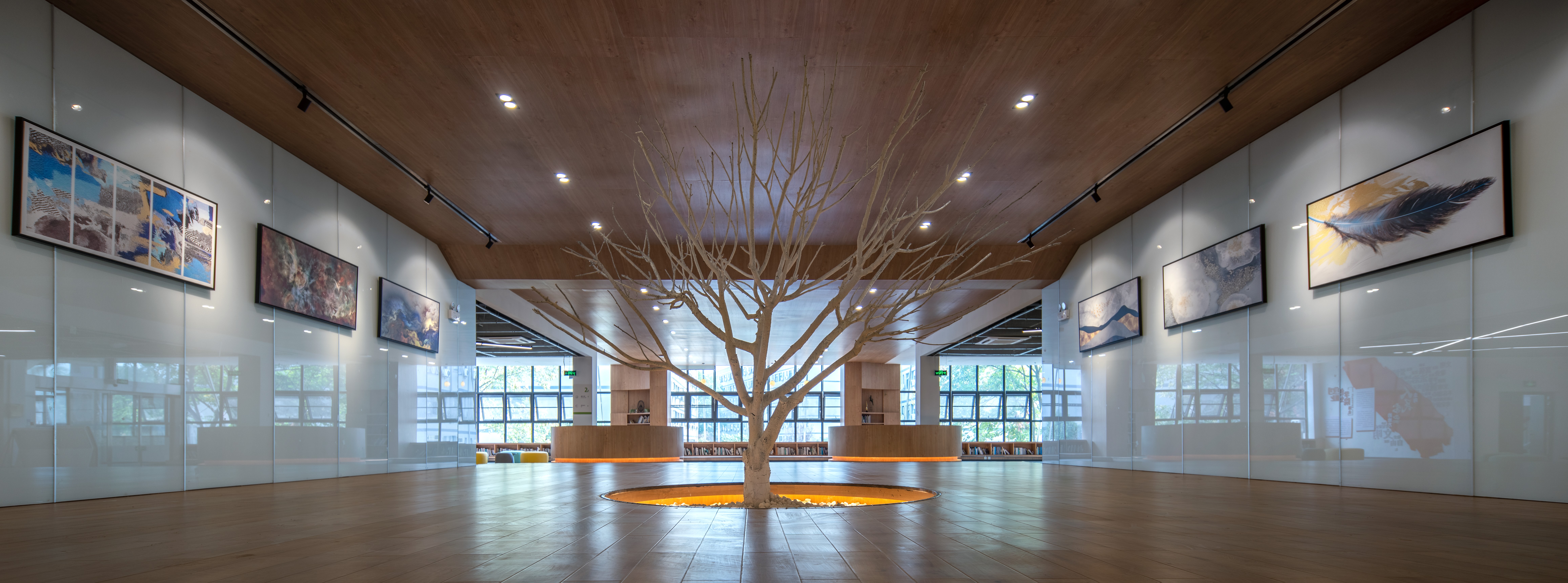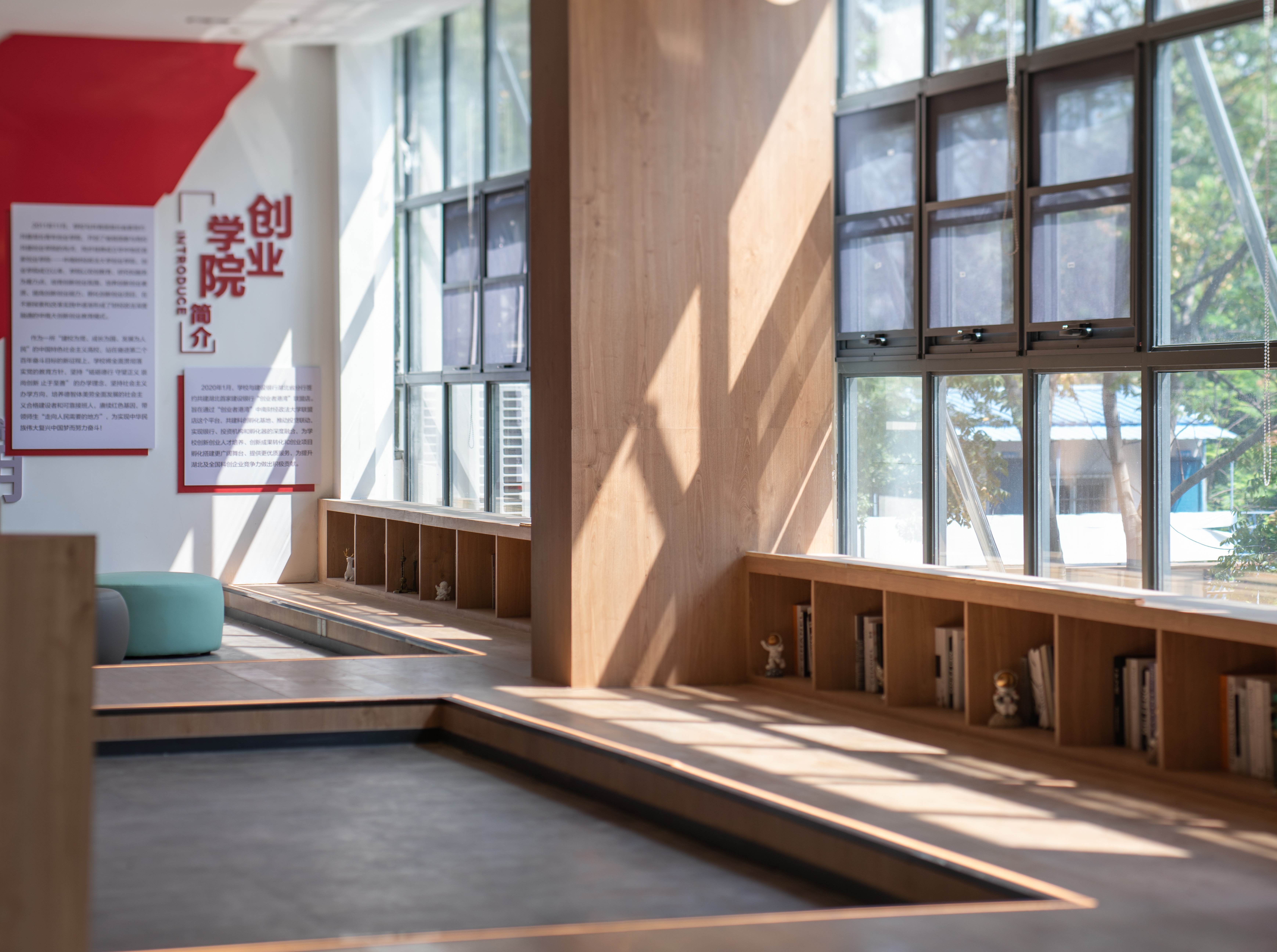 空间意境:此项目的功能性为学生创业的起点,因此在空间设计上,我们希望做出充满可能性的不同功能空间,满足学生的各种学习工作需求。充分利用建筑本身的采光及窗外的绿化景观,将自然风景和阳光最大限度的引入内部空间,并在空间的处理上做到视线流通,动线流通,功能自由切换。窗外的景,透过的光都是设计中的一部分,一日之内阳光的变化,一年之内季节的变化都会使内部空间呈现不一样的体验感。大厅的大楼梯,书吧的座椅,走廊的交流处,转弯的交互区甚至开放的茶水区,任何一个空间都可以随地落座,随时进入工作或学习状态。设计本身处处考虑使用需求。