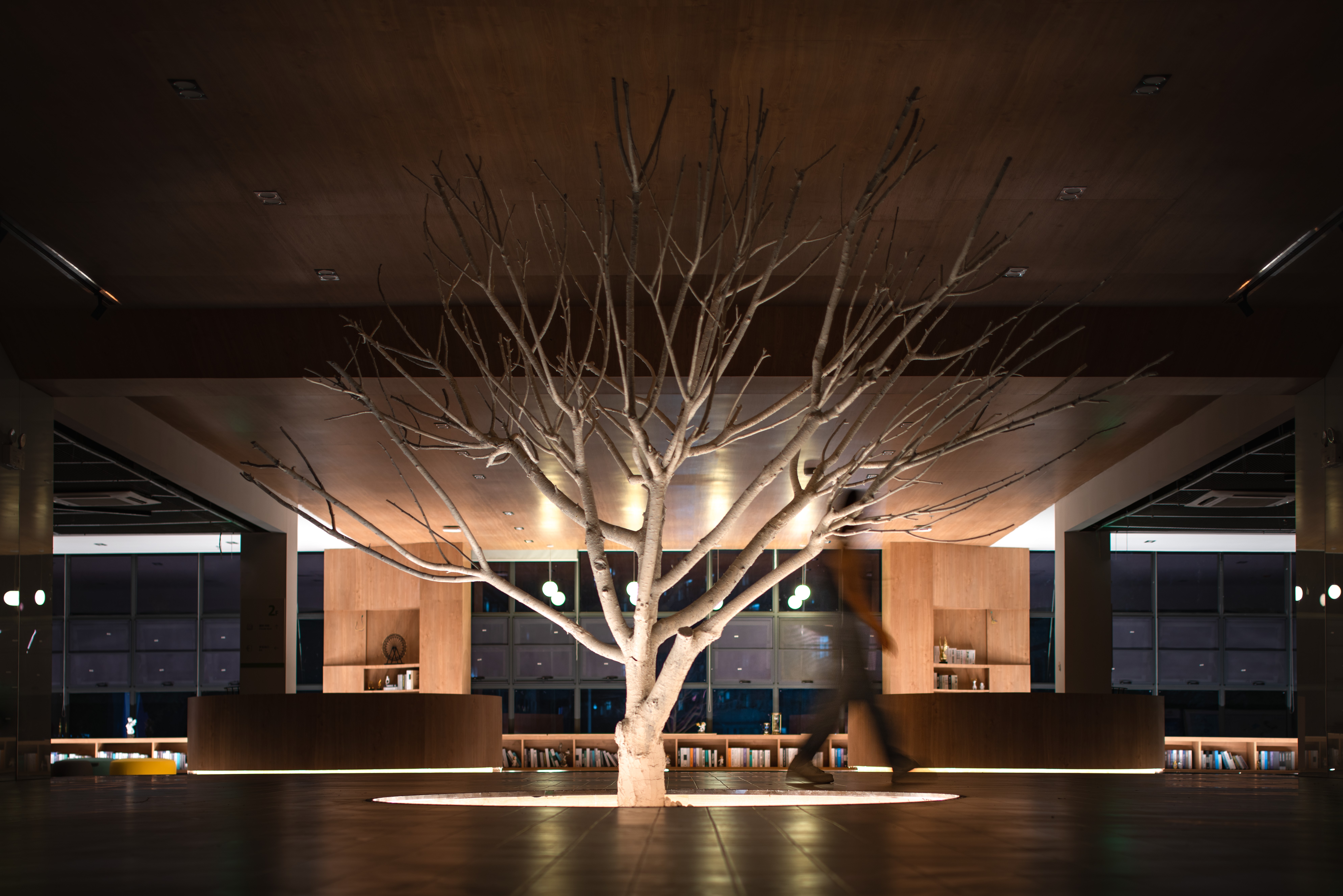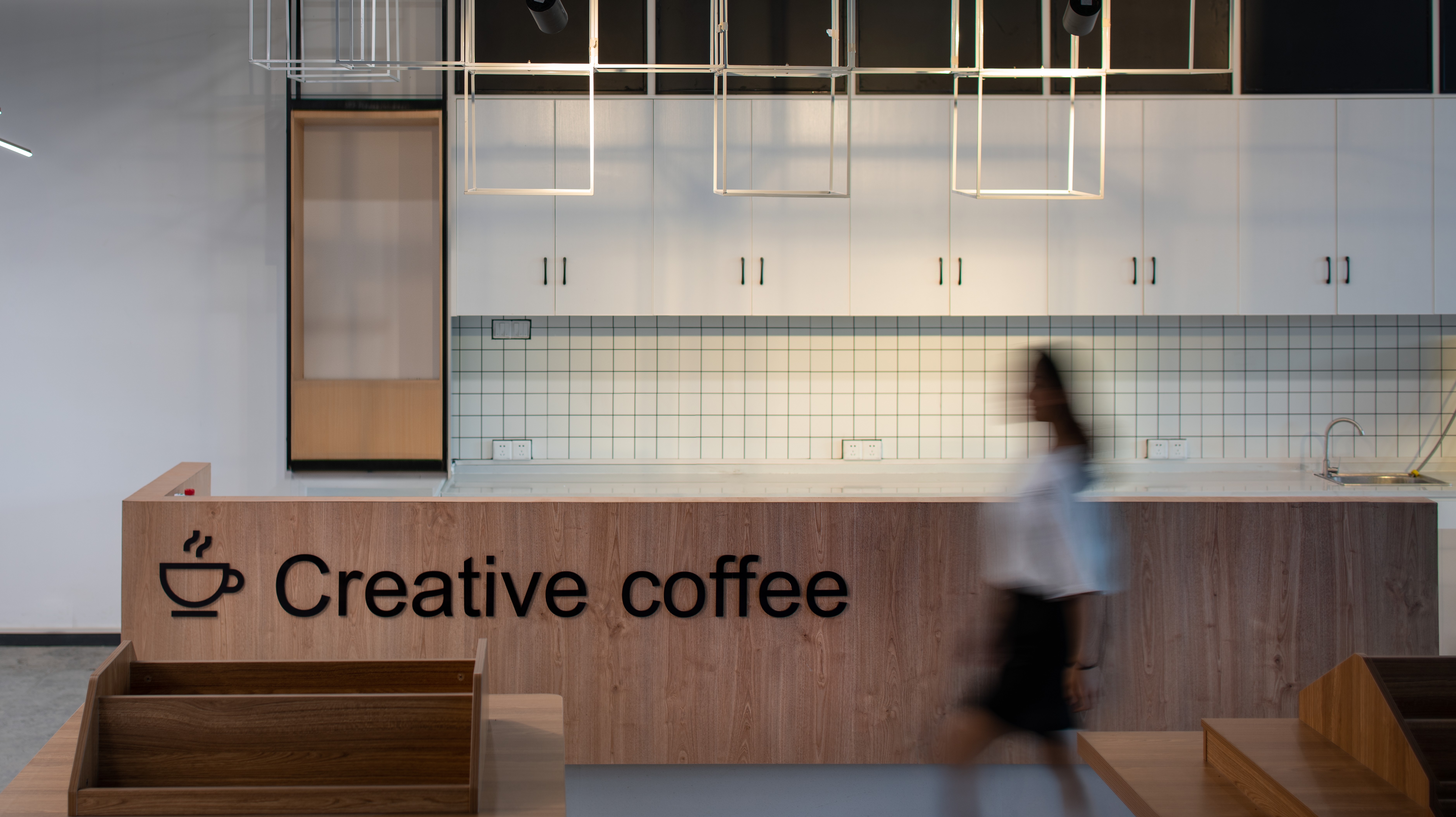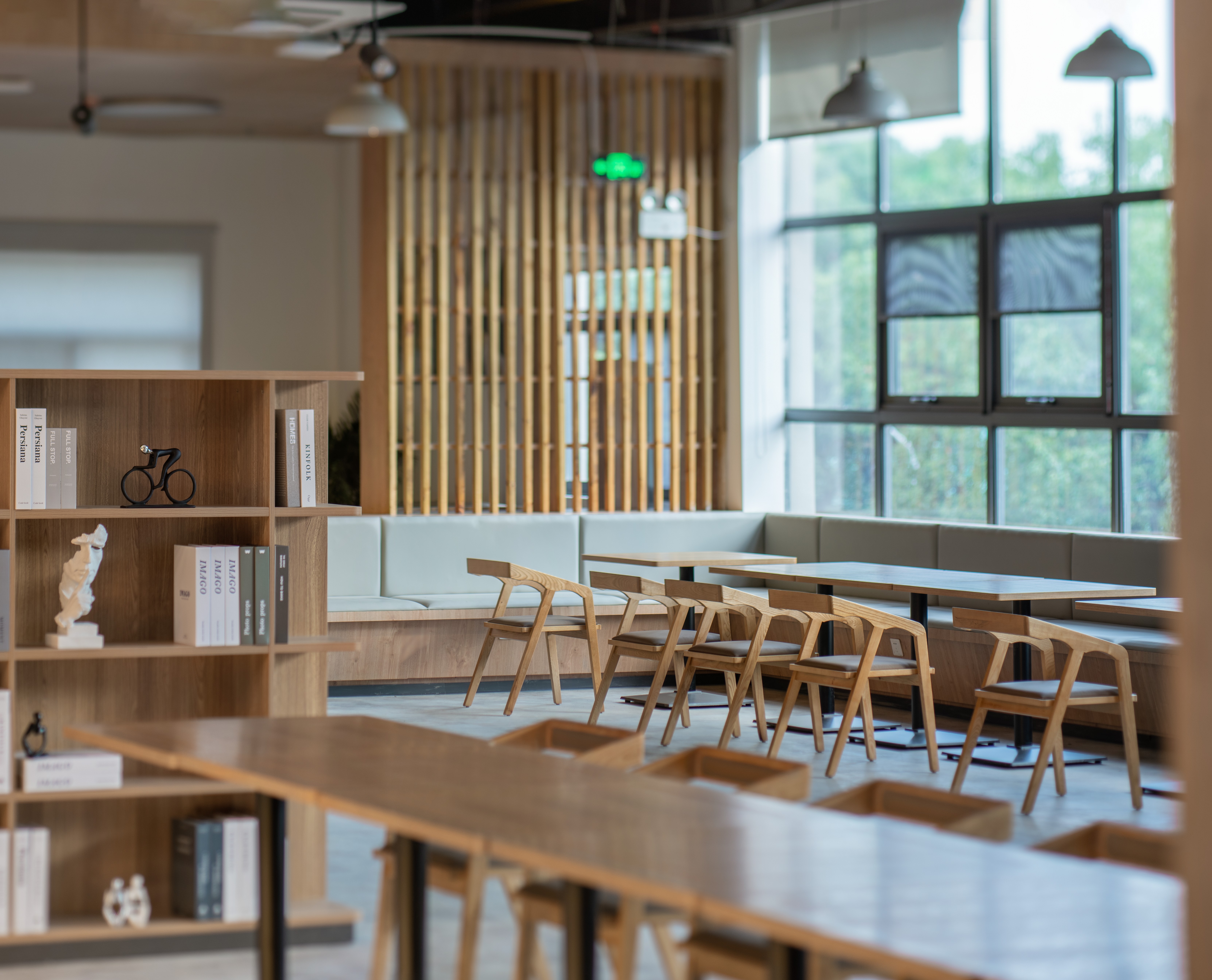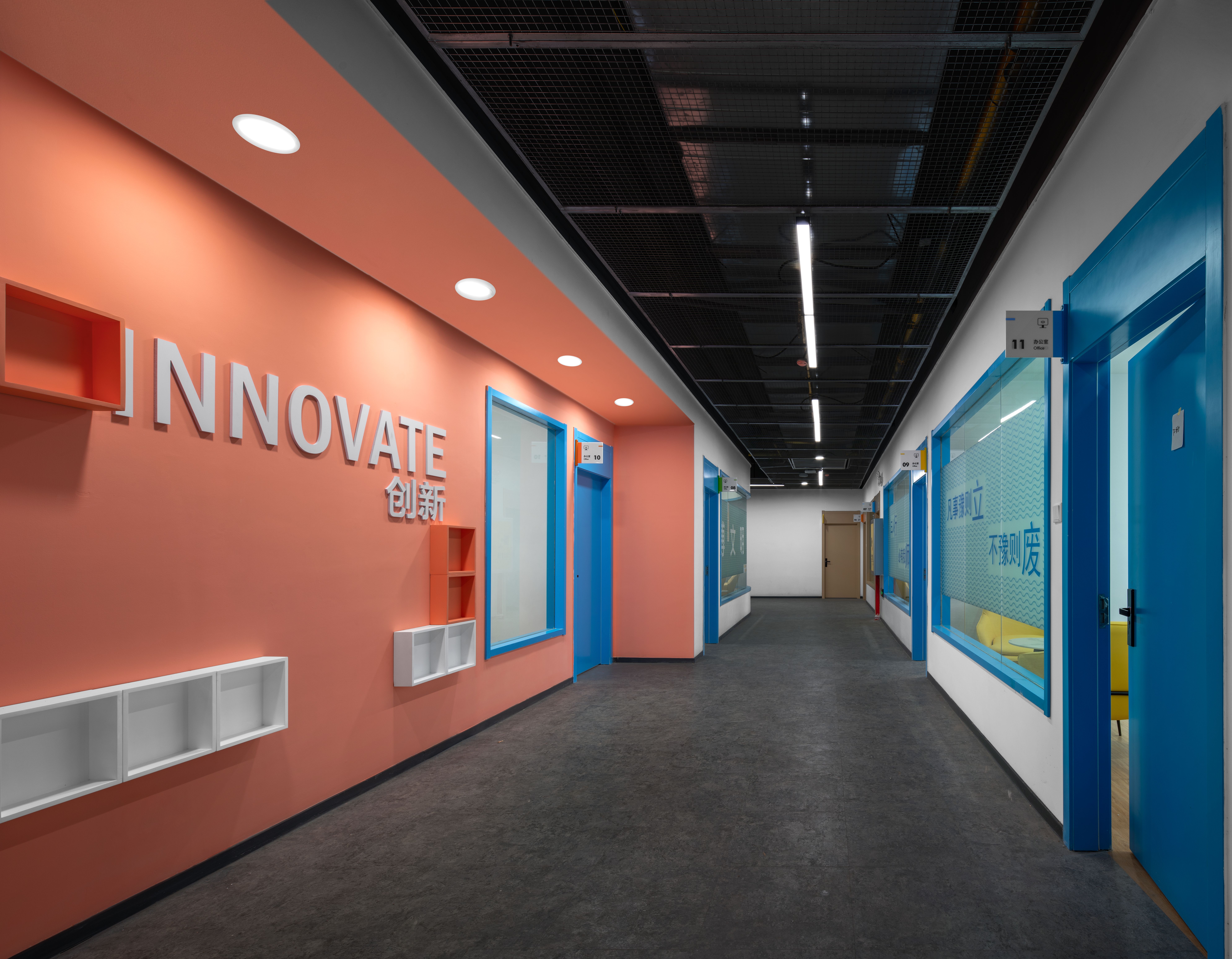 空间意境:此项目的功能性为学生创业的起点,因此在空间设计上,我们希望做出充满可能性的不同功能空间,满足学生的各种学习工作需求。充分利用建筑本身的采光及窗外的绿化景观,将自然风景和阳光最大限度的引入内部空间,并在空间的处理上做到视线流通,动线流通,功能自由切换。窗外的景,透过的光都是设计中的一部分,一日之内阳光的变化,一年之内季节的变化都会使内部空间呈现不一样的体验感。大厅的大楼梯,书吧的座椅,走廊的交流处,转弯的交互区甚至开放的茶水区,任何一个空间都可以随地落座,随时进入工作或学习状态。设计本身处处考虑使用需求。