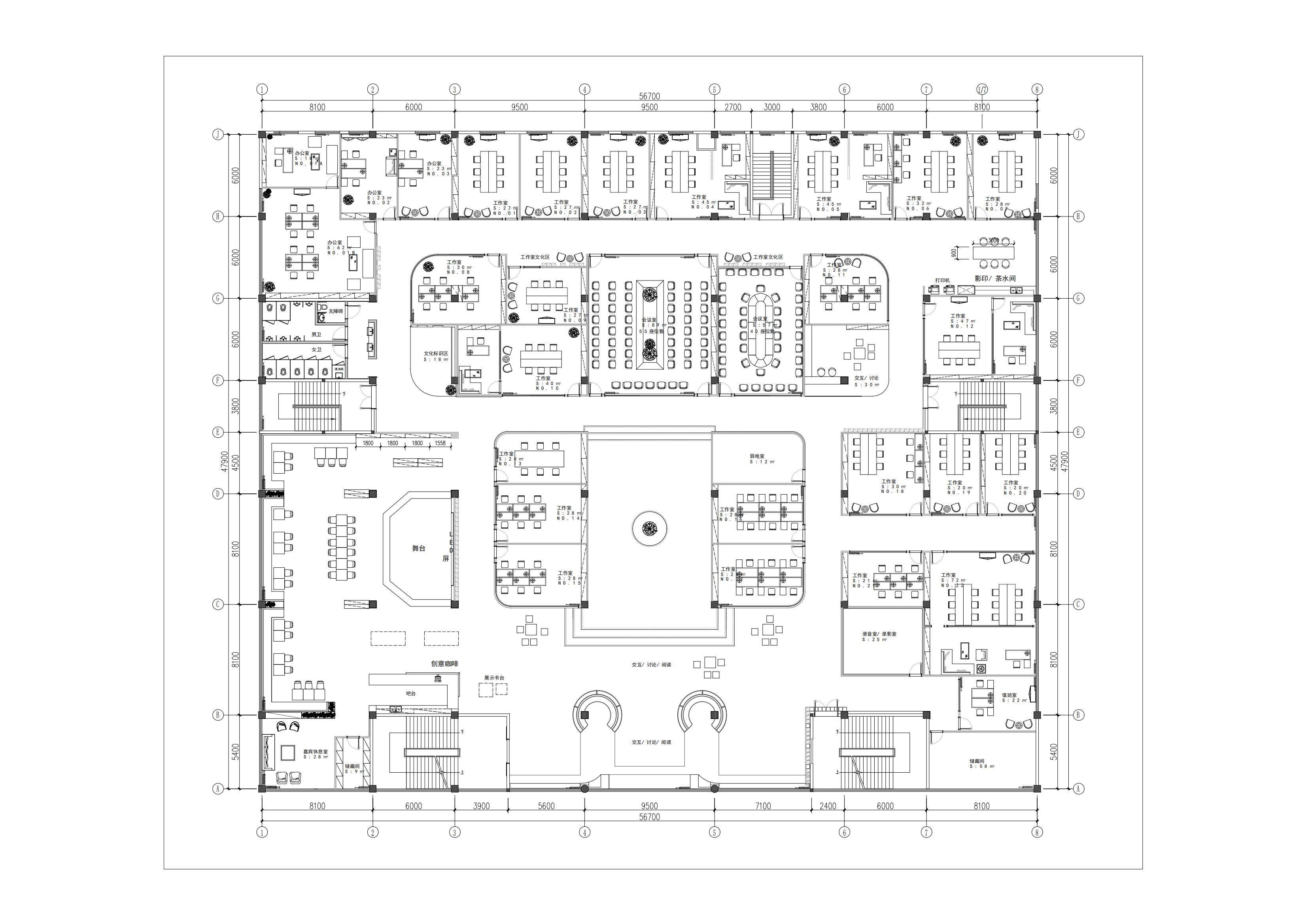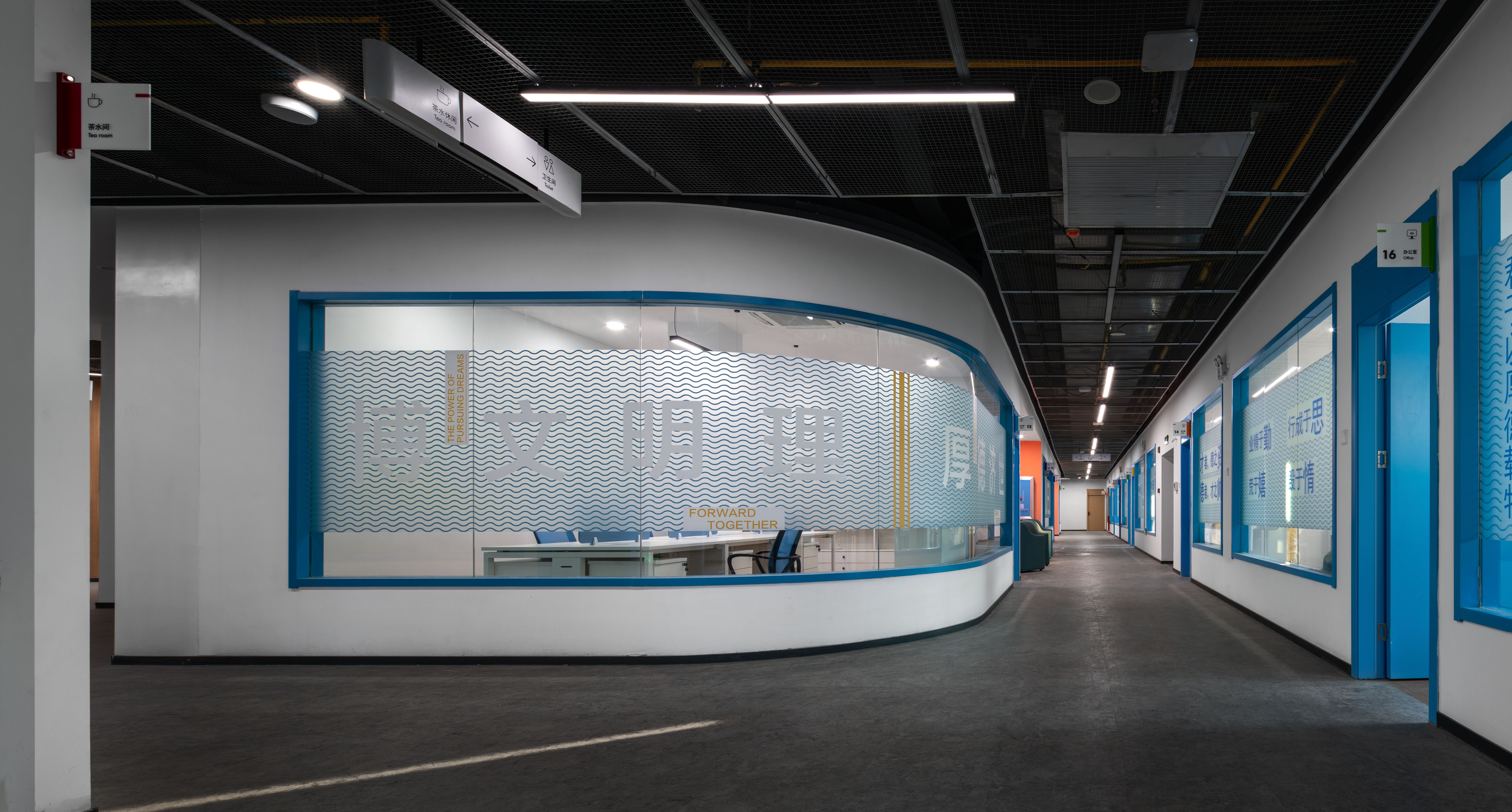 空间布局:设计项目为一栋旧楼改造,本项目是裙房二层一整层,平面是一个2700平米左右的几乎为一个正方形的方正空间,四面环窗,但到中间部分的空间几乎没有采光,在本次设计中,空间设计思路是尽可能的利用建筑本身的空间特点,结合项目的功能性质做到明亮、自由,空间流动性强。因此在墙体设计上,用大量玻璃窗结合隔墙设计来实现内部走道及内部空间的通透感,让整个空间的流动性更强。整个流线呈现环状,交汇点为弧形转弯区,让空间过度的有趣自然不生硬。即使走到平面中部区域依然感觉空间通透自然。