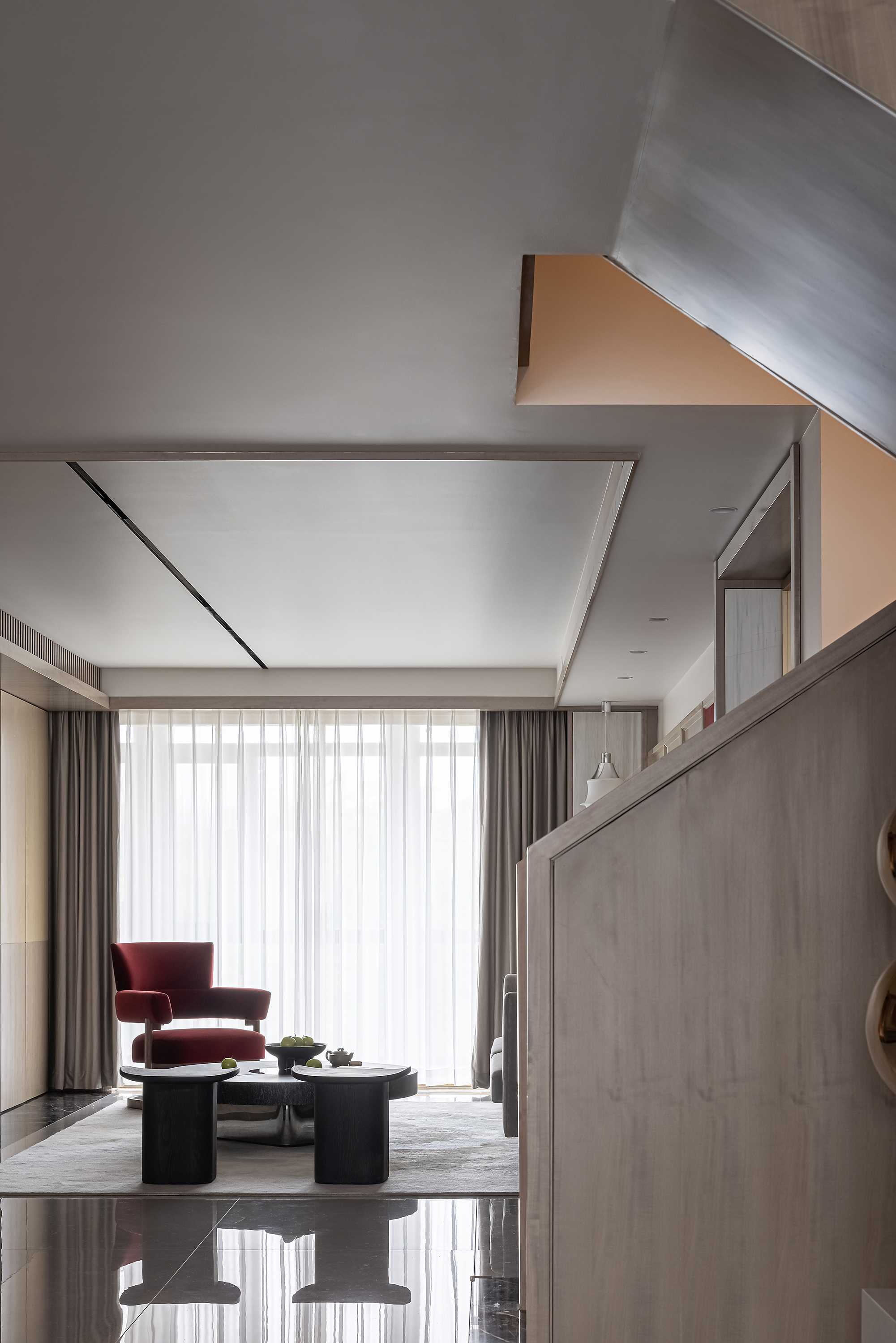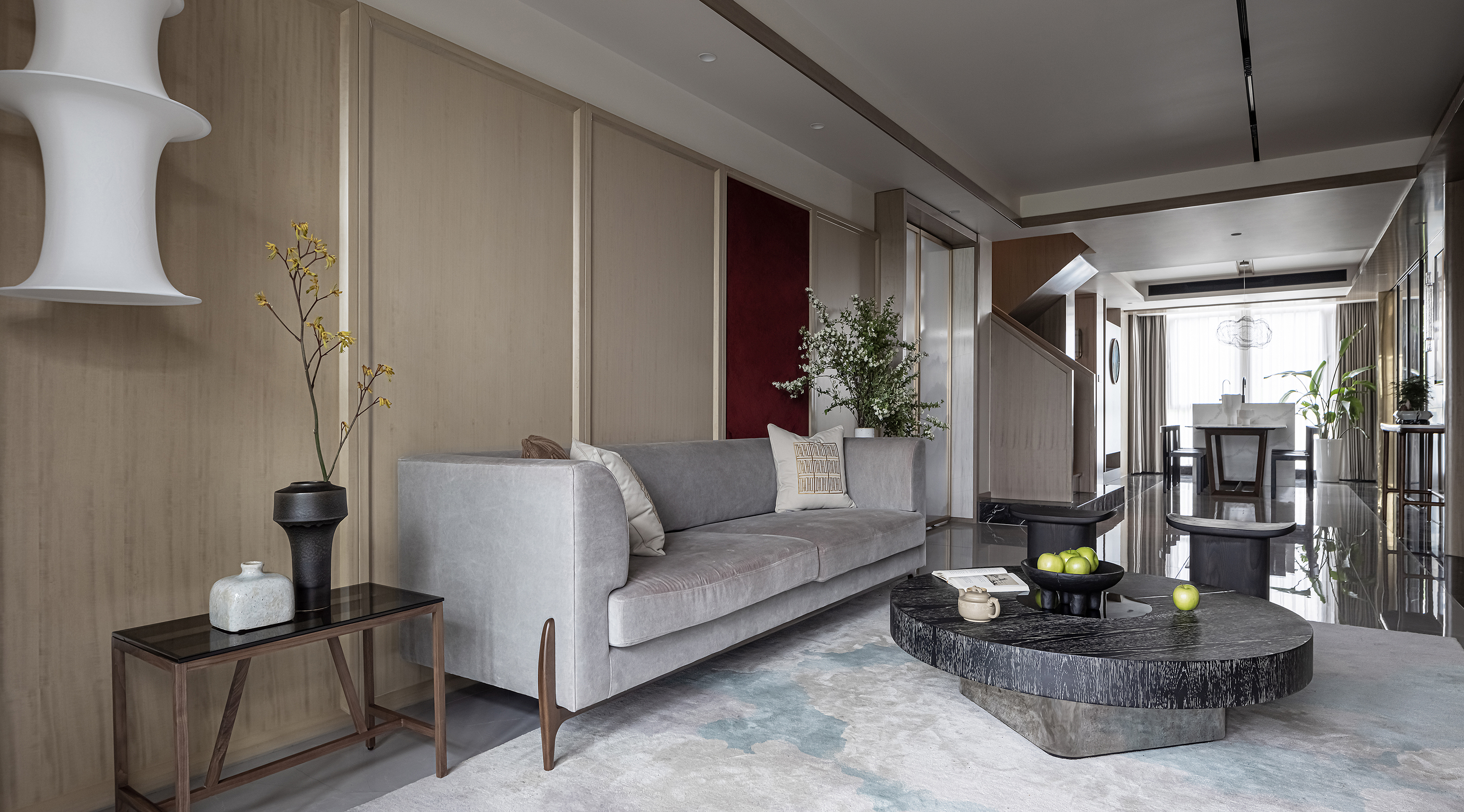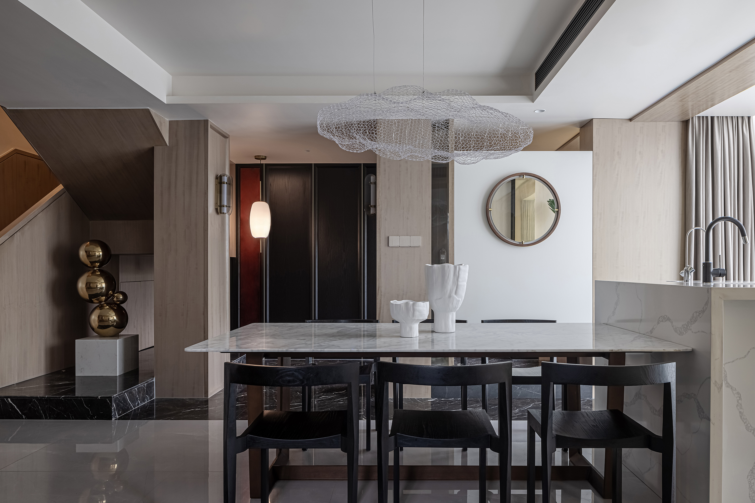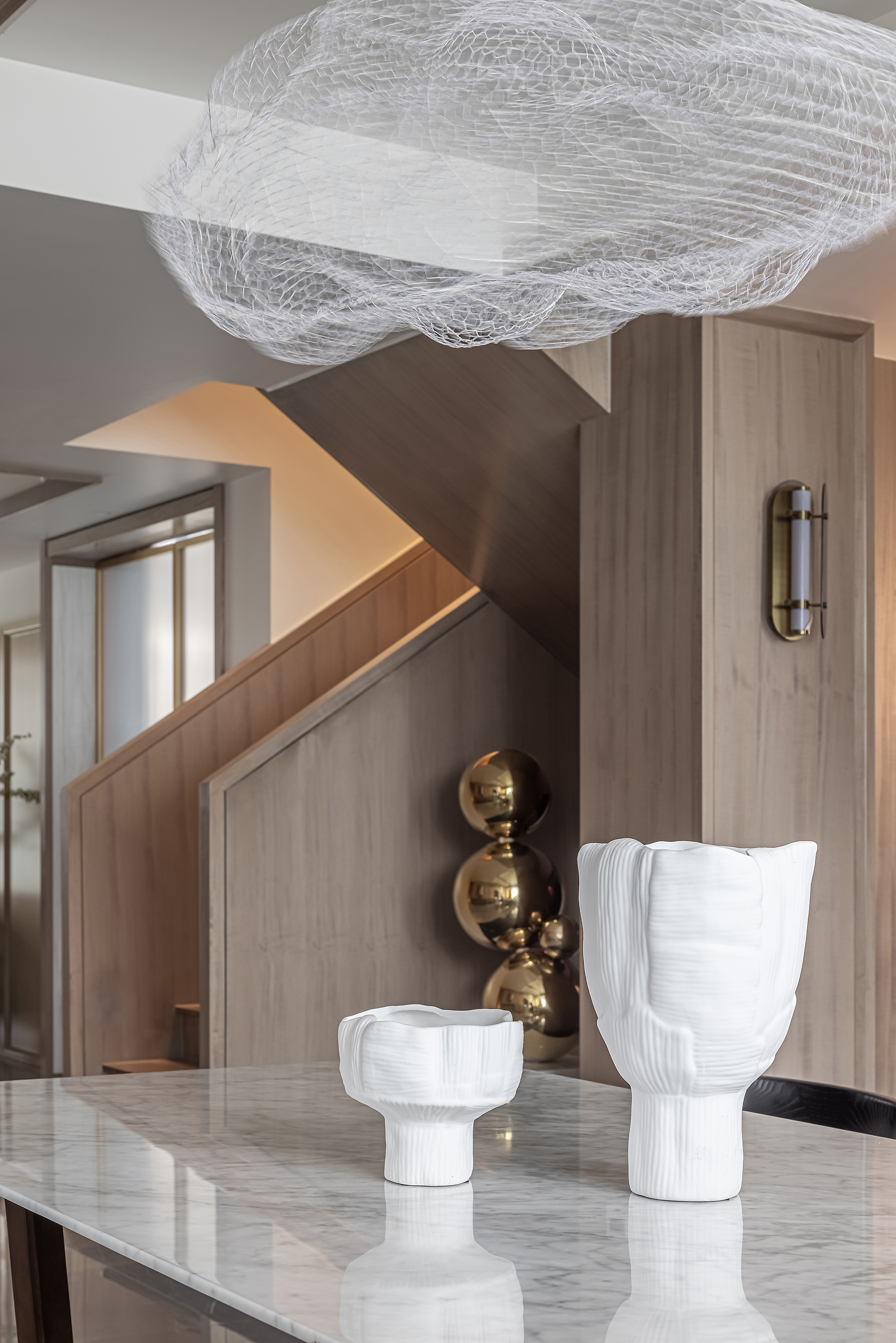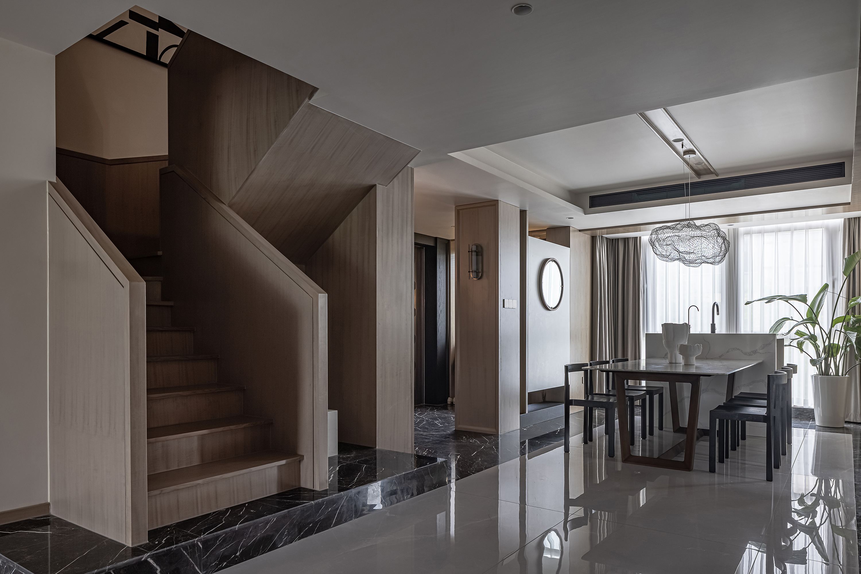 项目定位:本案为复式结构,常住祖孙三代六人,根据业主喜好,整体偏东方韵味,结合居住结构、功能需求,对房屋空间和氛围做设计划分控制,运用木饰面、绒布、素雅色系等元素,让整个空间围绕功能和中式气韵展开,使之达到期望品质而不俗套,满足老中青三代的审美需求。