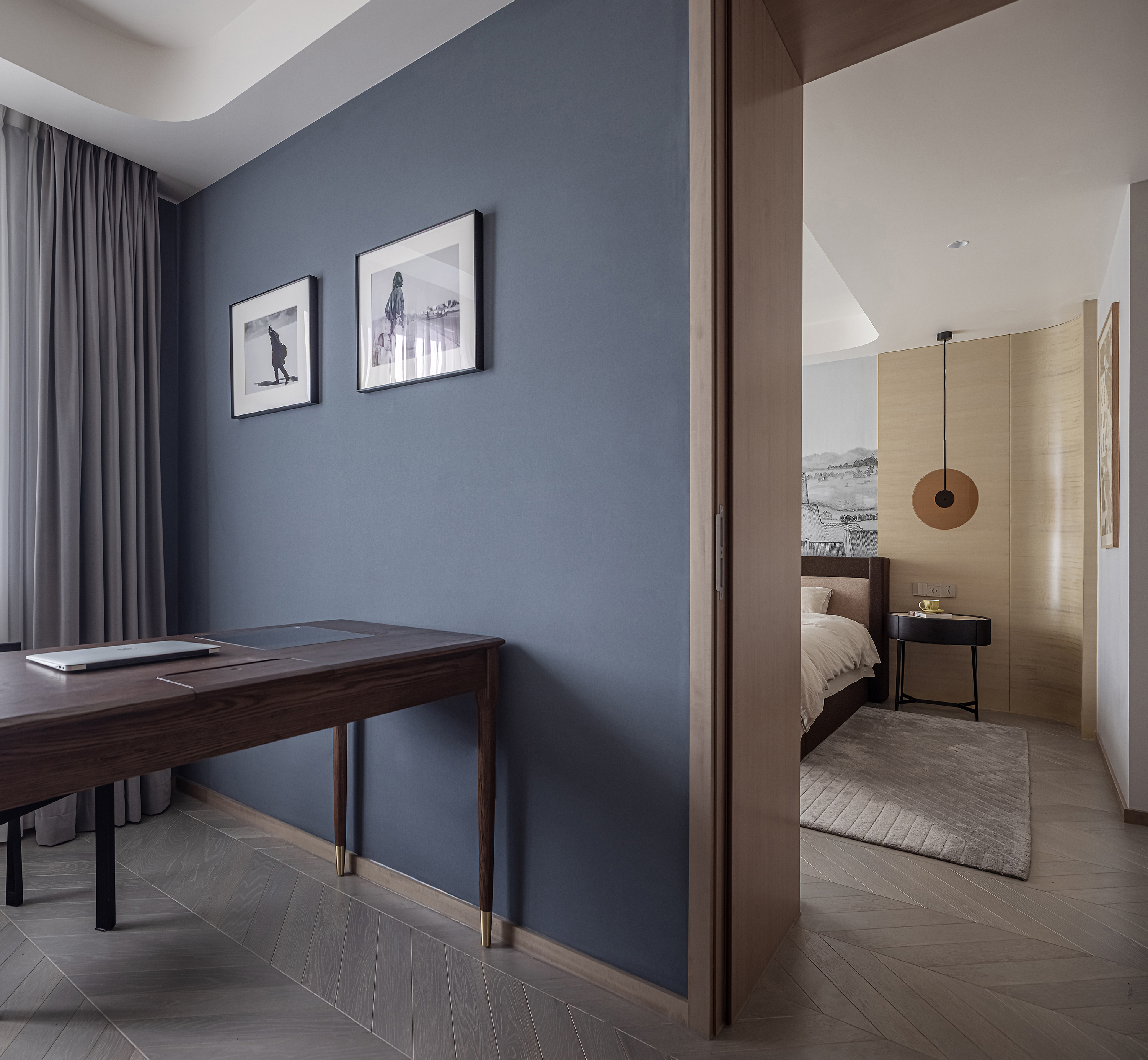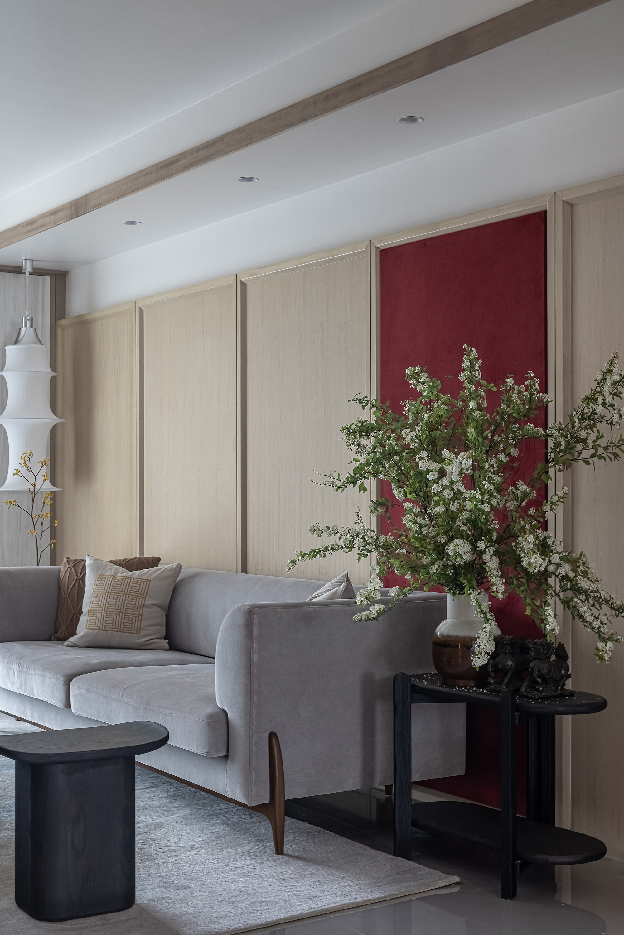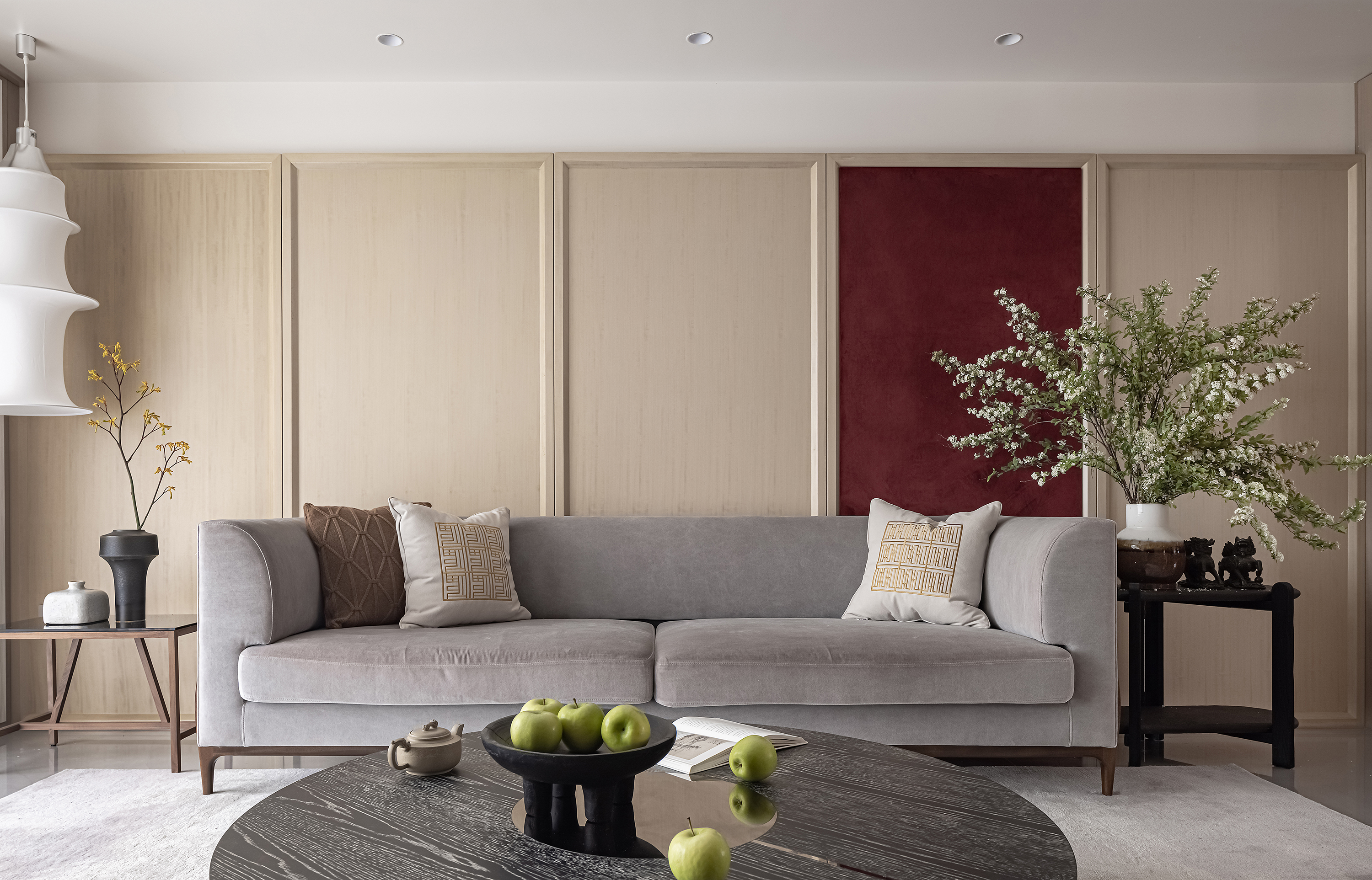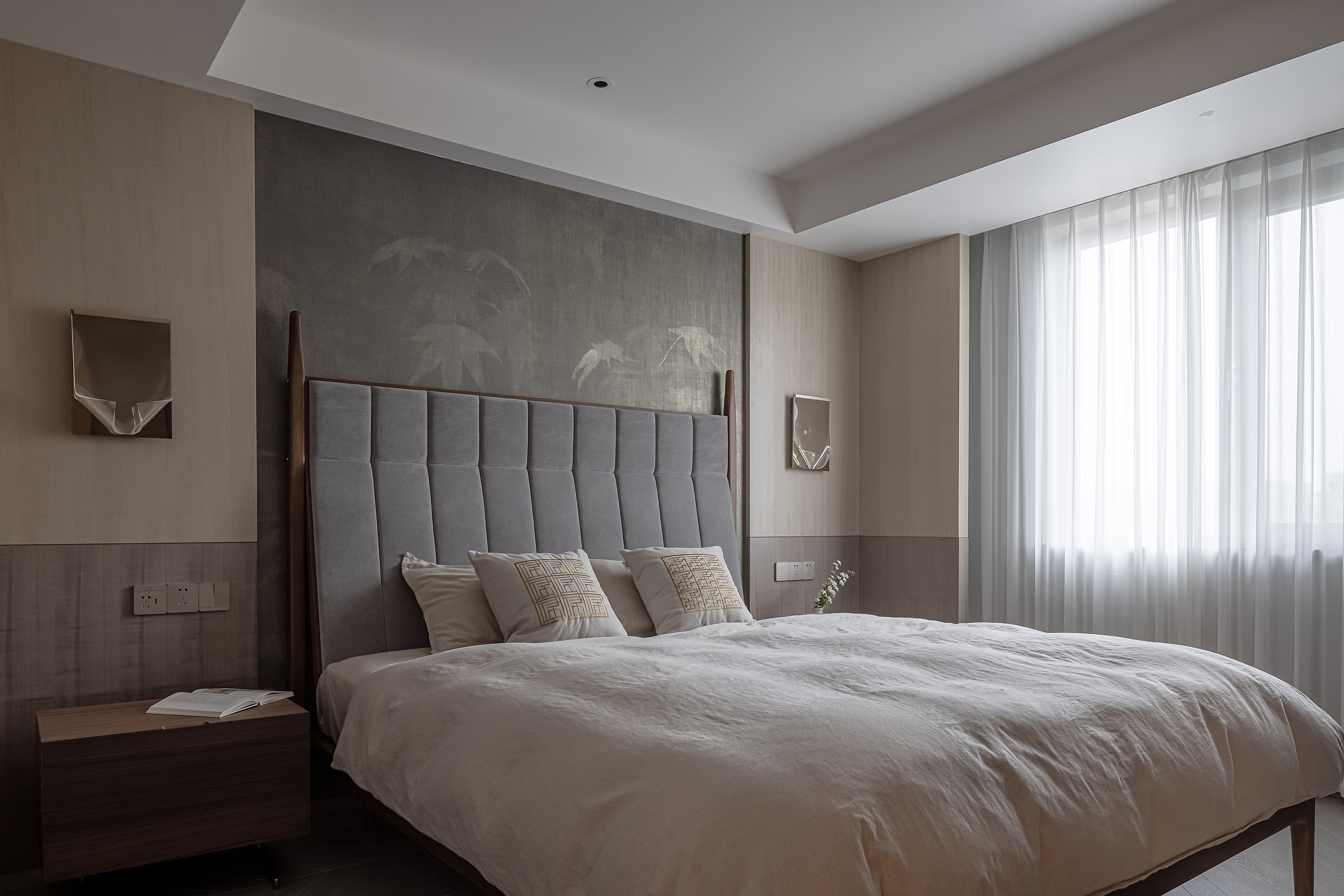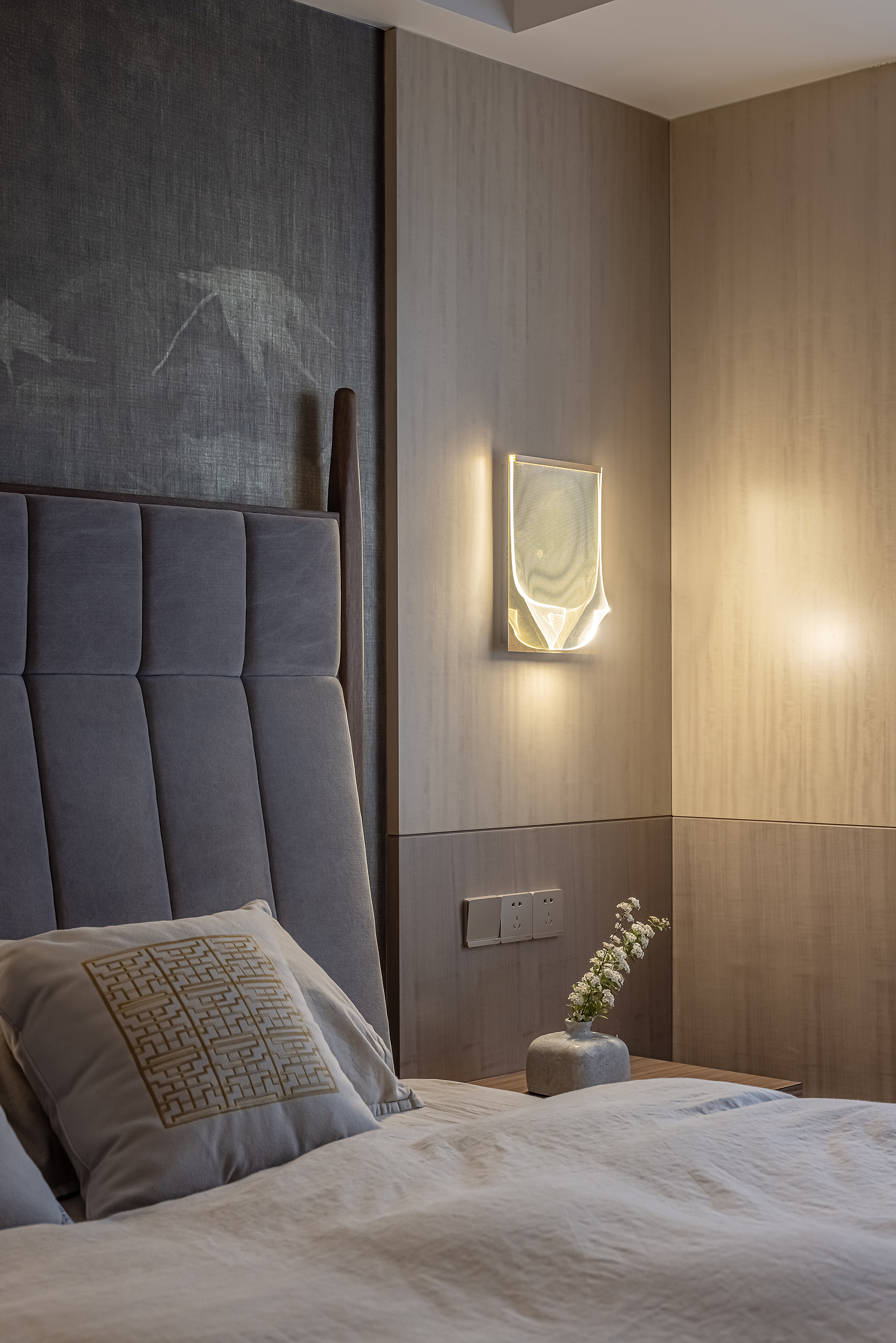 设计选材:运用木饰面、绒布、素雅色系等元素,让整个空间围绕功能和中式气韵展开,使之达到期望品质而不俗套,满足老中青三代的审美需求。