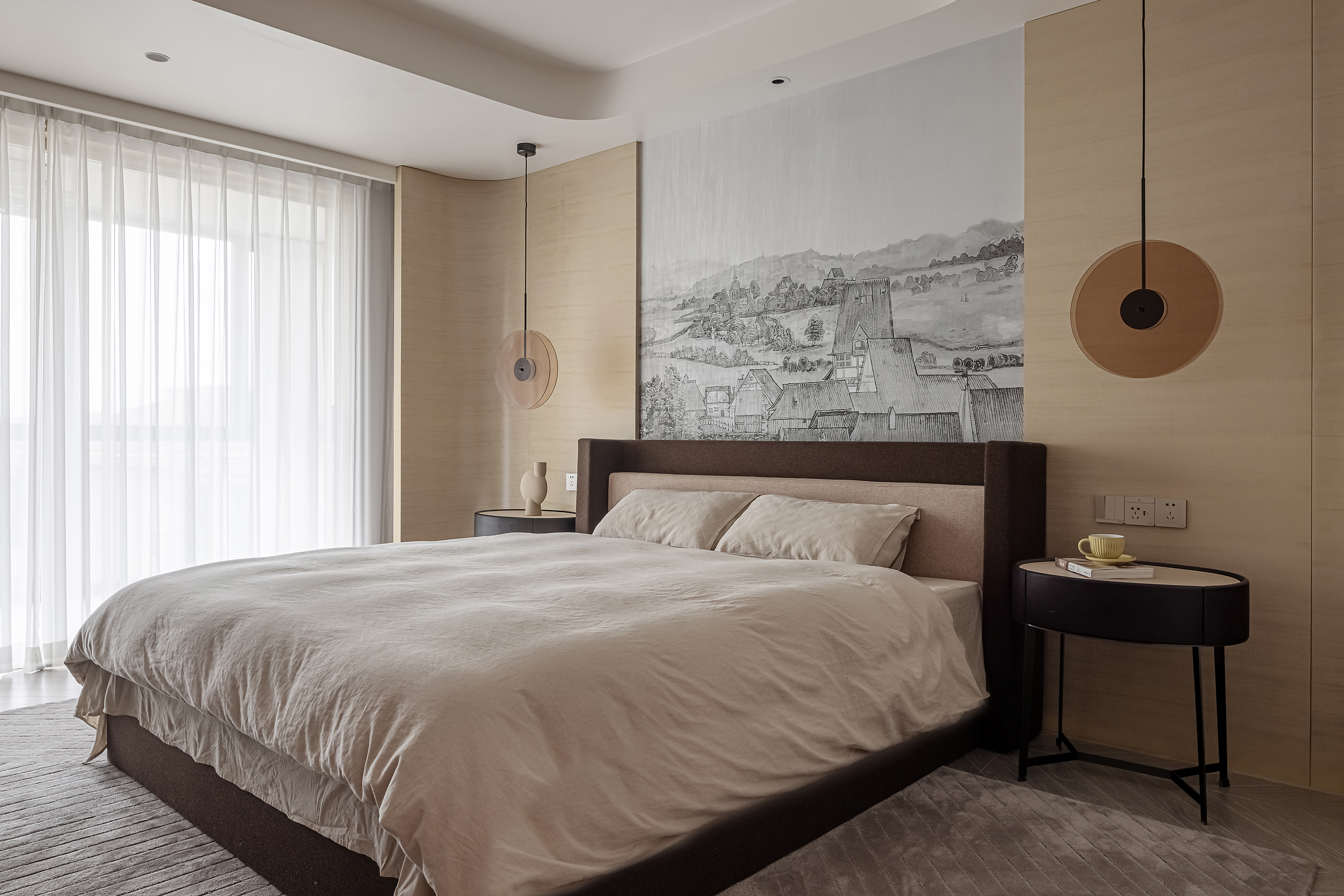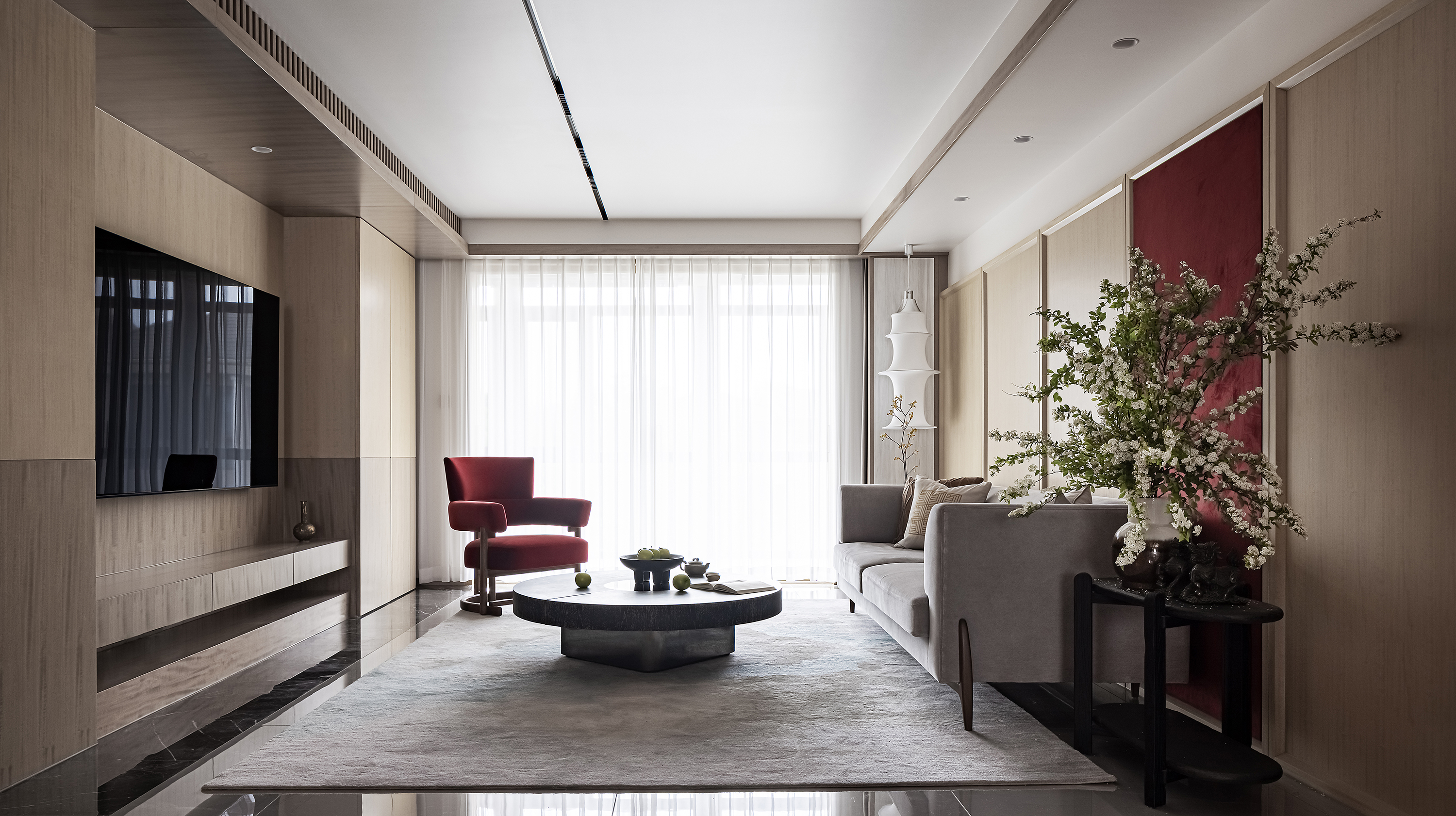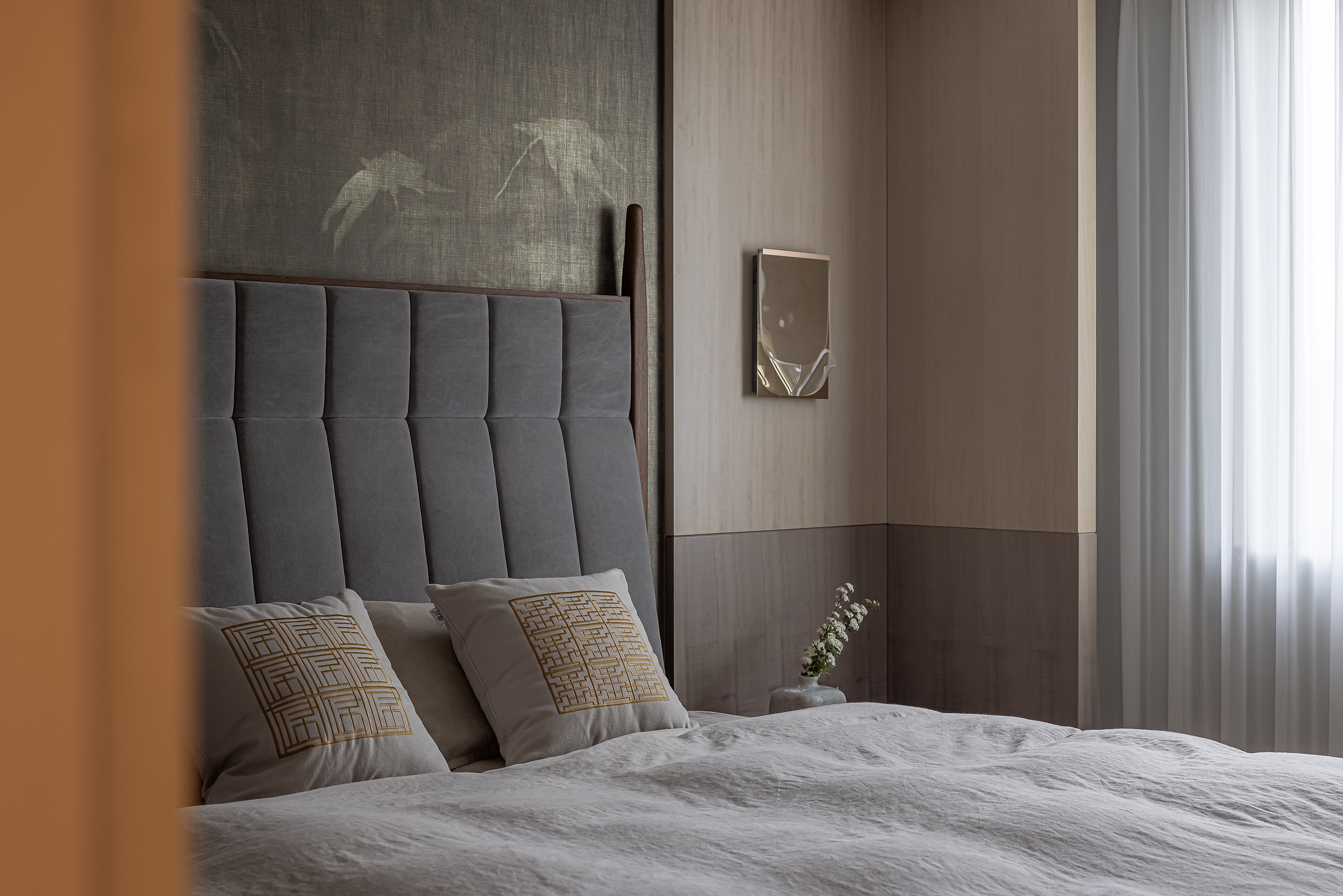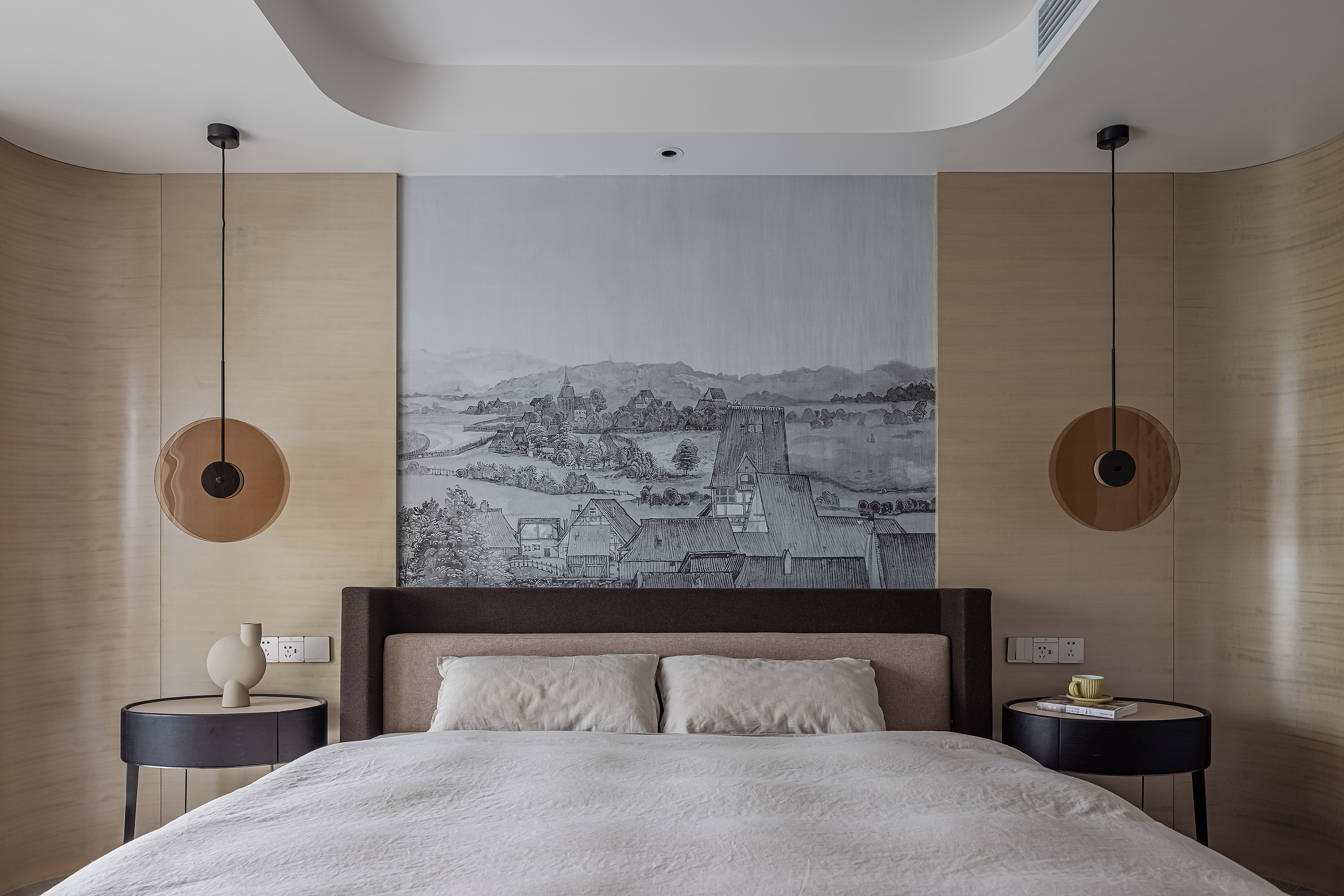 设计选材:运用木饰面、绒布、素雅色系等元素,让整个空间围绕功能和中式气韵展开,使之达到期望品质而不俗套,满足老中青三代的审美需求。