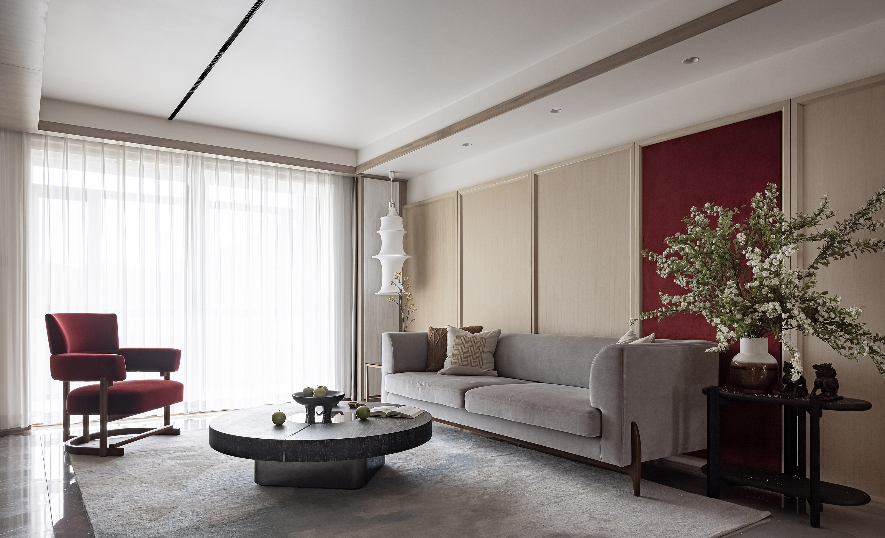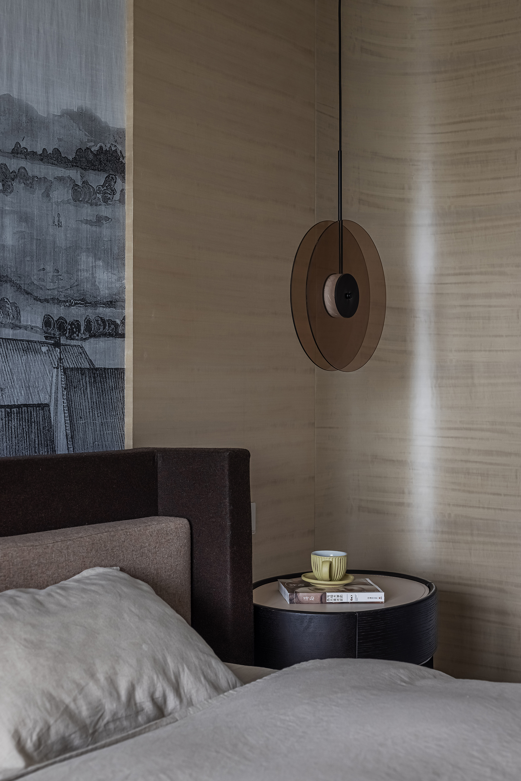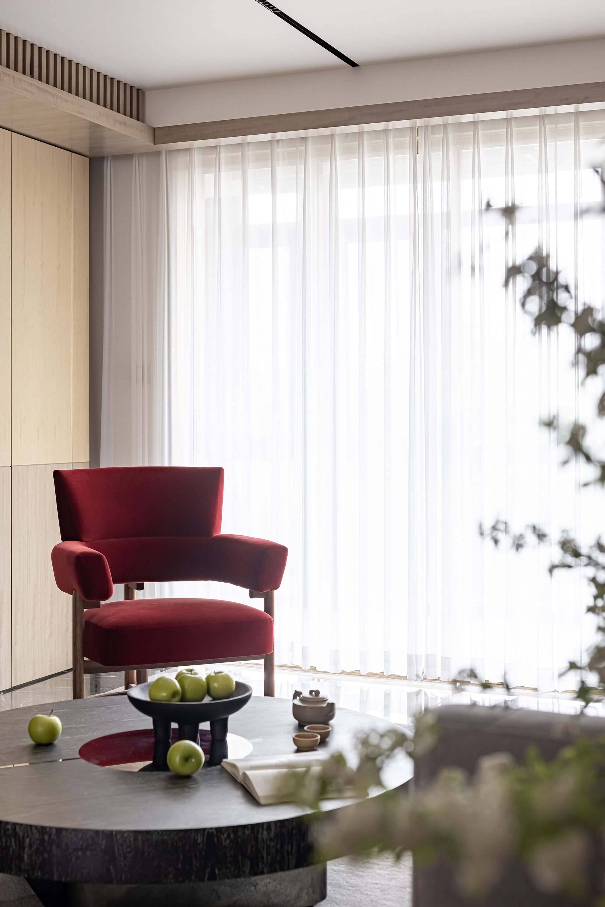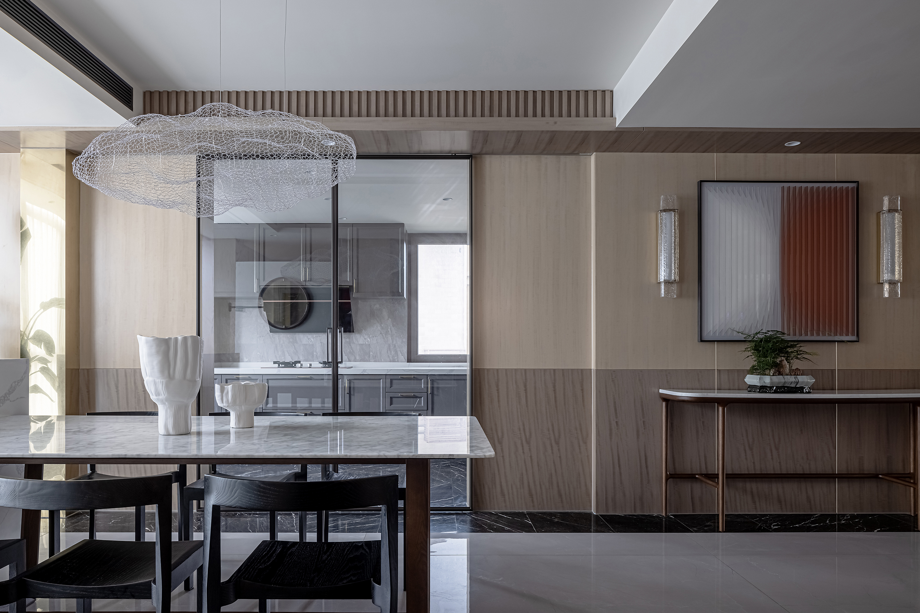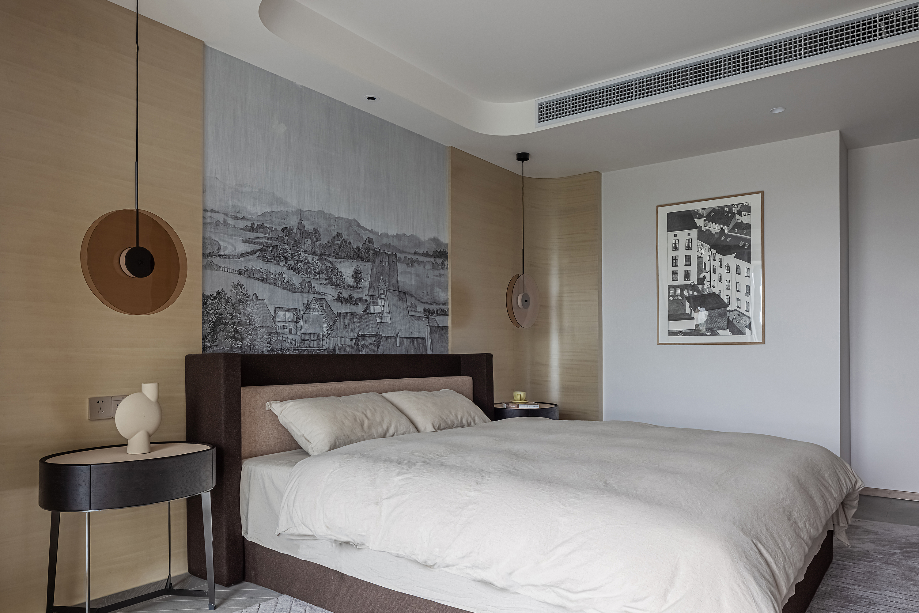 设计选材:运用木饰面、绒布、素雅色系等元素,让整个空间围绕功能和中式气韵展开,使之达到期望品质而不俗套,满足老中青三代的审美需求。
