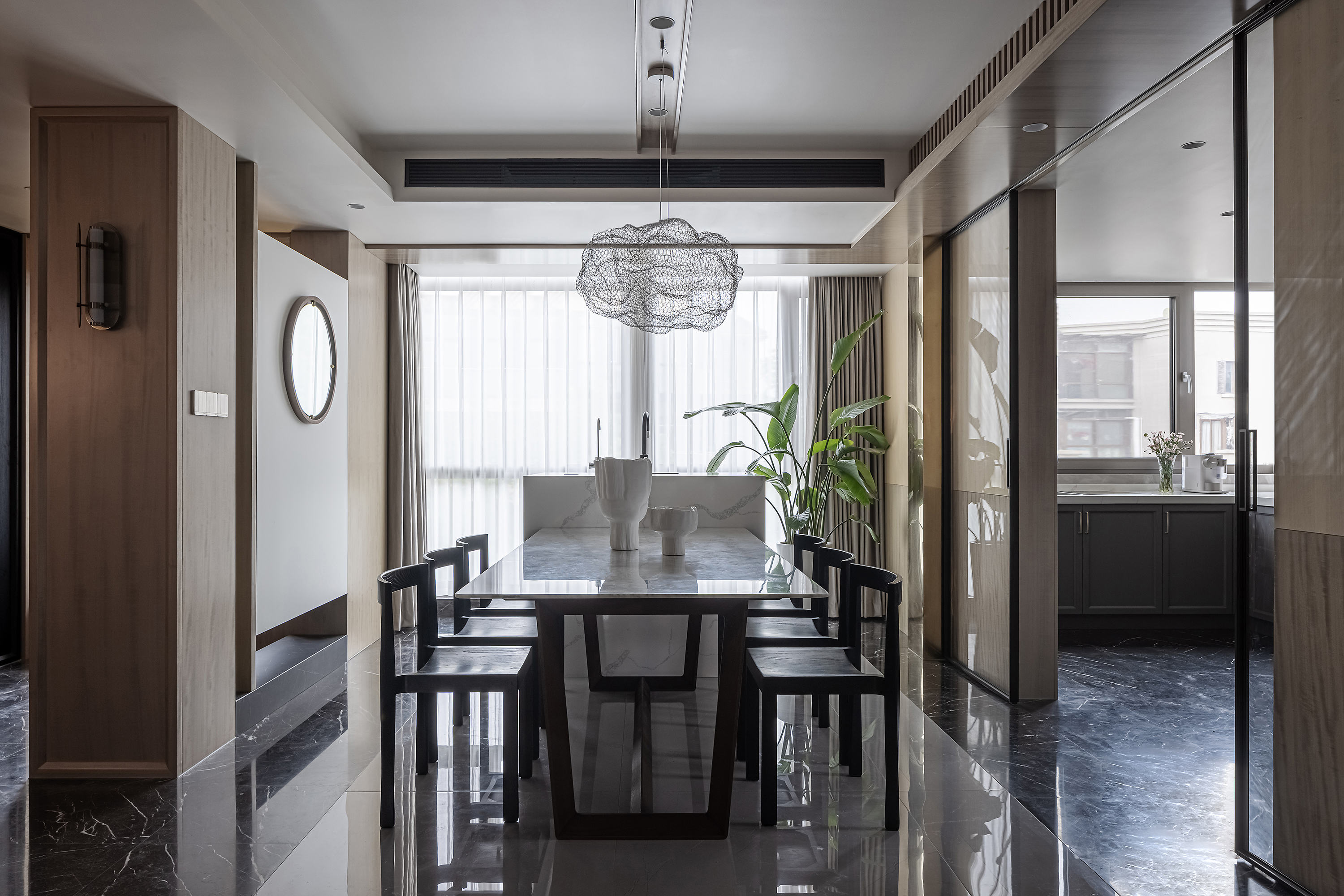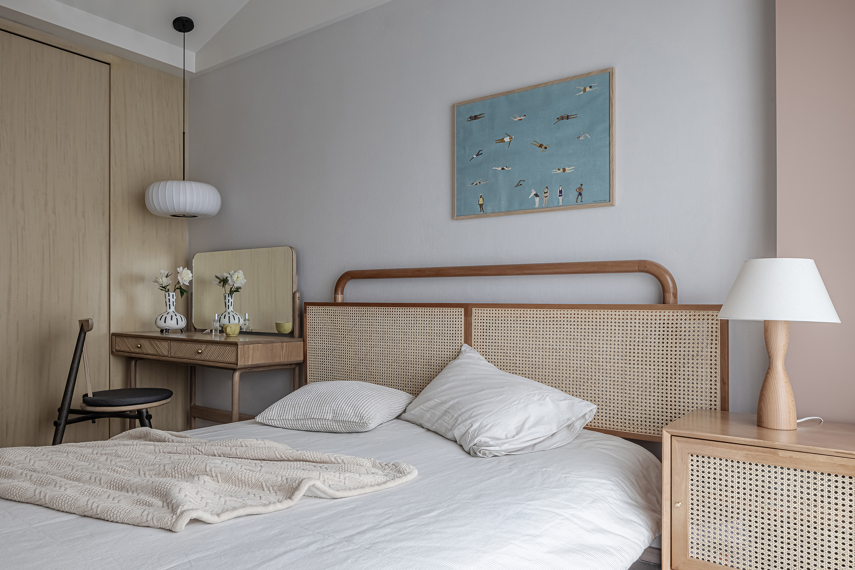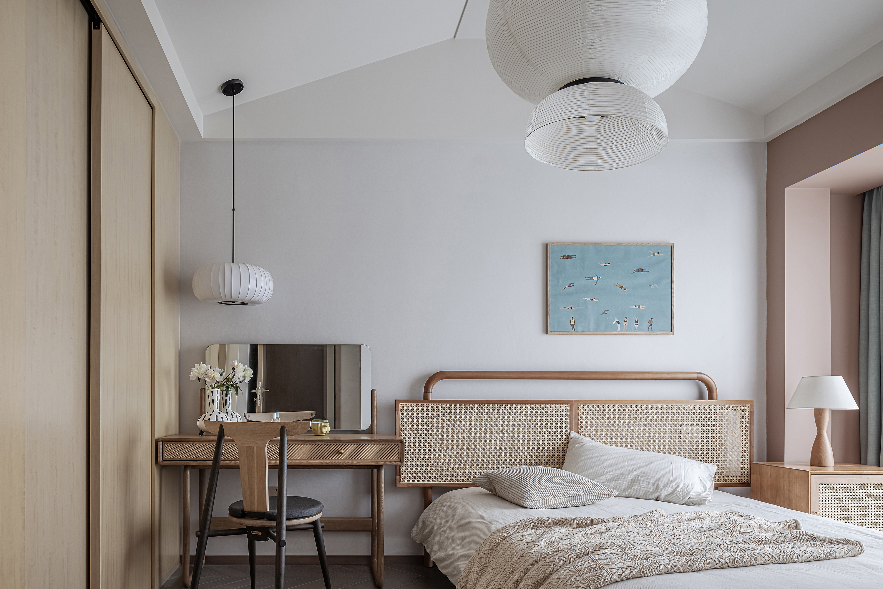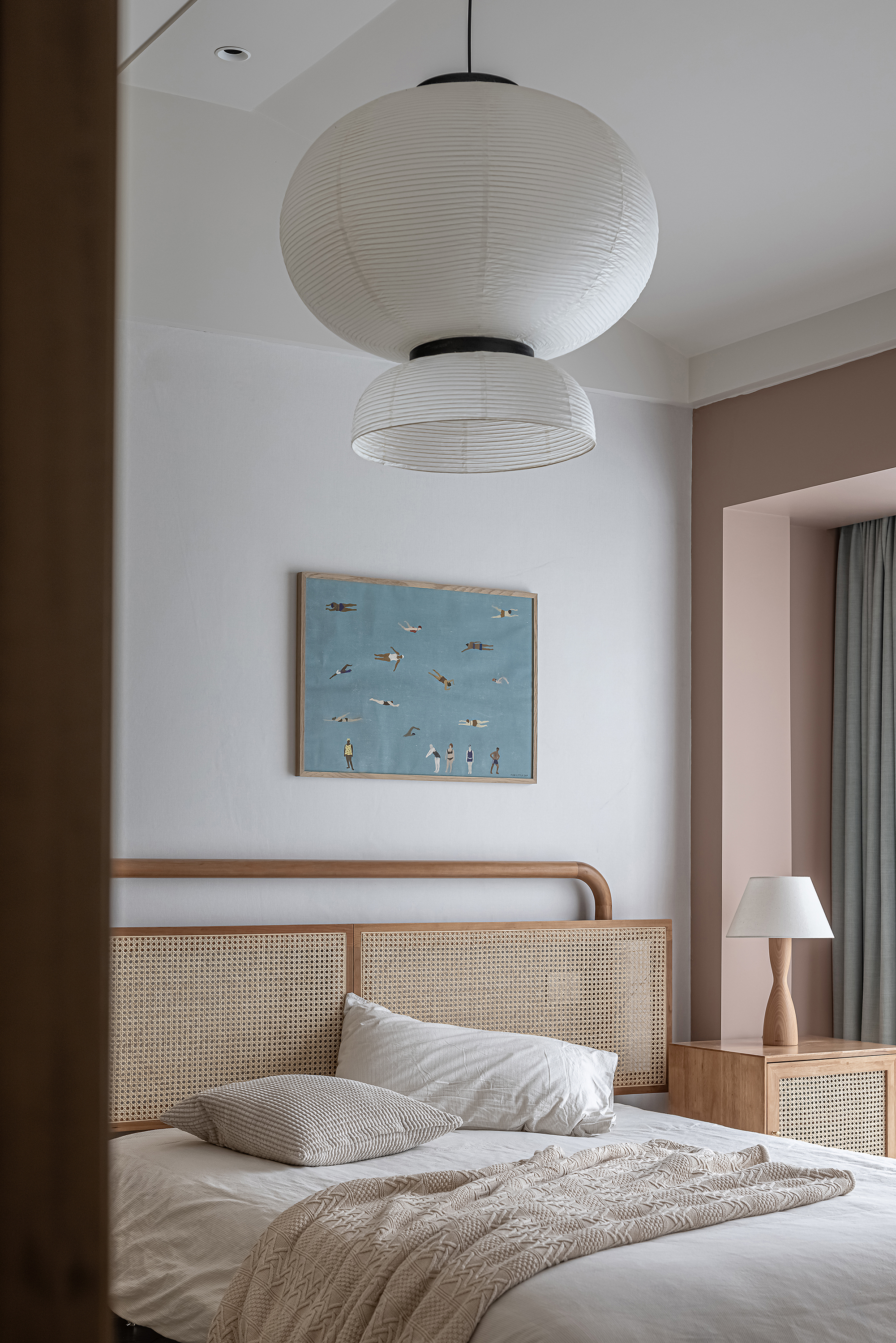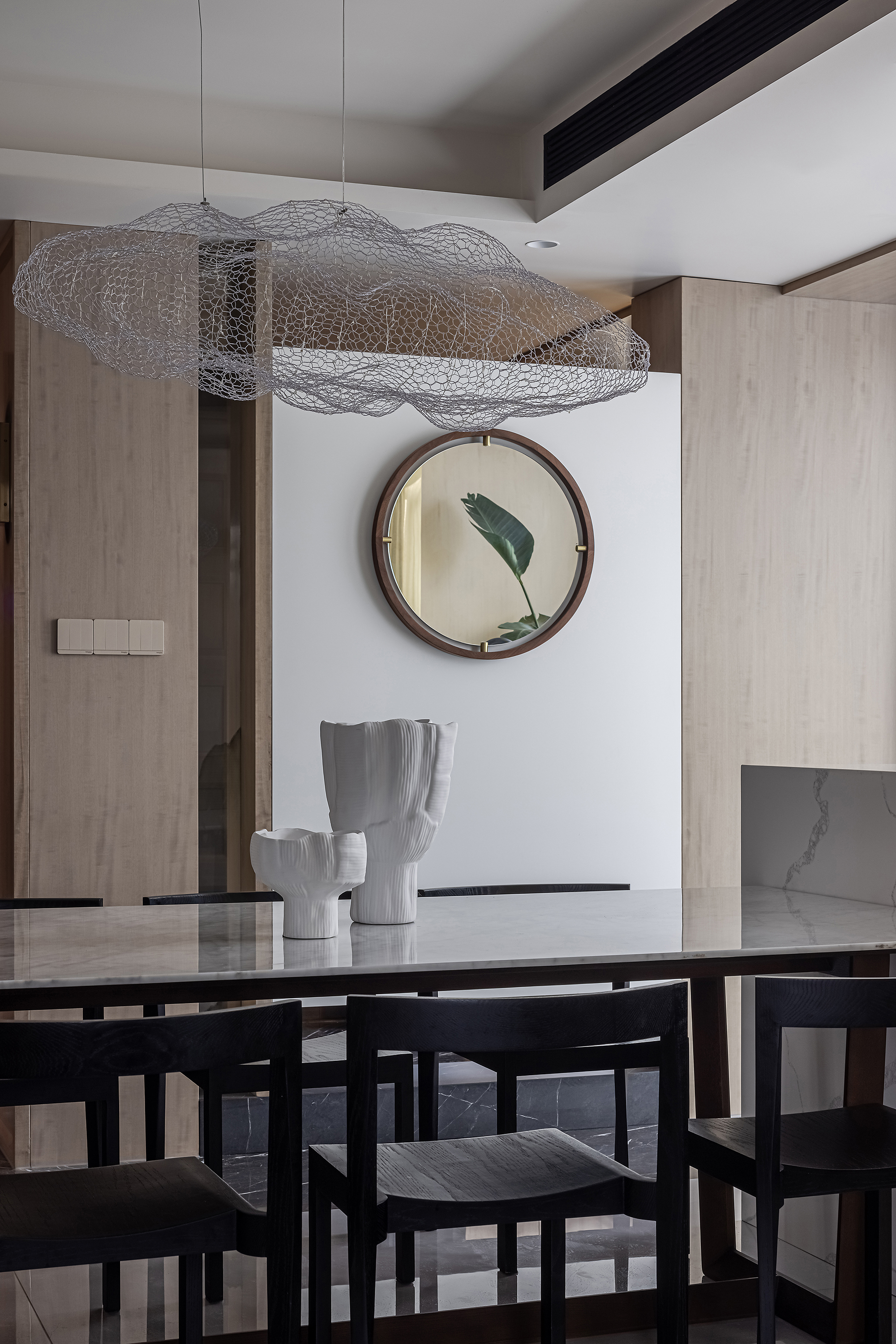 设计选材:运用木饰面、绒布、素雅色系等元素,让整个空间围绕功能和中式气韵展开,使之达到期望品质而不俗套,满足老中青三代的审美需求。