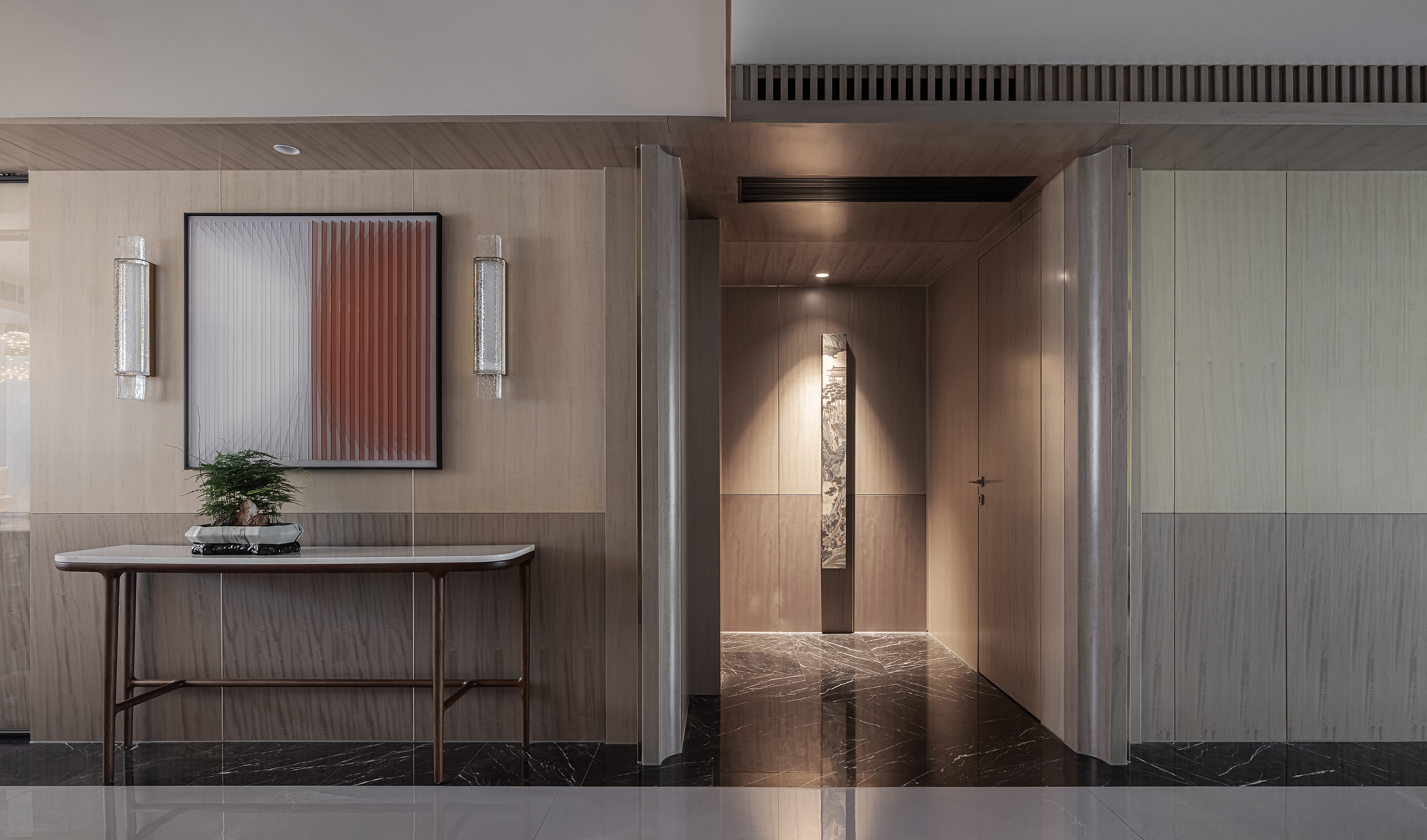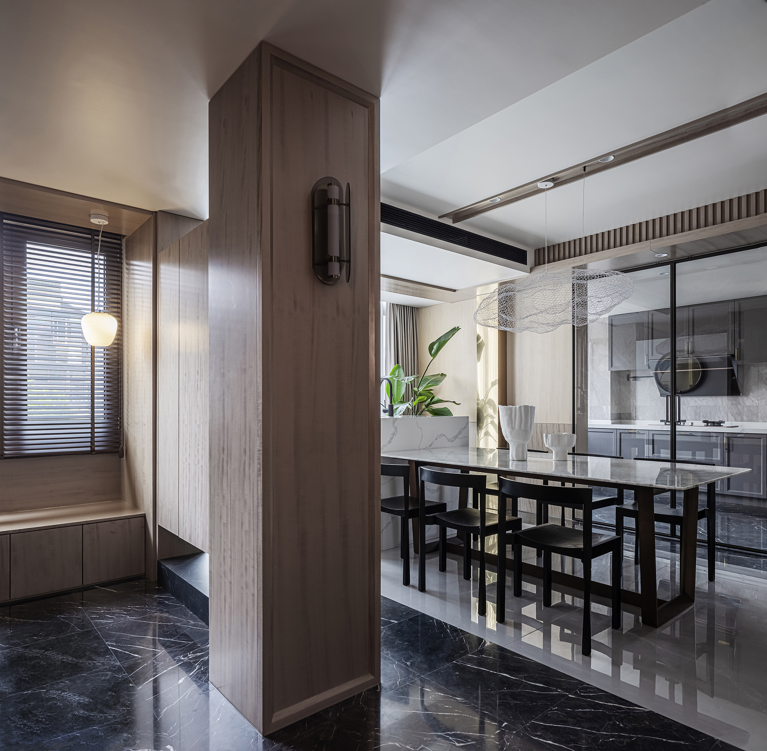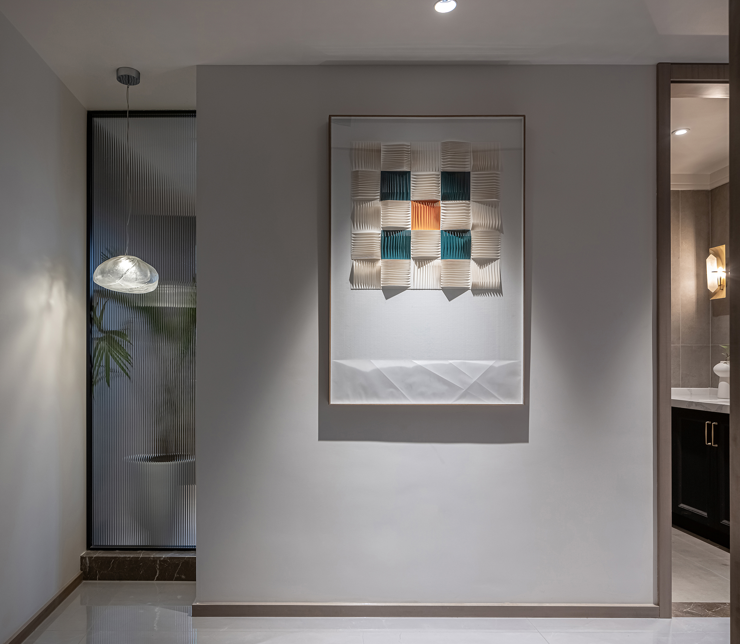 空间布局:将原有开放门厅归纳至玄关,入户门外移,扩大玄关区域,回家后更衣、换鞋更加自如;