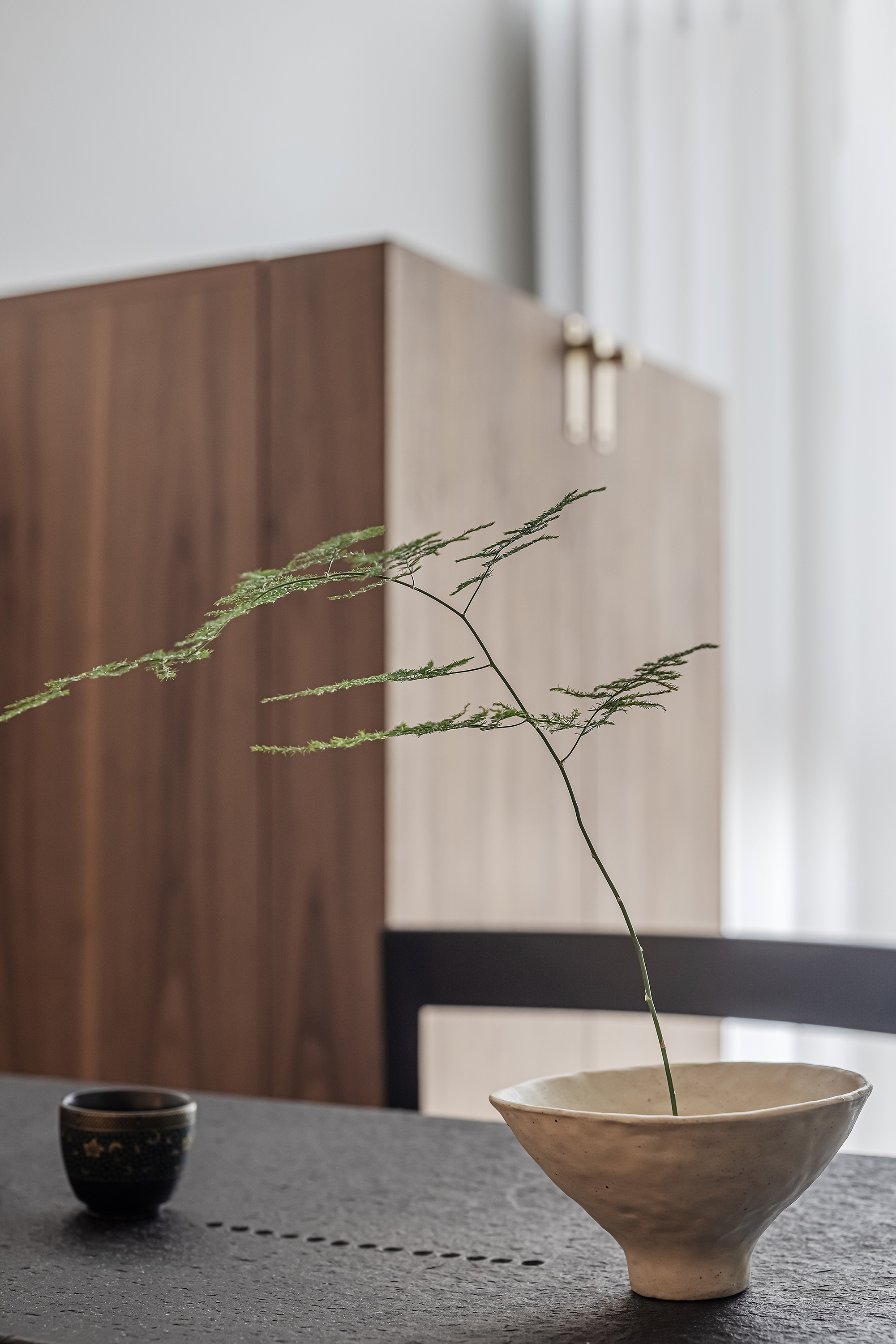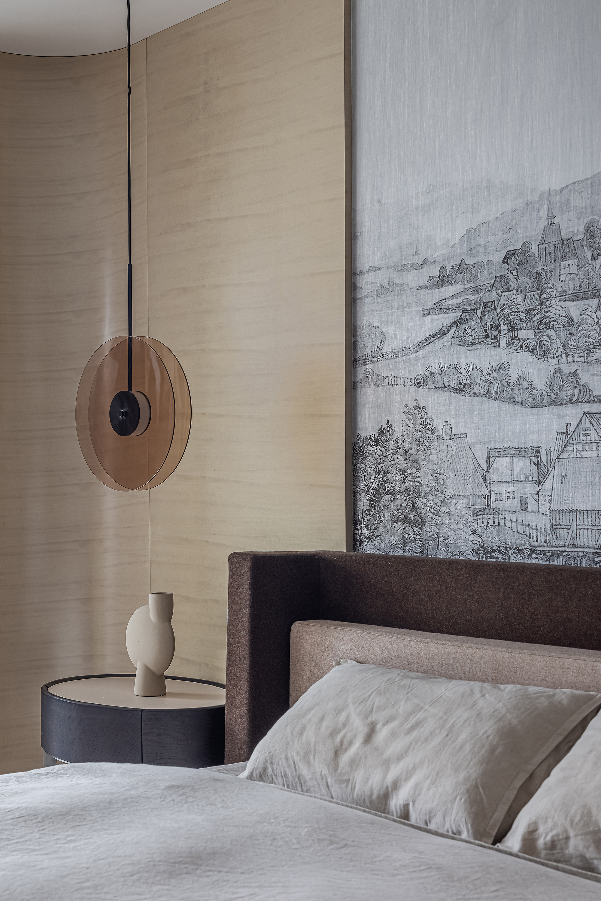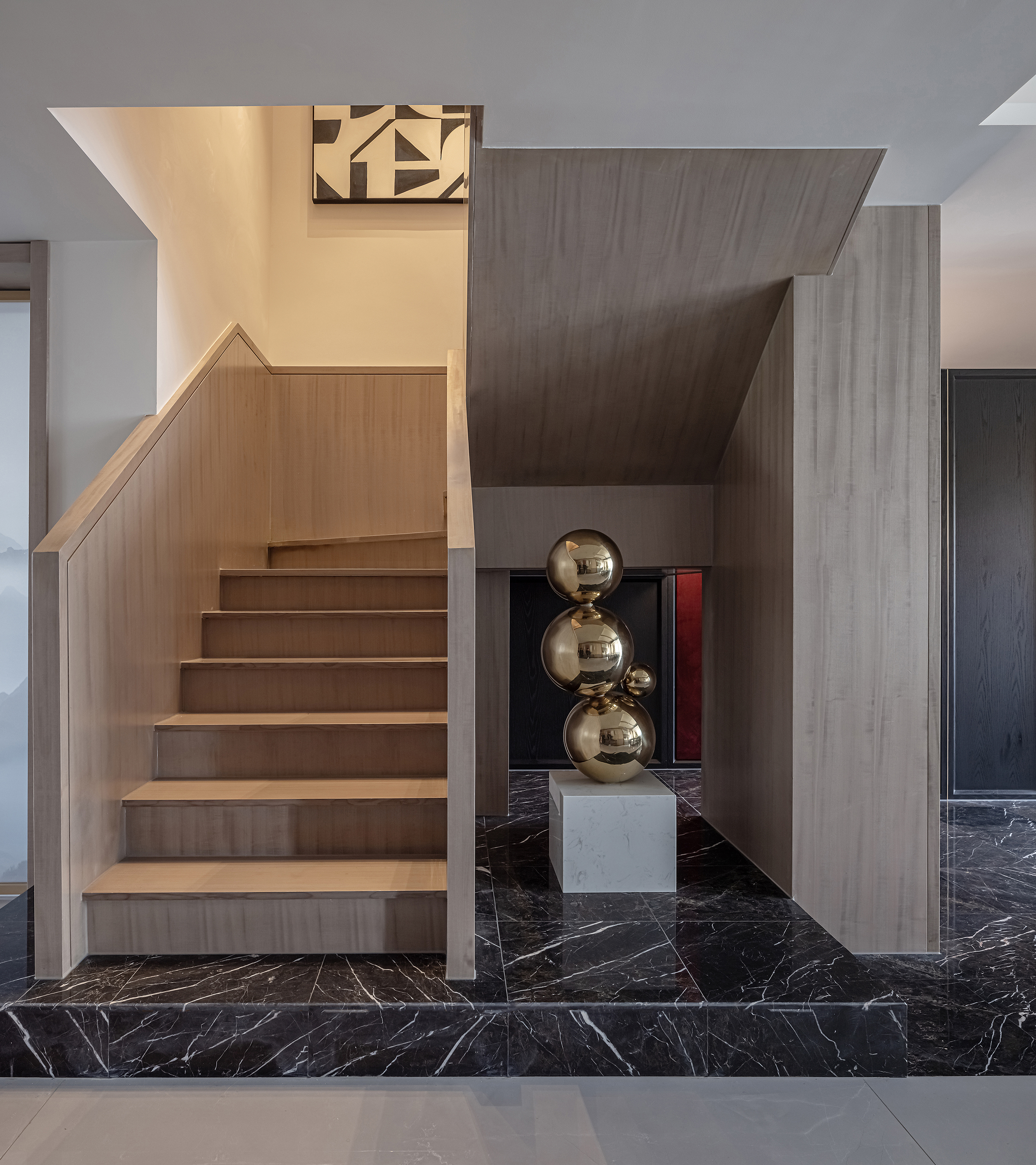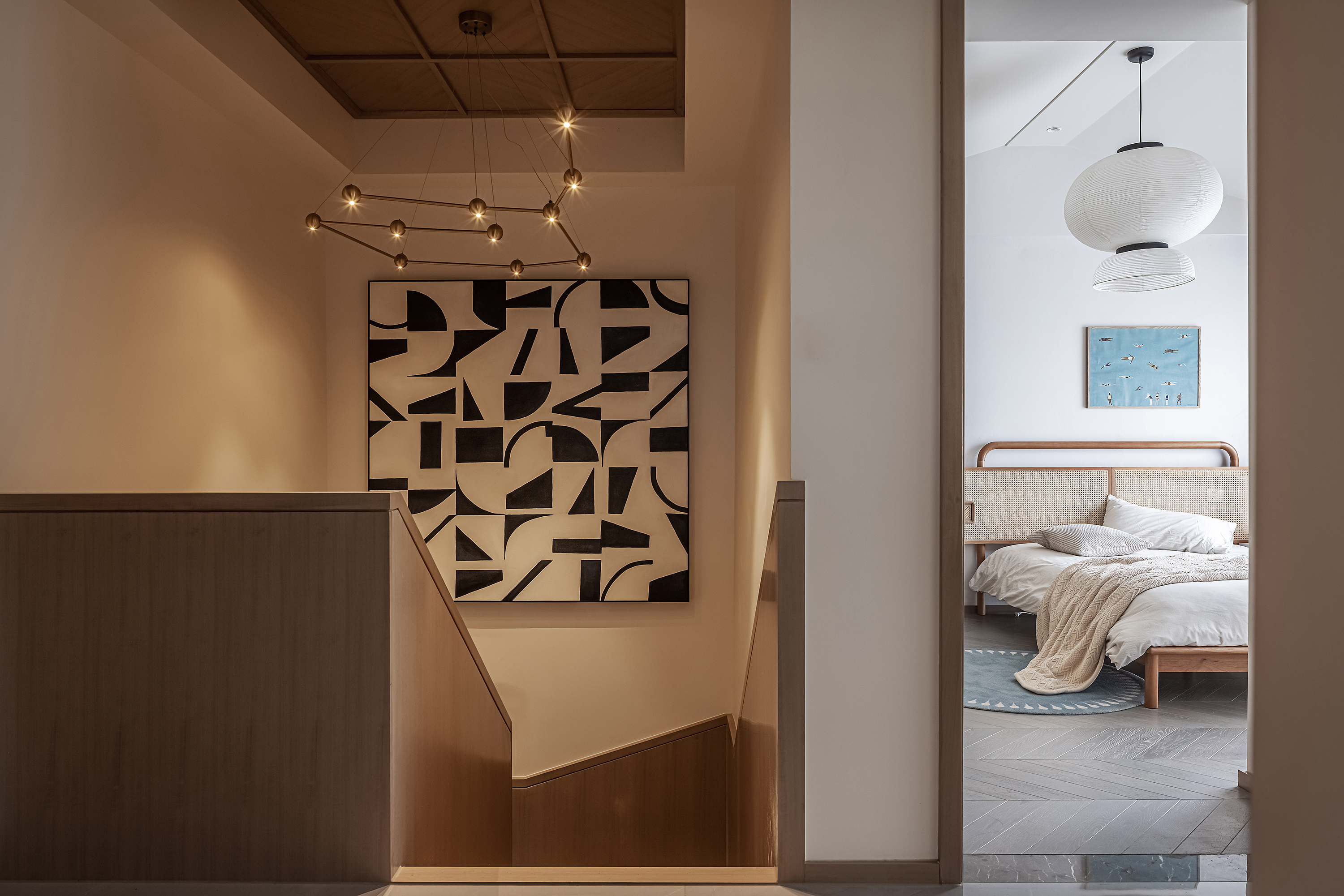 空间意境:本案为复式结构,常住祖孙三代六人,根据业主喜好,整体偏东方韵味,结合居住结构、功能需求,对房屋空间和氛围做设计划分控制,运用木饰面、绒布、素雅色系等元素,让整个空间围绕功能和中式气韵展开,使之达到期望品质而不俗套,满足老中青三代的审美需求。